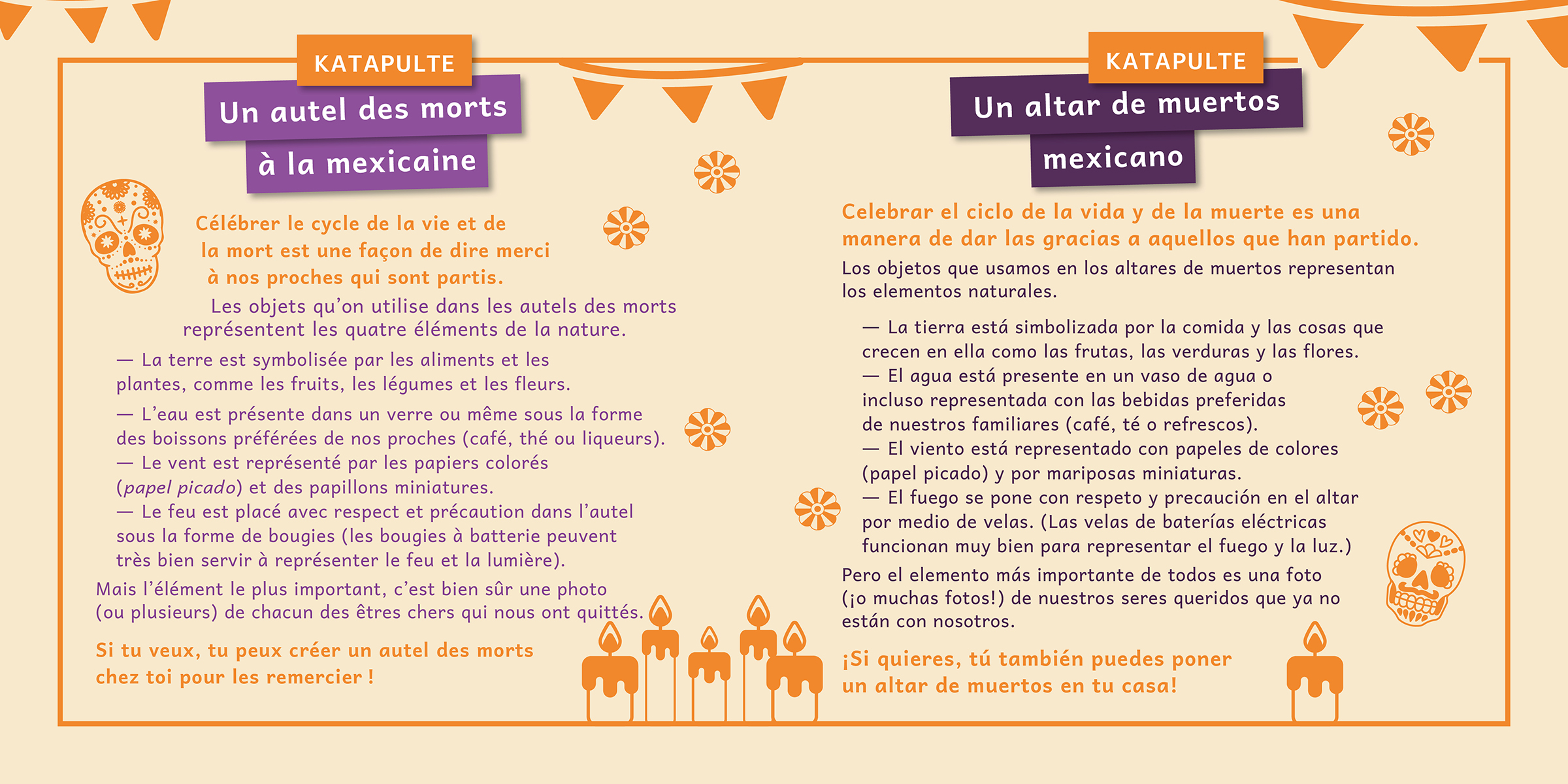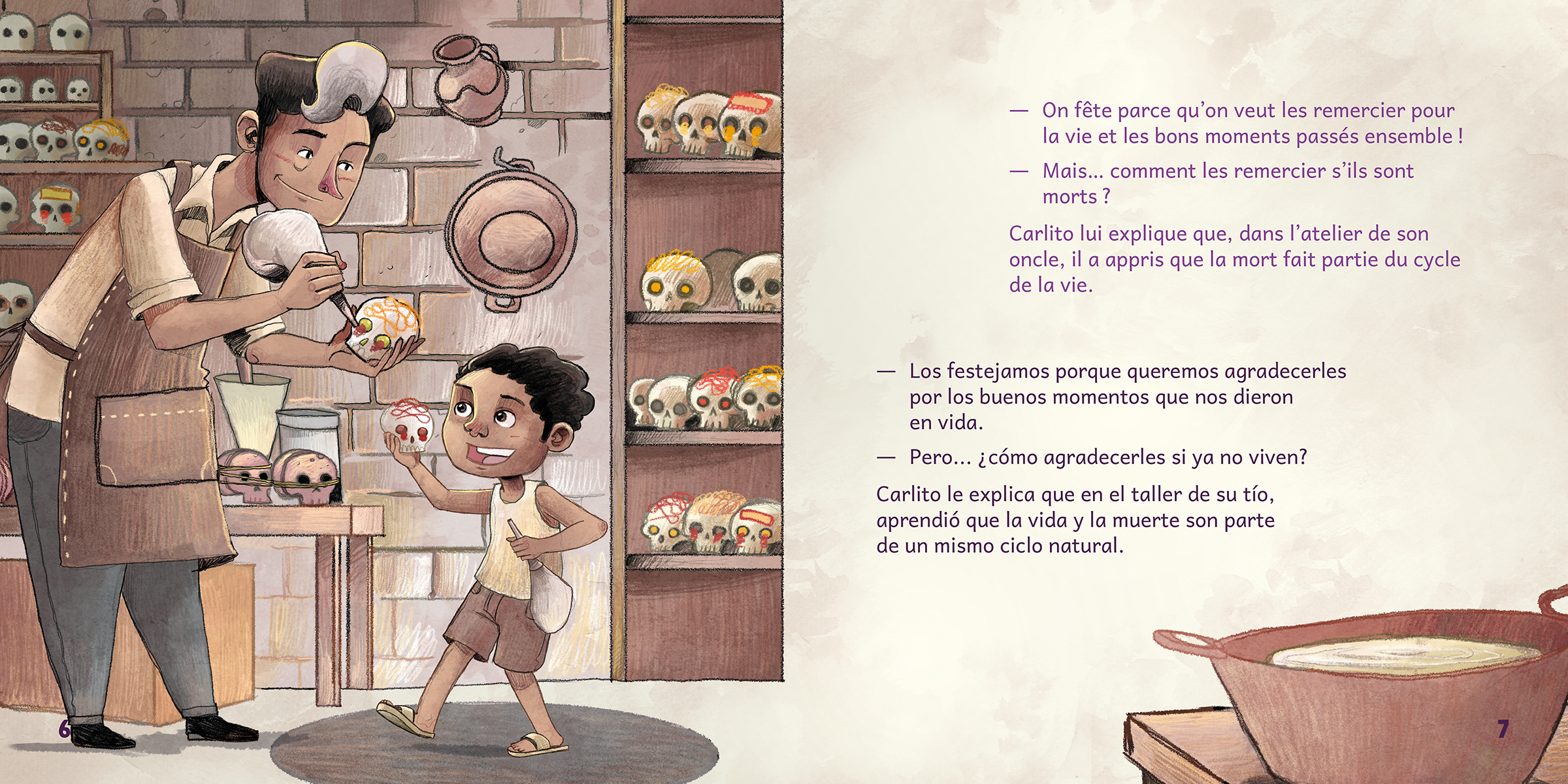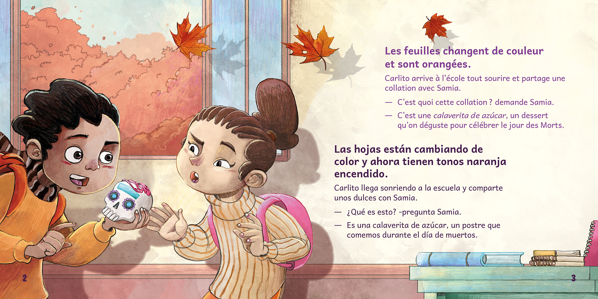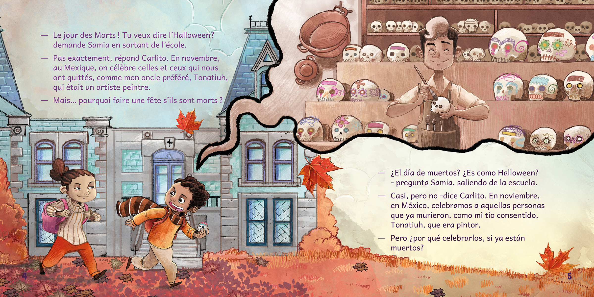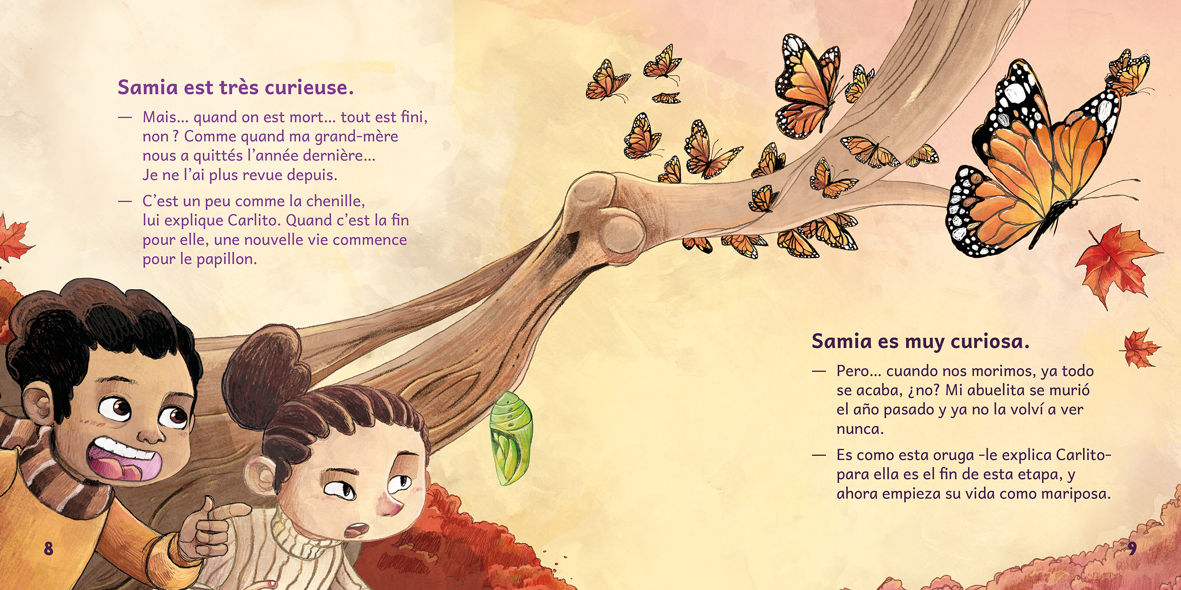 Suite au succès important du premier tome, Le papillon de Carlito 2 / La mariposa de Carlito 2 reprend là où la première histoire termine. Ce conte bilingue franco-espagnol nous transporte au cœur des traditions mexicaines du Jour des morts, vues à travers les yeux curieux et sensibles de Carlito et Samia. Le récit aborde avec beaucoup humour, de joie et de délicatesse les thèmes du deuil, de la mémoire et du cycle de la vie, dans un langage accessible aux jeunes lecteurs. Richement illustré par les illustrations de Augusto Mora, ce livre est ancré dans les célébrations culturelles du Mexique et du Canada. Les lecteurs découvriront comment créer un autel de morts, symbole de gratitude envers les êtres chers disparus et comment la mort prend différent sens dans chaque culture.