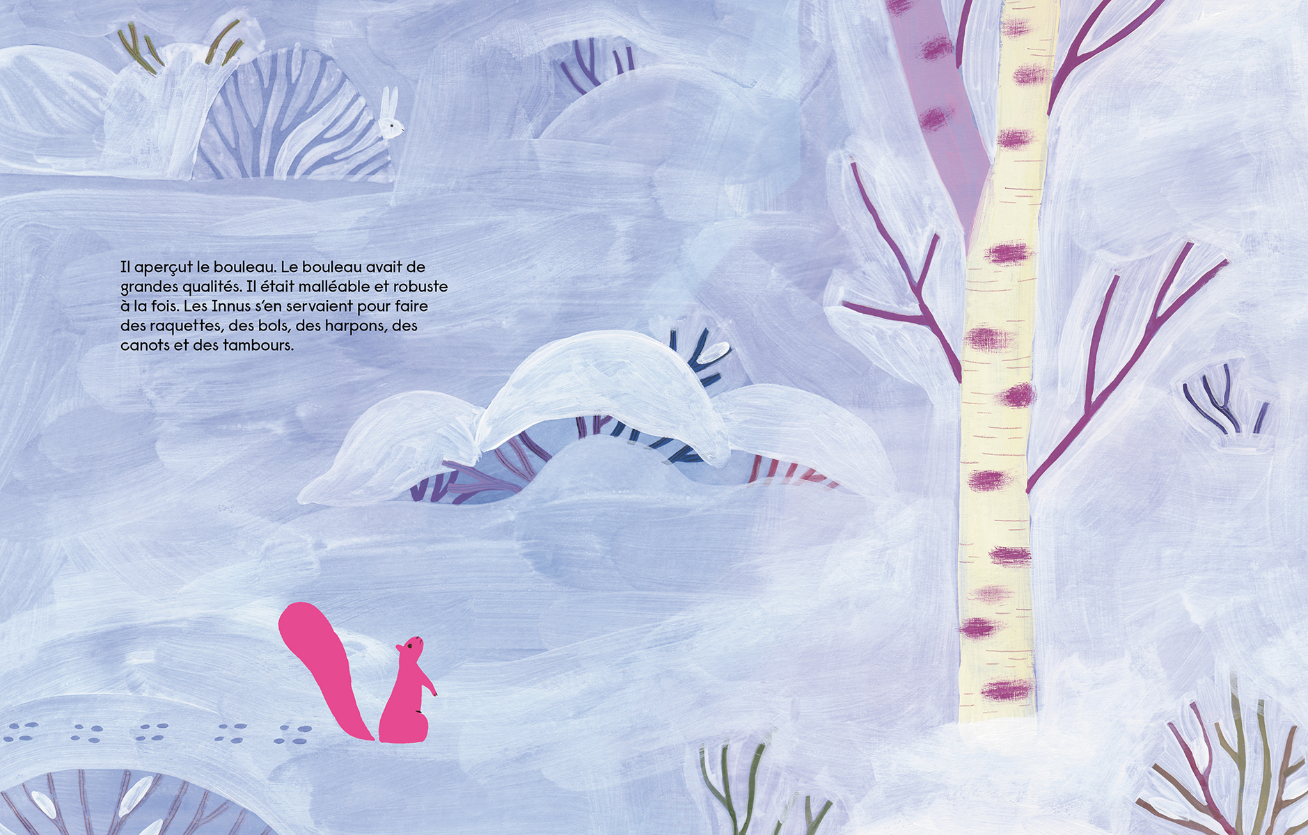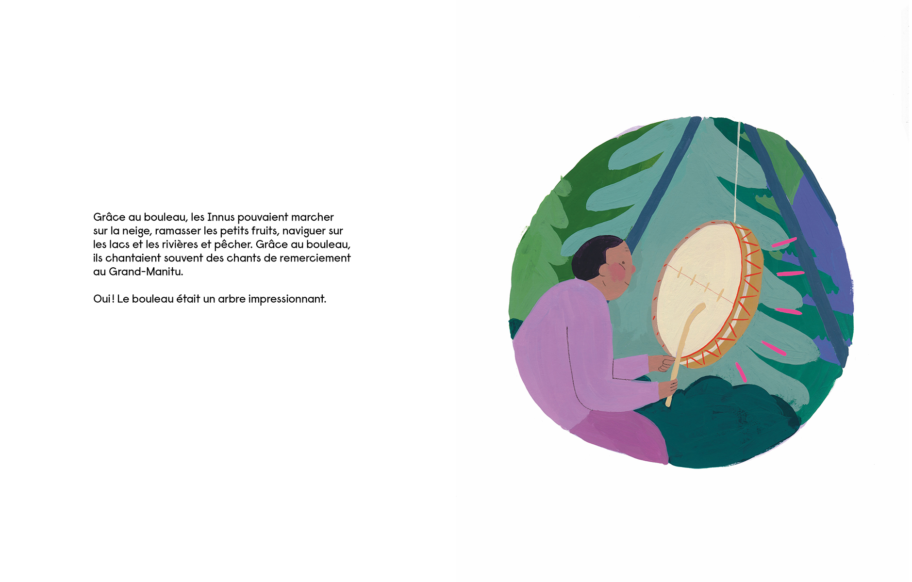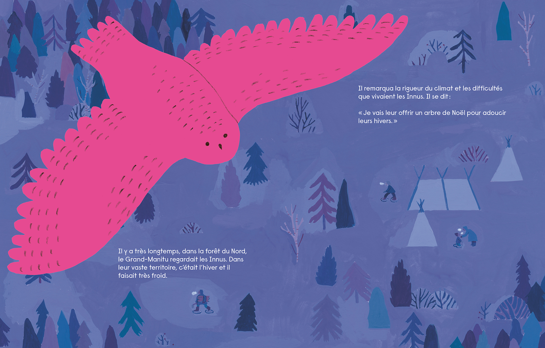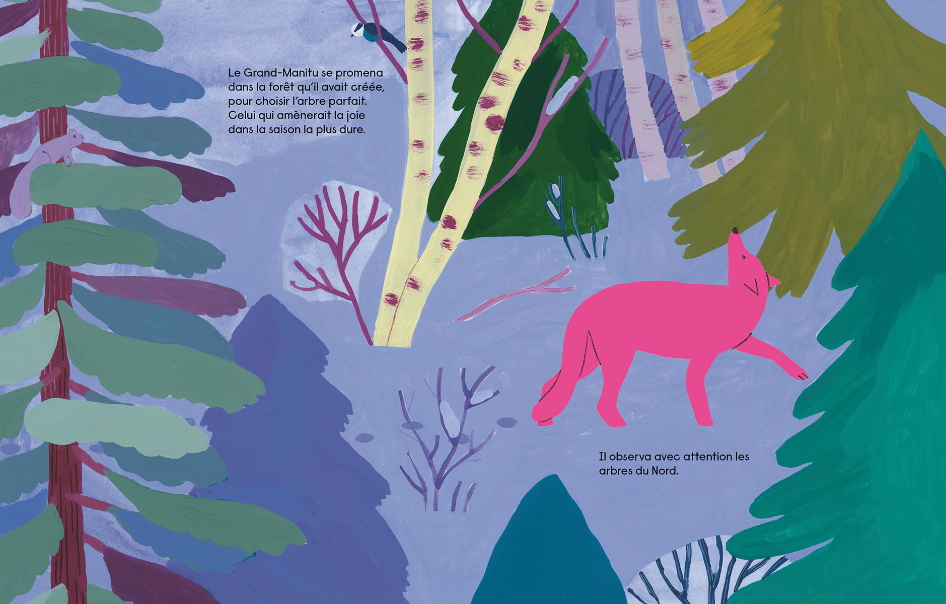 Il fait très froid dans le Grand Nord. L’hiver est difficile pour les Innus. Parmi les arbres de la forêt, le Grand-Manitu, grand esprit du bien, cherche celui qui apportera de la joie à tous. Serait-ce le mélèze, avec lequel les Innus fabriquent des traîneaux, des arcs ou des onguents ? Le bouleau, malléable et robuste ? Ou encore la magnifique épinette noire ? « Veux-tu devenir l’arbre de Noël ? », demande-t-il à chacun. Mais l’un après l’autre, les arbres déclinent son offre. Tous… sauf un, que le Grand-Manitu avait d’abord ignoré…