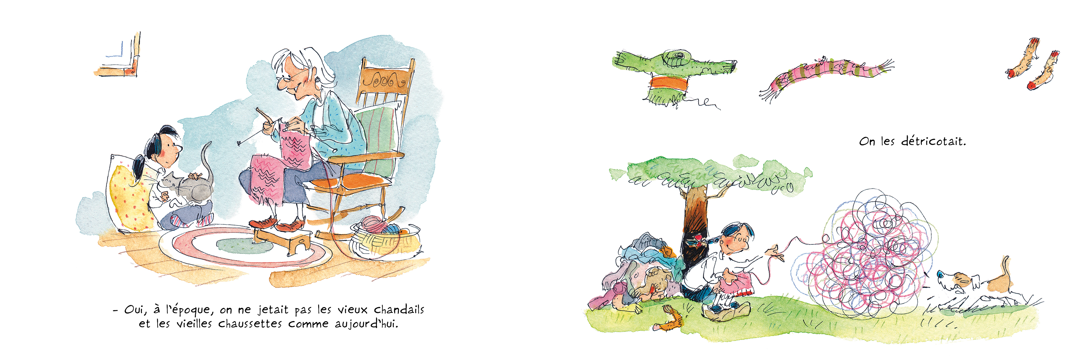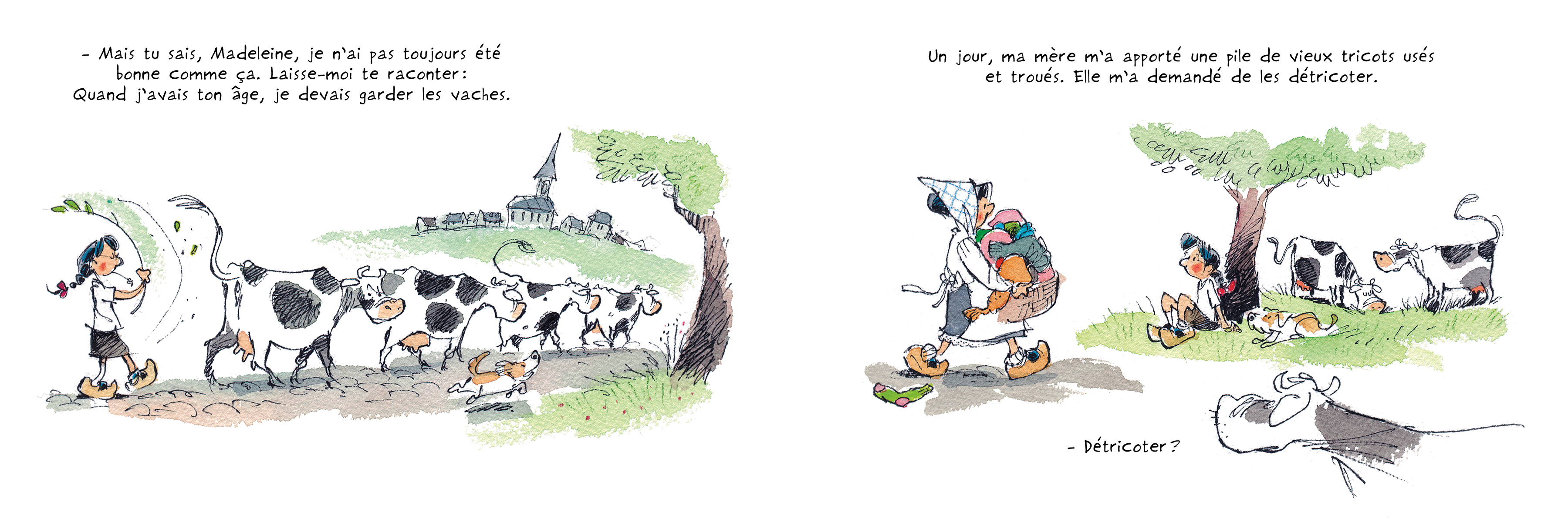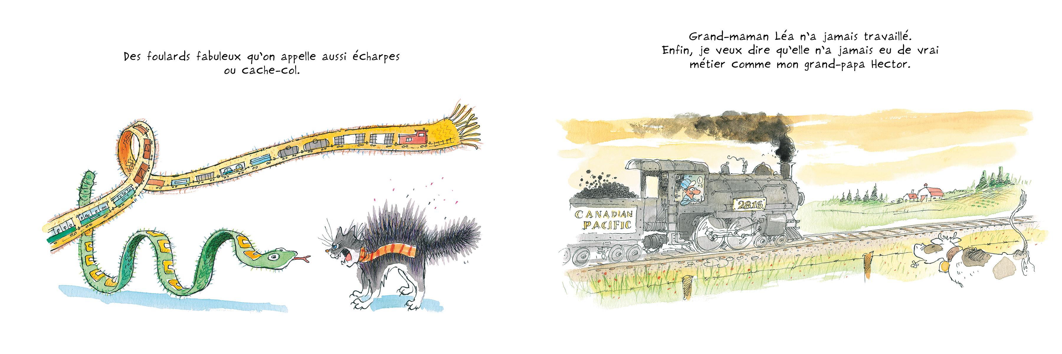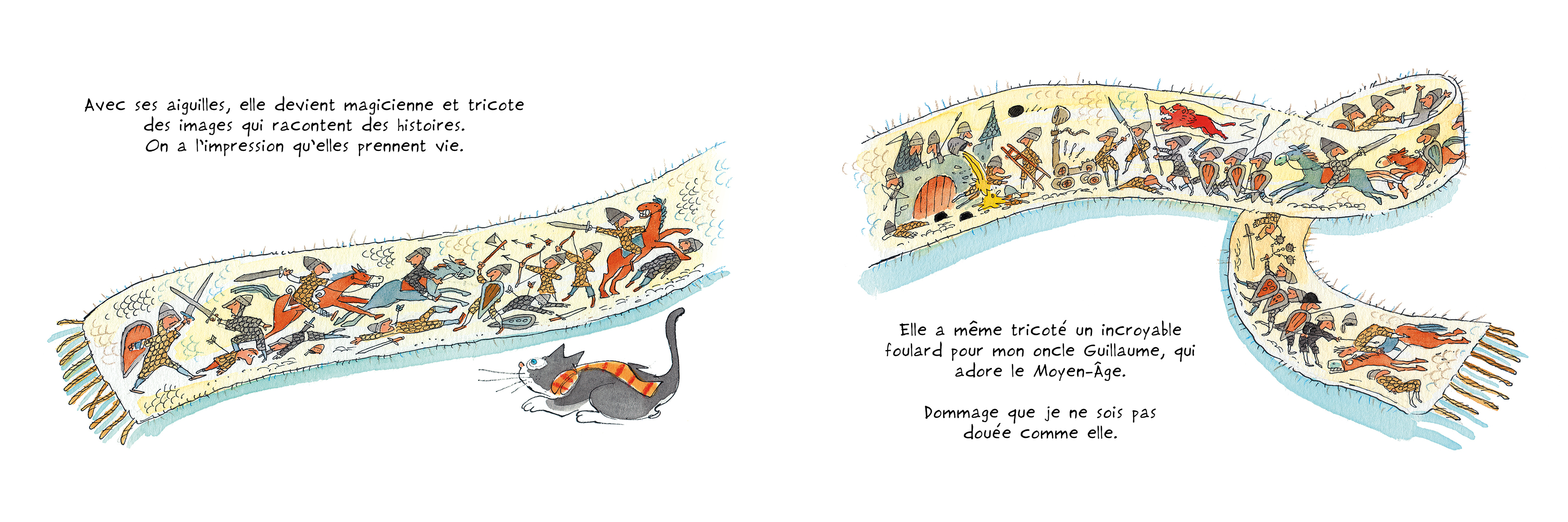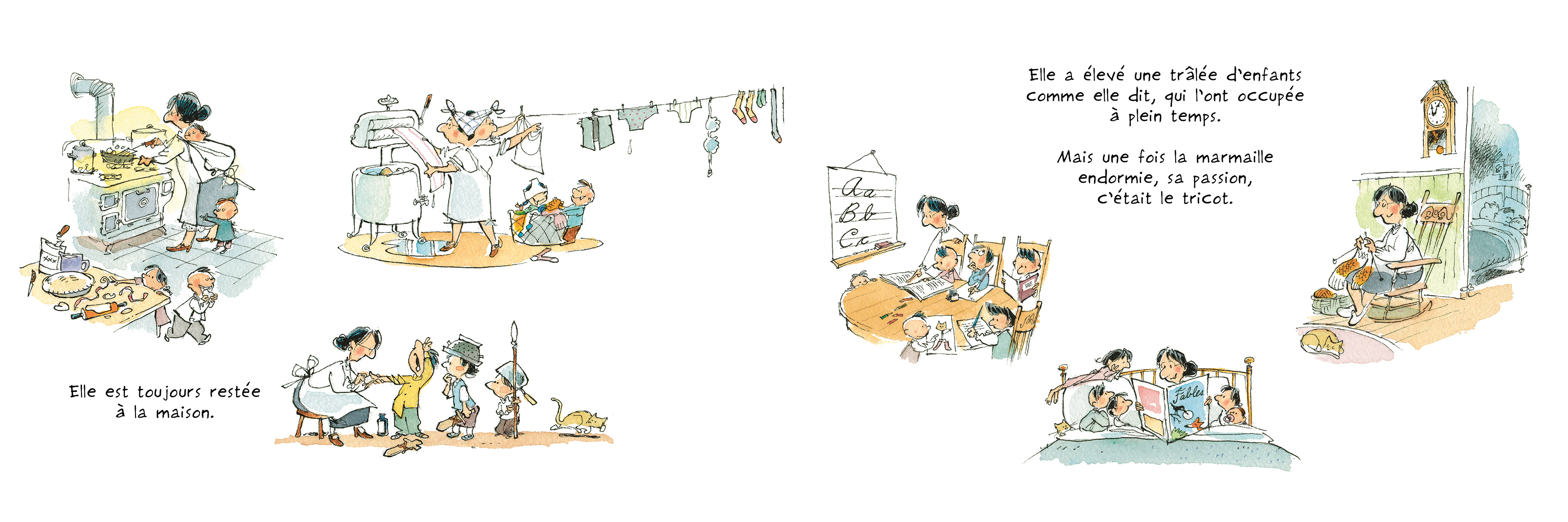 Depuis qu’elle est petite, la grand-maman de Madeleine tricote. Elle a fabriqué des foulards pour son frère parti à la guerre, des bas pour conserver les orteils au chaud de ceux qu’elle aime et aussi des mitaines, des tuques et des bonnets. Mais l’ouvrage dont elle est le plus fière est son tout premier foulard, qu’elle offre à Madeleine. Ravie, la fillette l’enroule autour de son cou avant de partir pour l’école sans remarquer qu’un brin de laine s’est accroché à la porte de la maison…