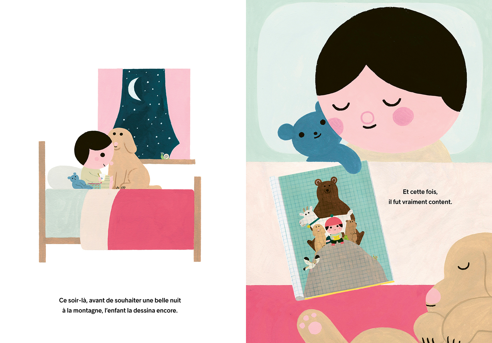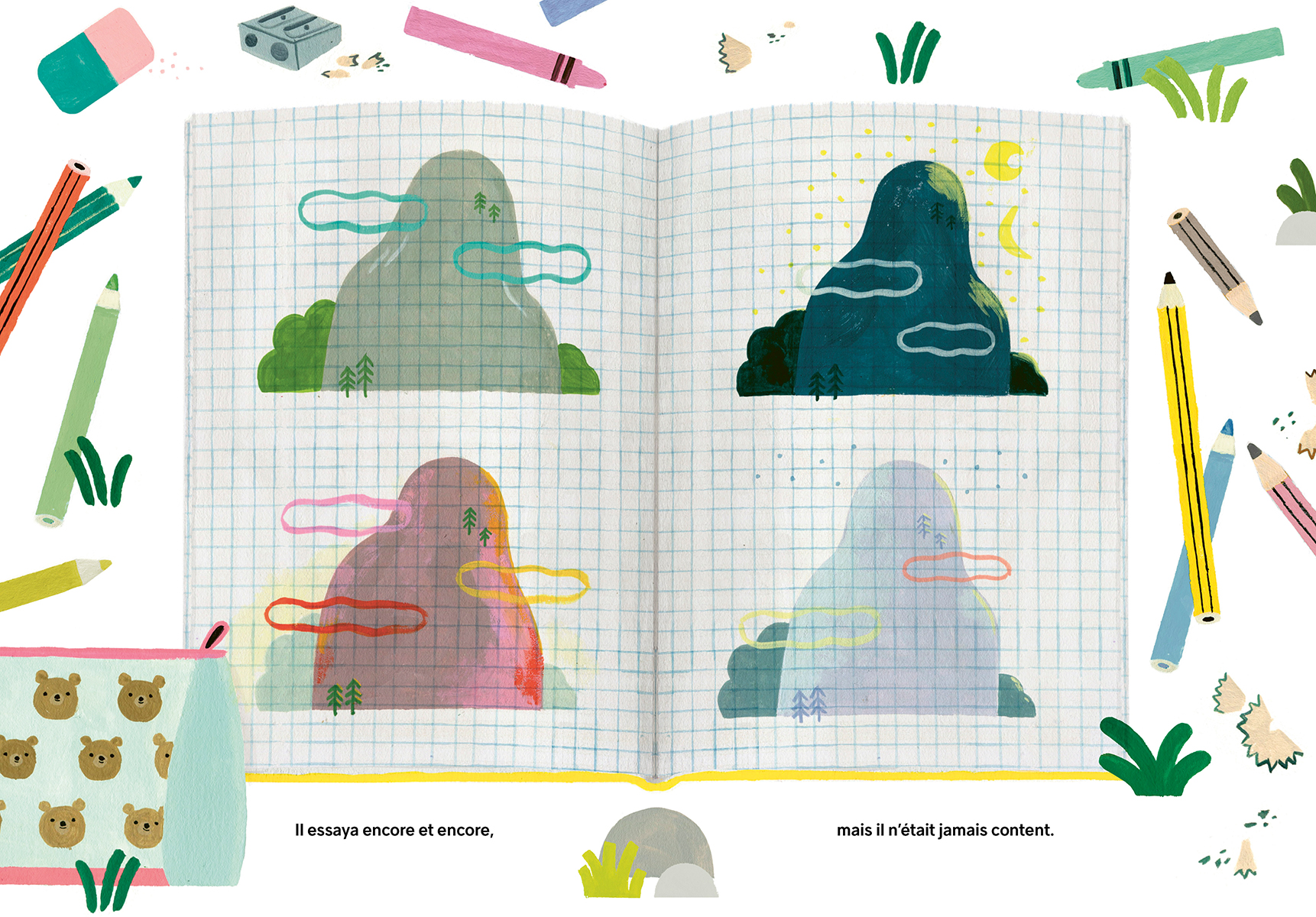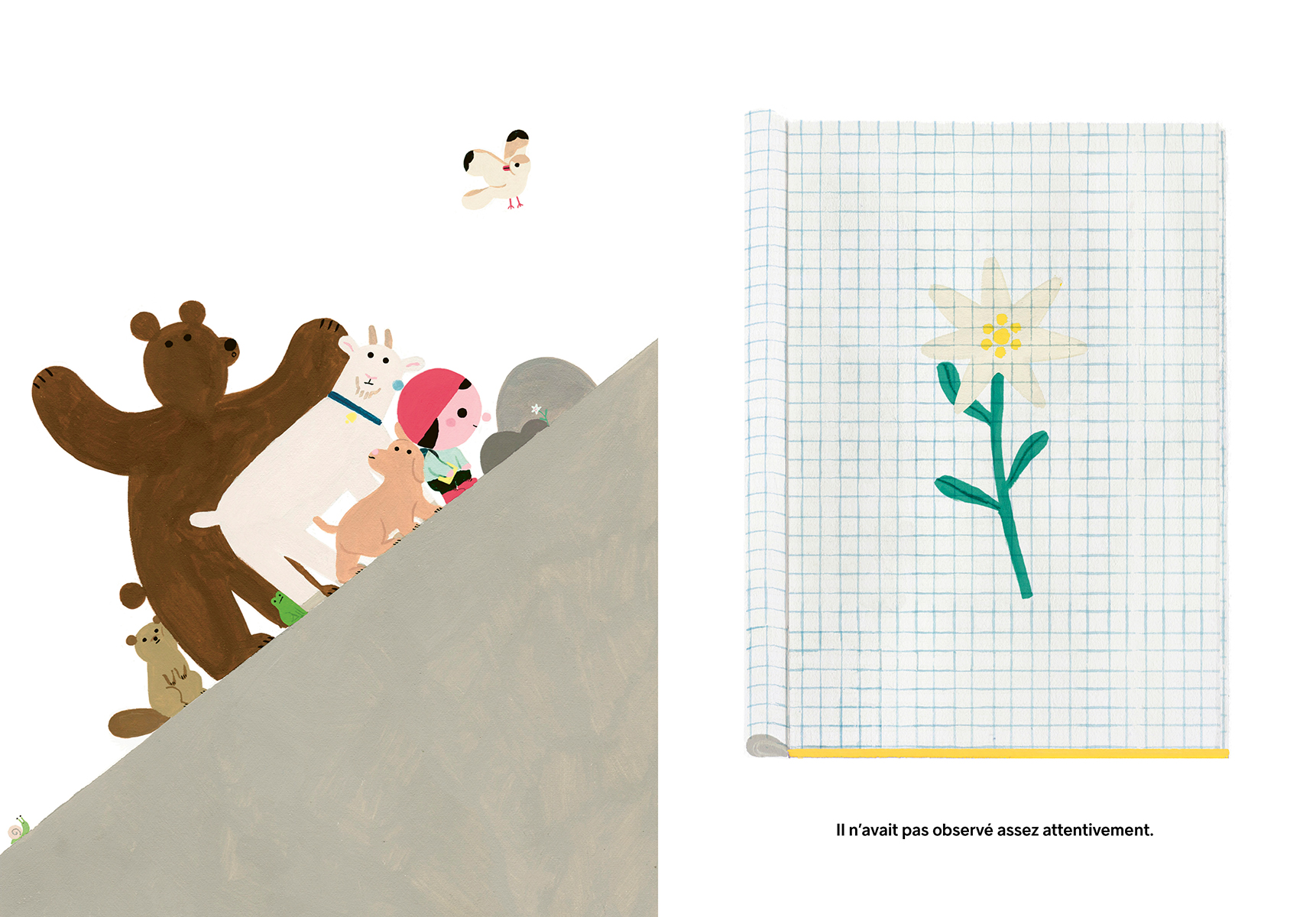 Il était une fois un enfant qui, chaque jour, contemplait une montagne. Un matin, l’enfant eut l’idée de la dessiner. Il essaya encore et encore, mais il manquait toujours quelque chose. Une fois son dessin terminé, ça n’y ressemblait pas beaucoup. Alors il décida d’aller voir de plus près…