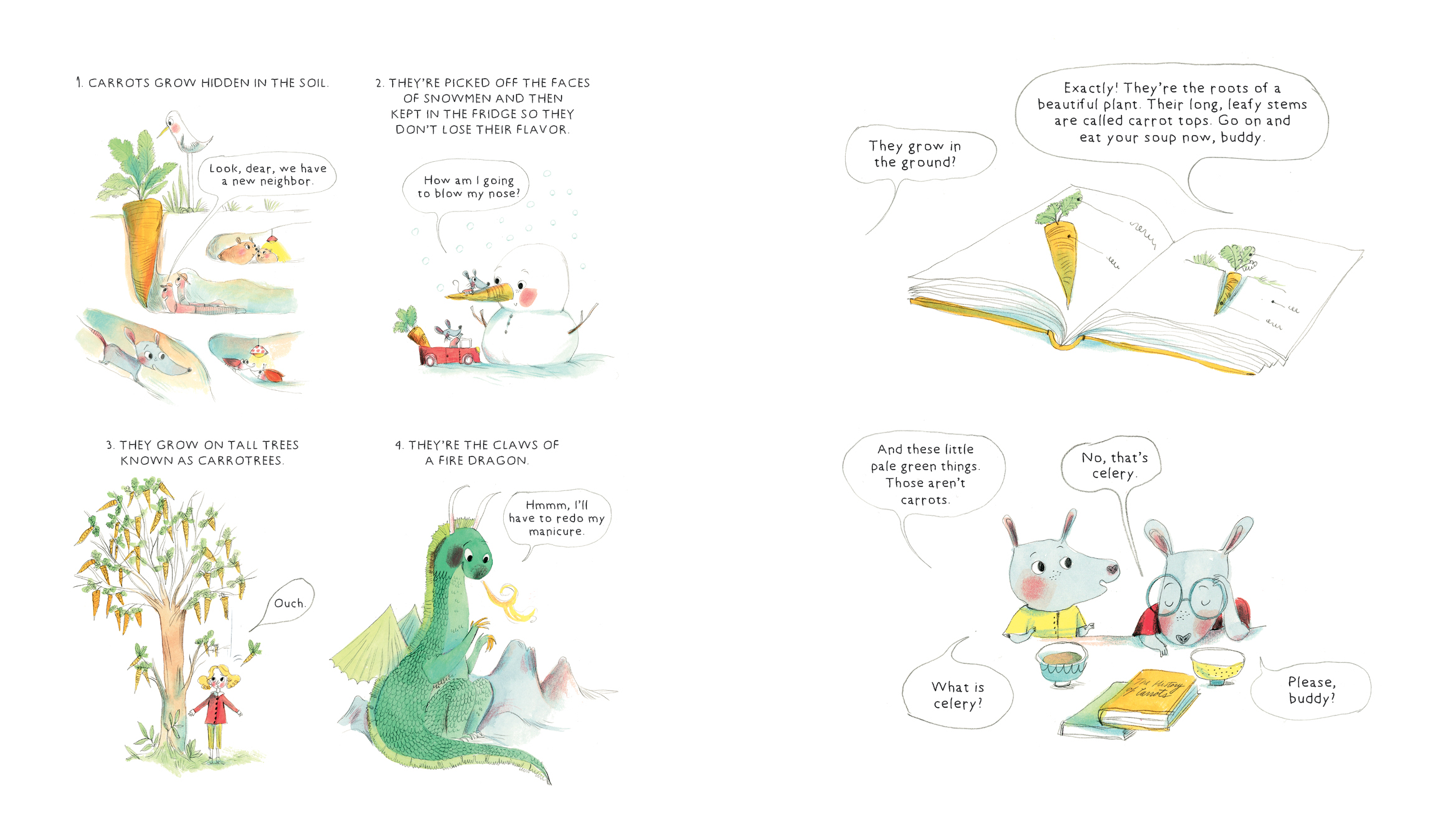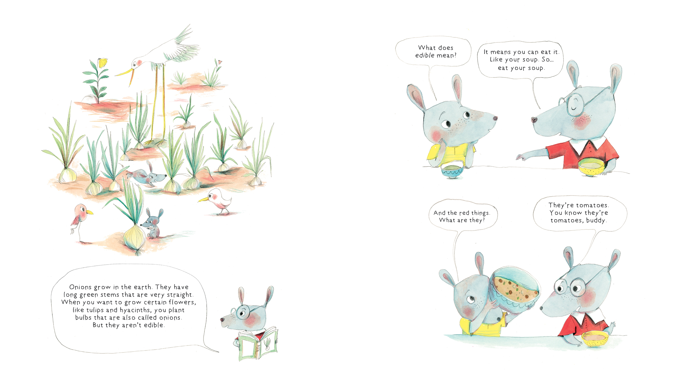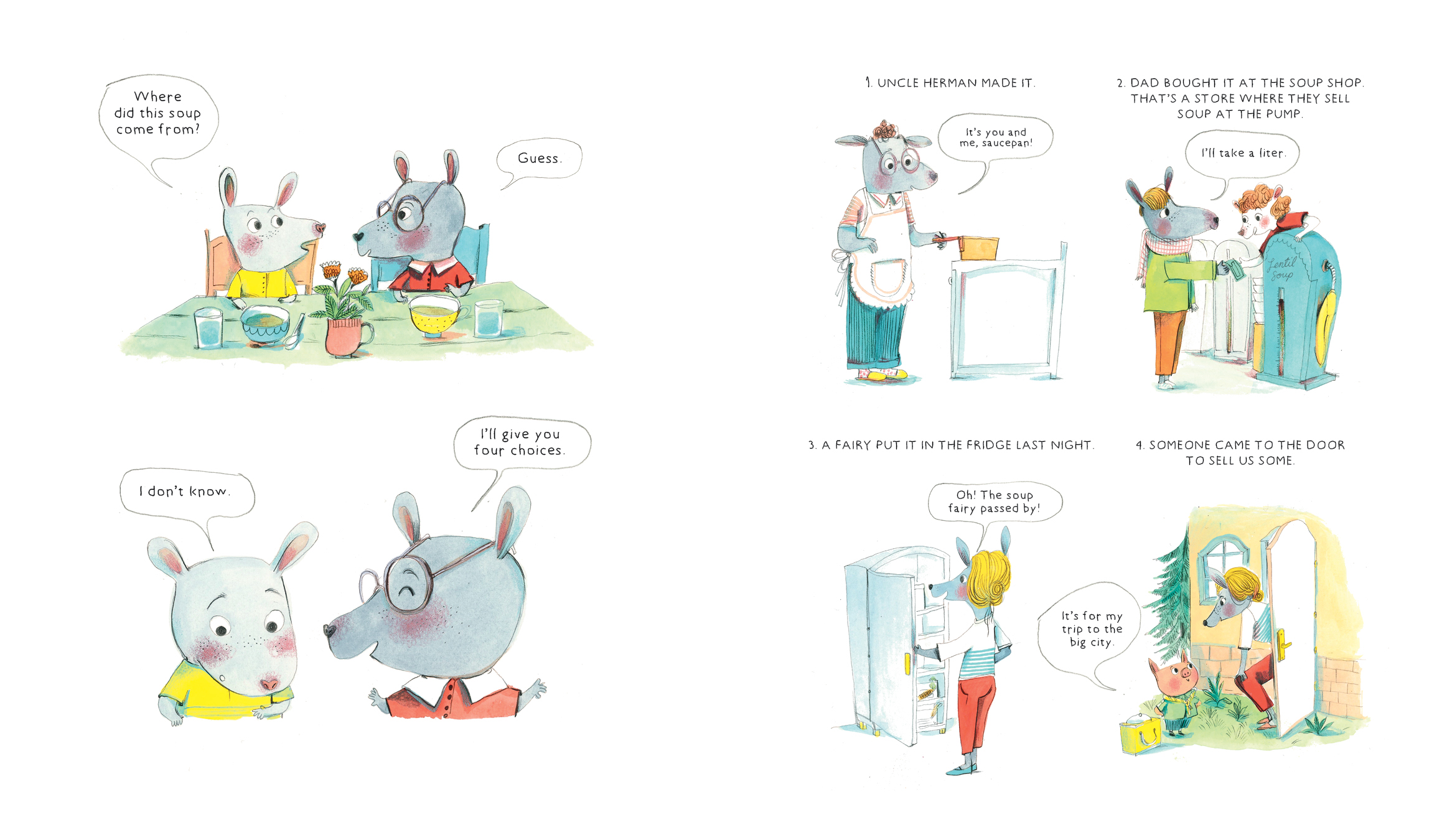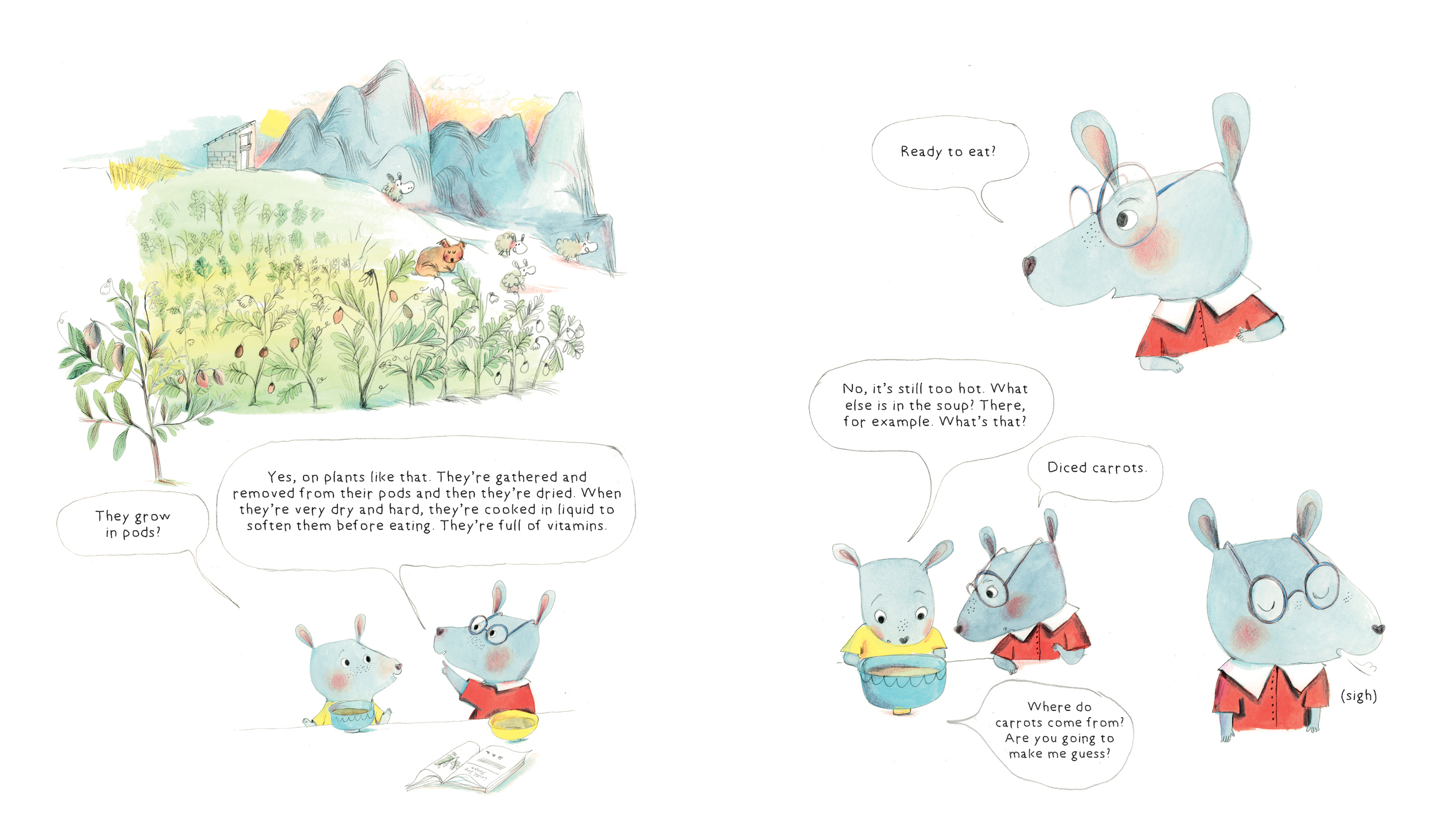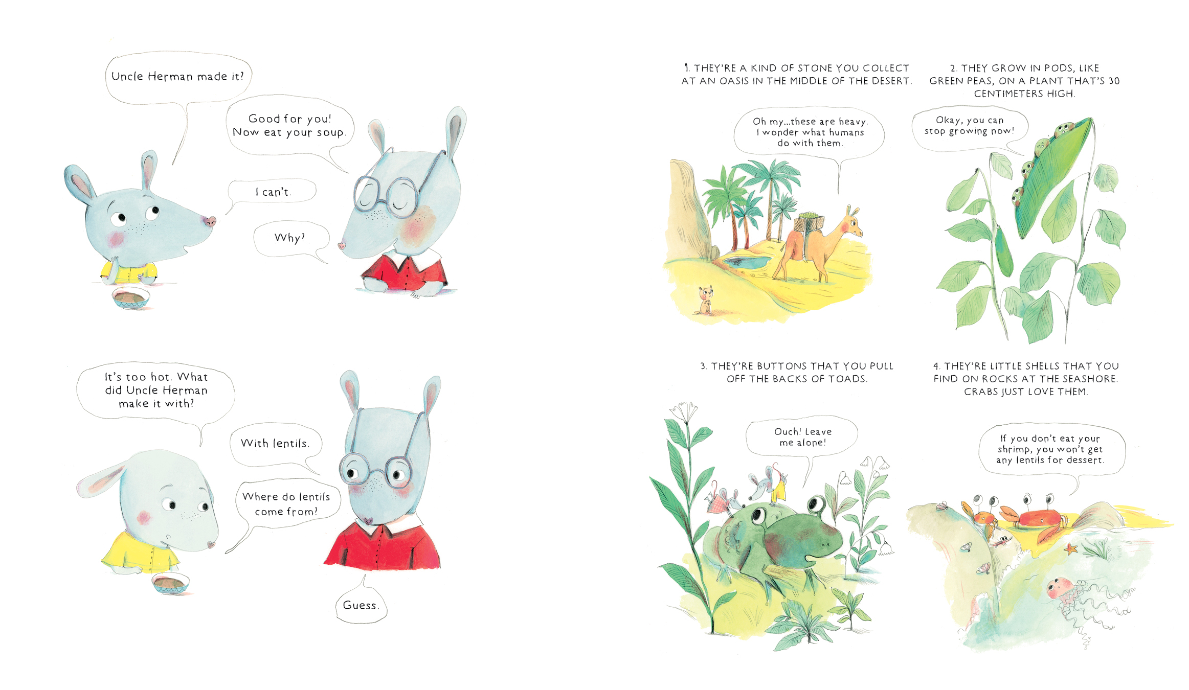 When a younger brother decides his soup is too hot to eat, he starts peppering his older brother with questions: Where do lentils come from? What are those white things? Why is it called celery? One question leads to another and another and another, and the older brother answers them all with humor and dwindling patience. Through questions, jokes and riddles, we learn about lentils, tomatoes, salt, pepper and everything else we need to make a good lentil soup, including a recipe for readers to make it themselves.