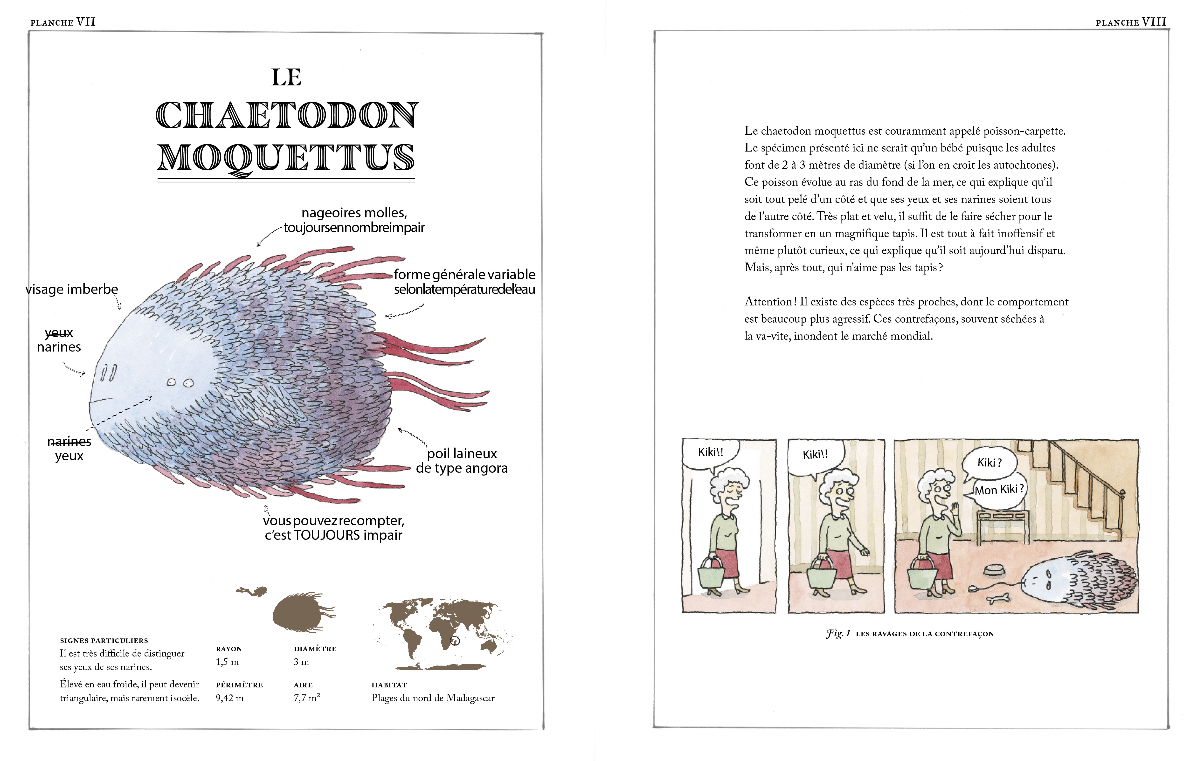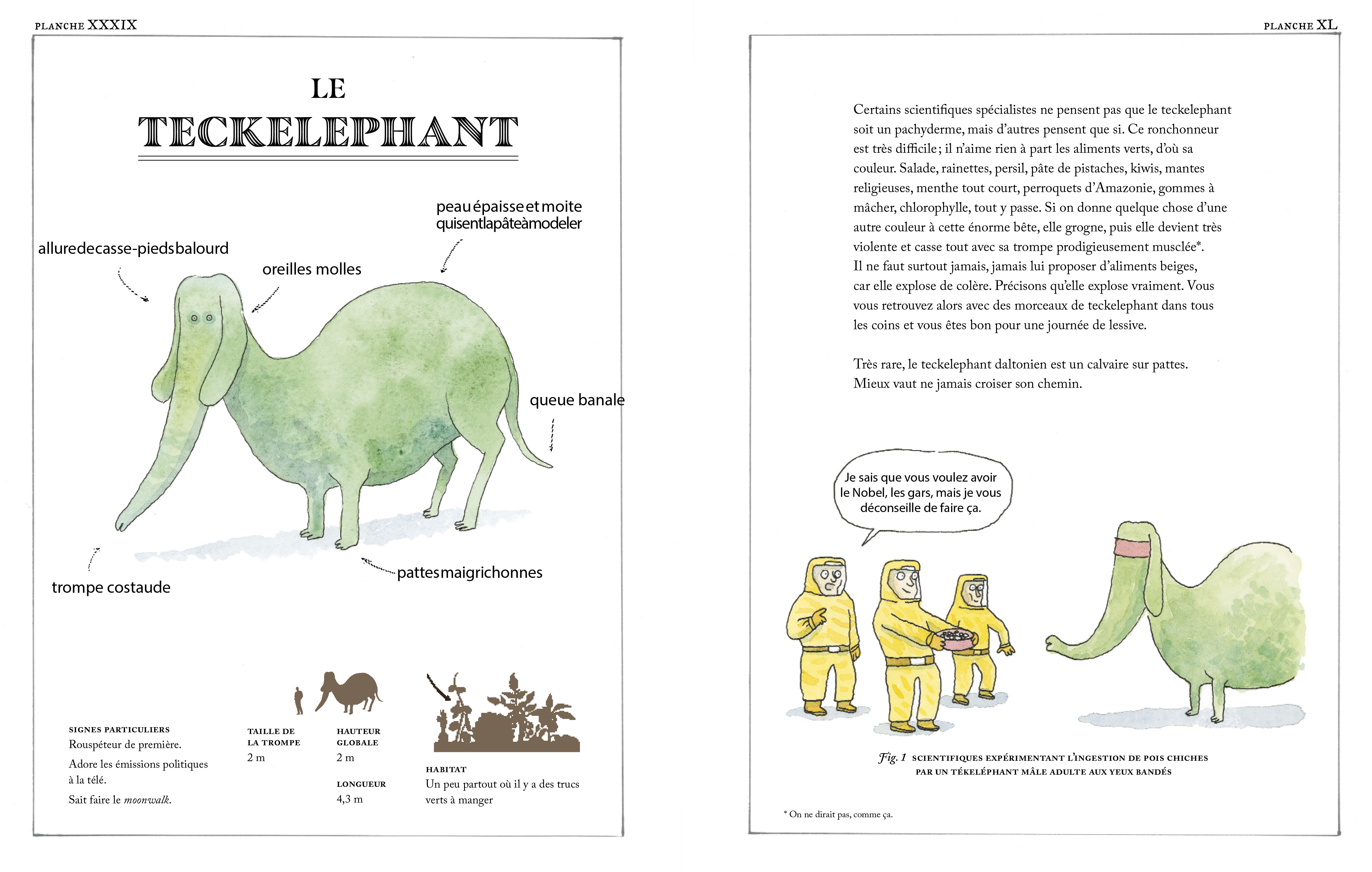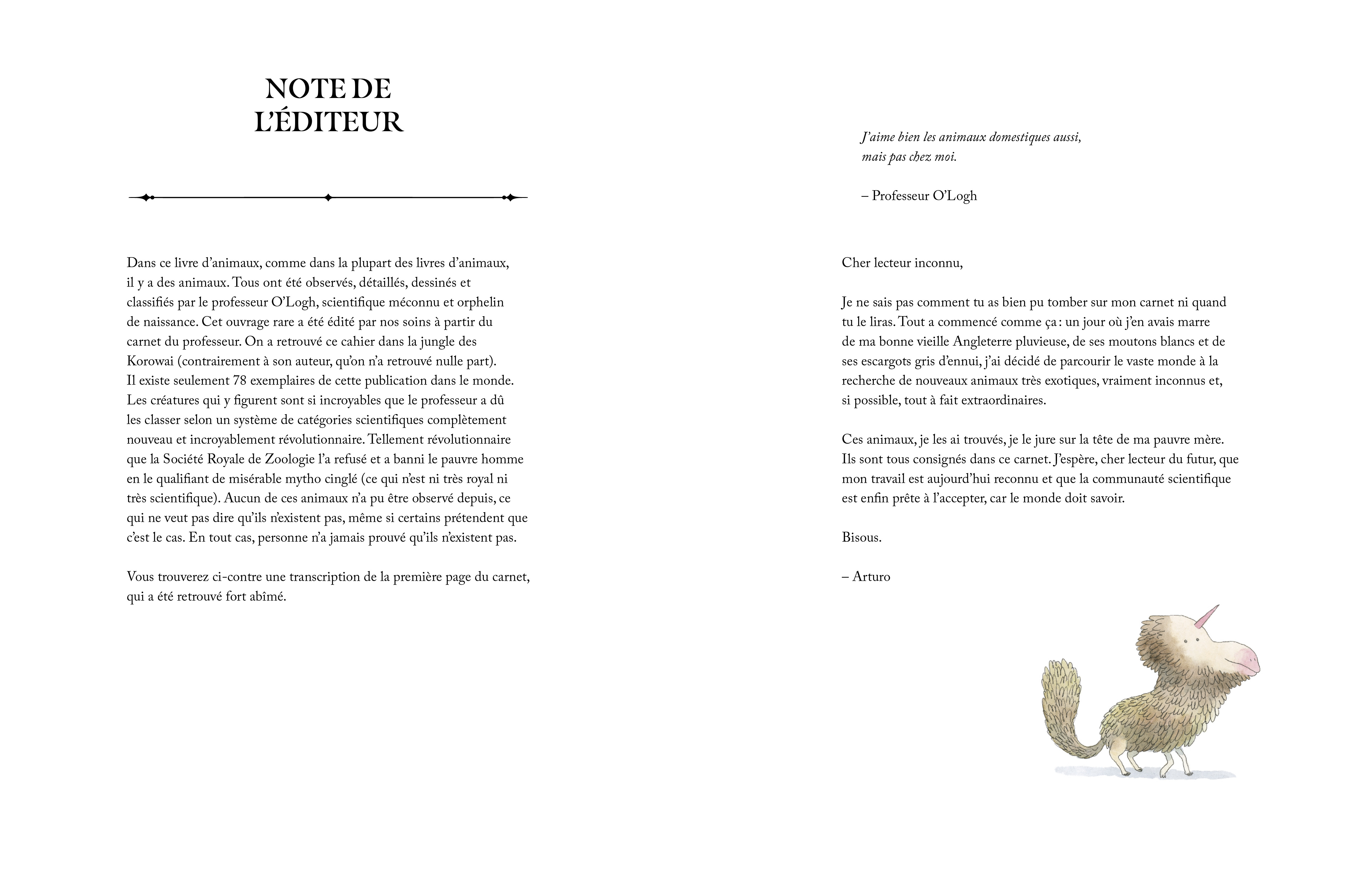Dans ce livre d’animaux, comme dans la plupart des livres d’animaux, il y a des animaux. Tous ont été observés, détaillés, dessinés et classifiés par le grand professeur O’Logh, scientifique méconnu et orphelin de naissance. Aucun de ces animaux n’a pu être observé par d’autres biologistes, ce qui ne veut pas dire qu’ils n’existent pas, même si certains prétendent que c’est le cas. En tout cas, personne n’a jamais prouvé qu’ils n’existent pas.