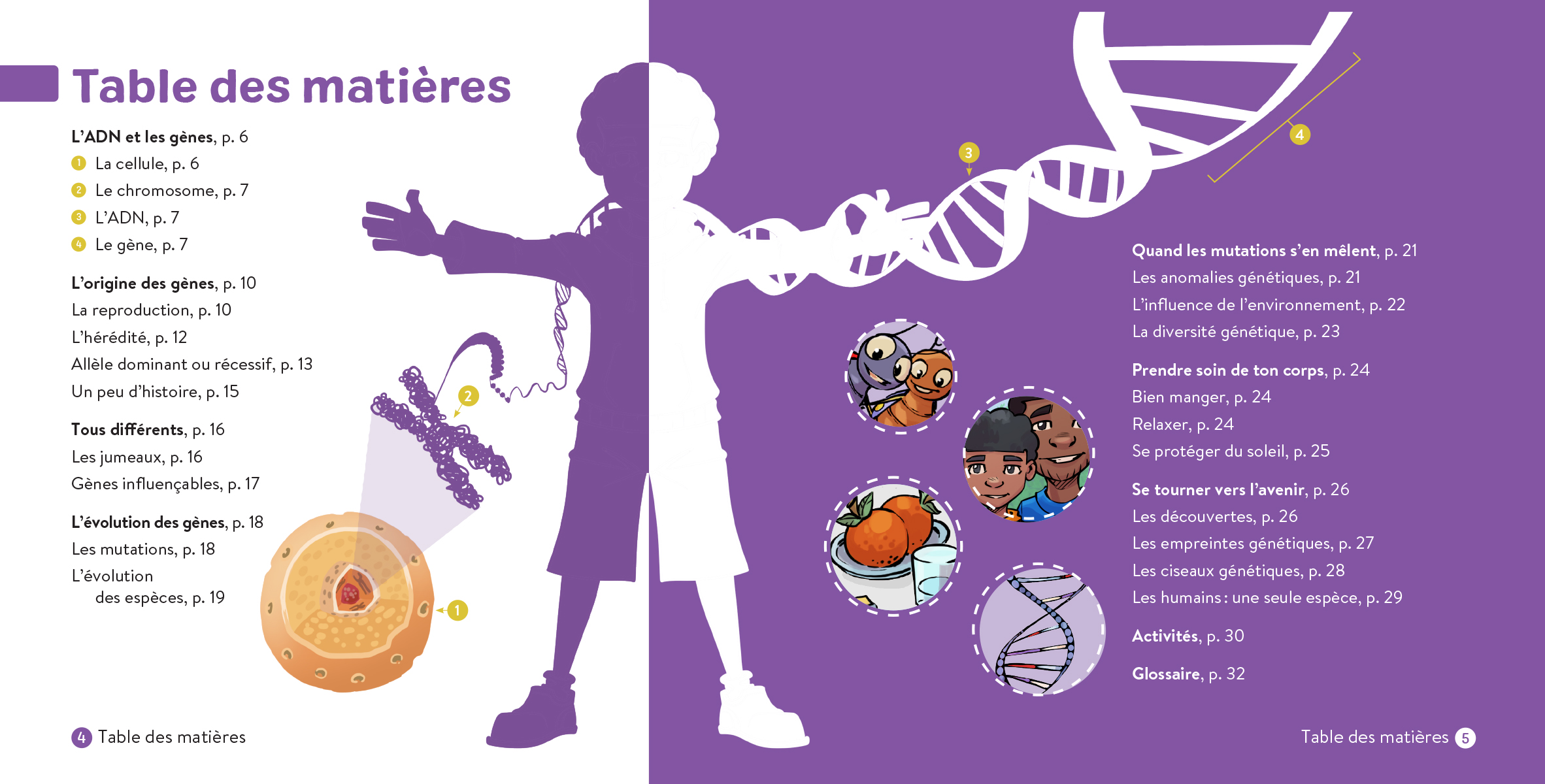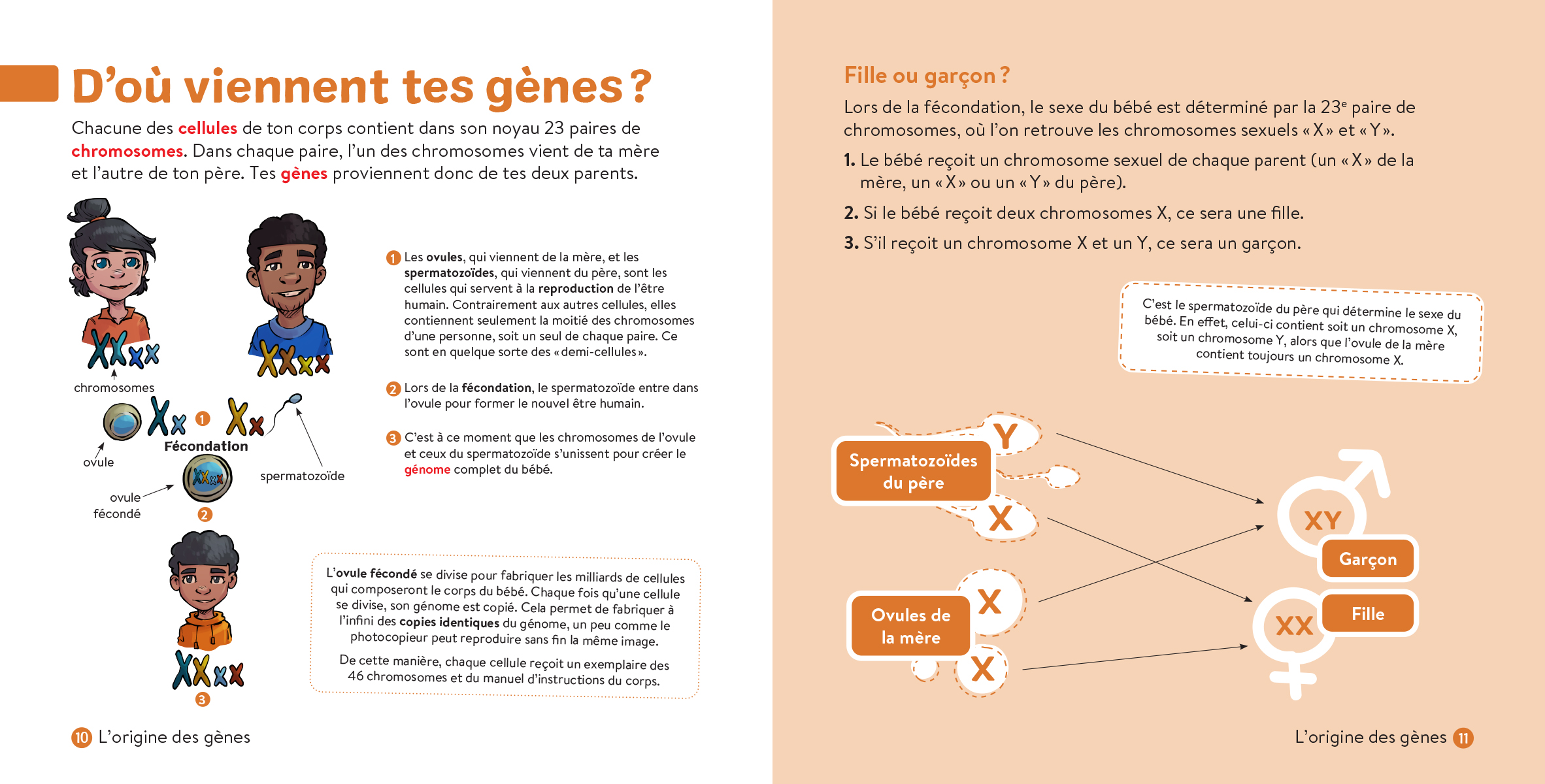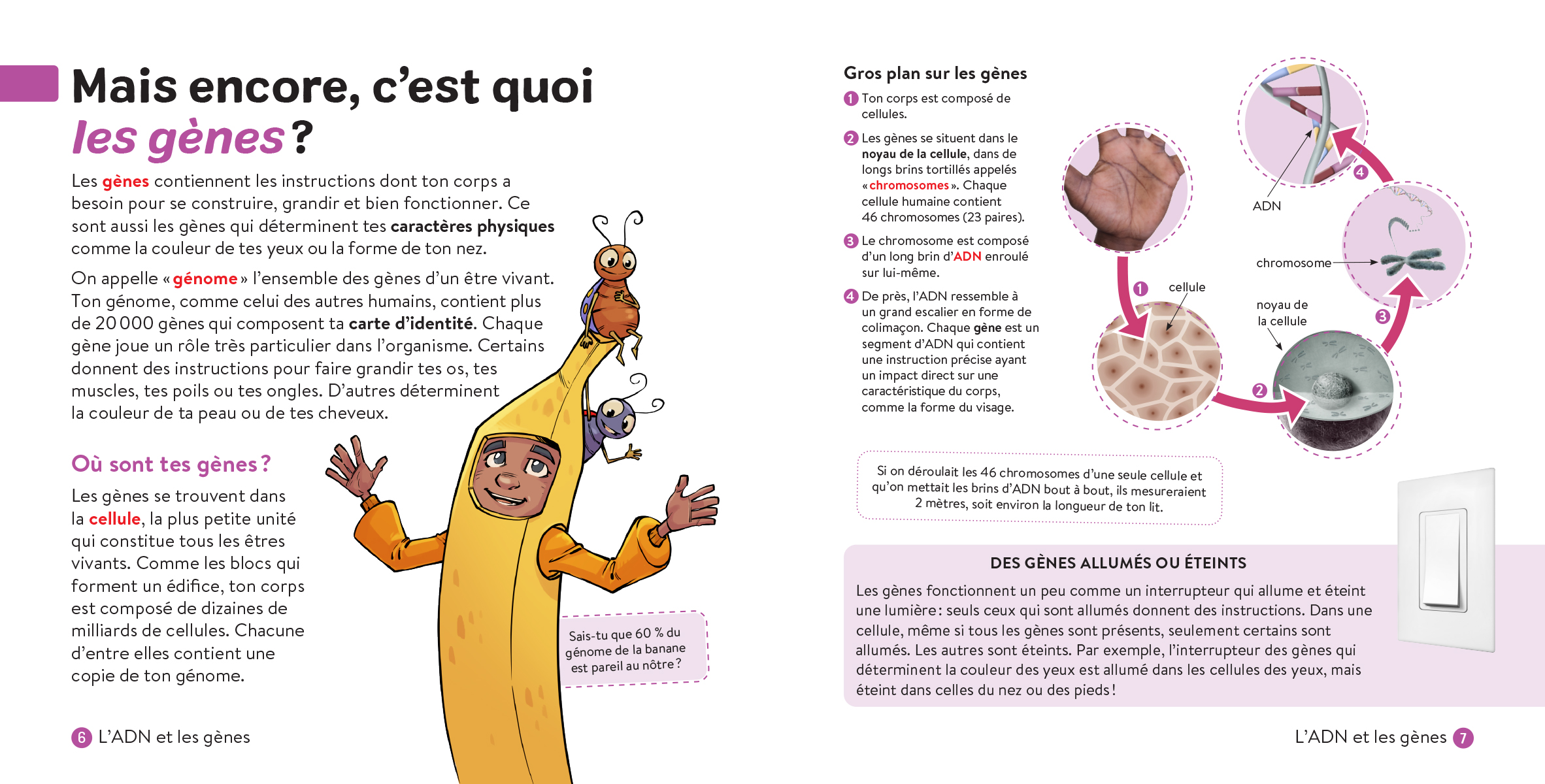 LES GÈNES forment le manuel d’instructions de notre corps. Ils contiennent les directives dont l’organisme a besoin pour bien fonctionner, en plus de déterminer nos traits physiques. Mais où sont nos gènes? D’où viennent-ils? Parsemée d’illustrations ludiques, voici une série qui répond aux nombreuses questions que se posent les enfants sur leur corps.