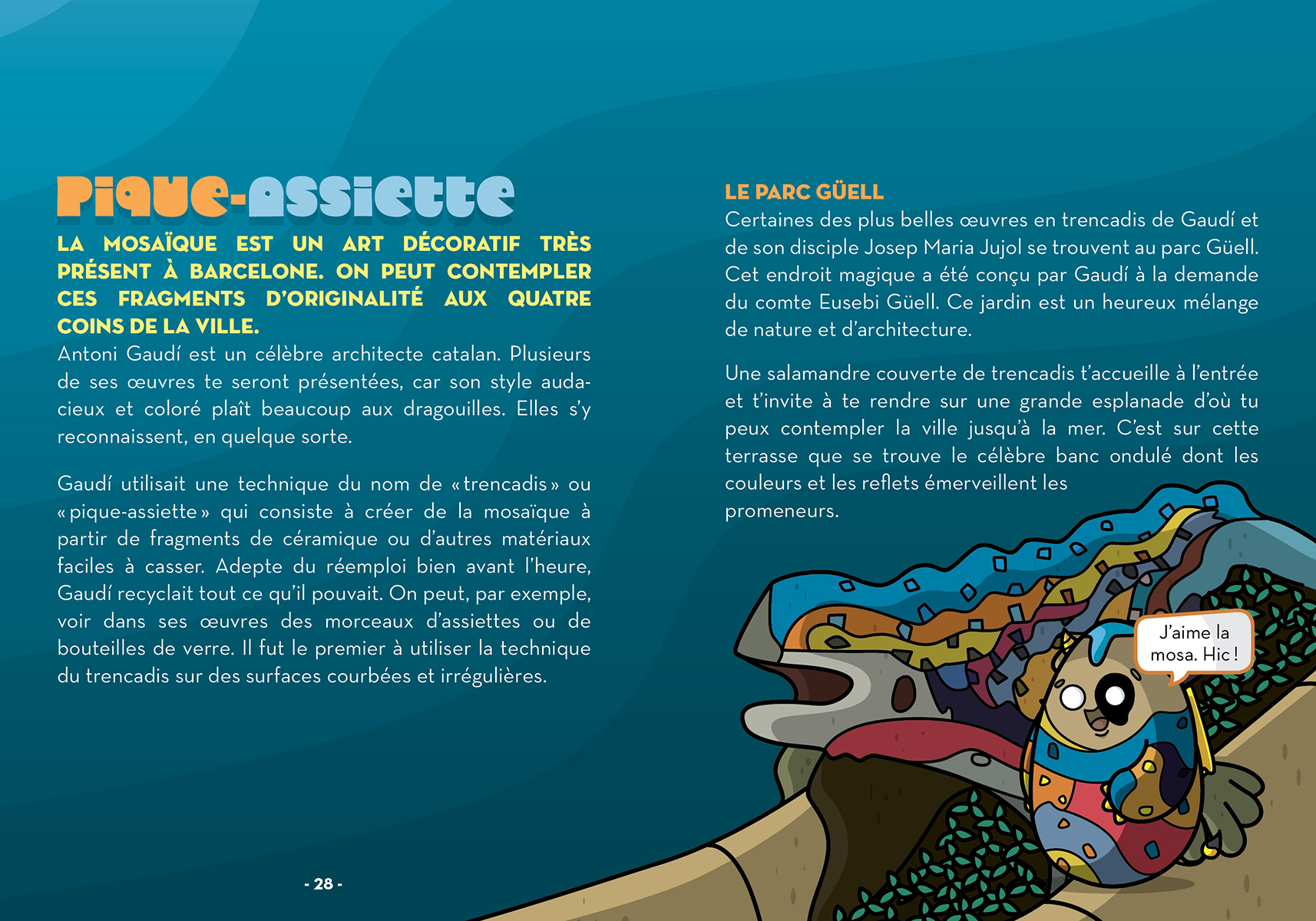 Les jumeaux, la geek, la branchée, la rebelle, le cuistot et l’artiste explorent la ville de Barcelone, en Espagne. Les jeunes lecteurs suivront les traces de l’architecte Antoni Gaudí et créeront leur propre mosaïque. Ils danseront la sardane dans une festa et célébreront l’amour à la Sant Jordi. Ils cuisineront des tapas qu’ils pourront partager avec leurs amis.