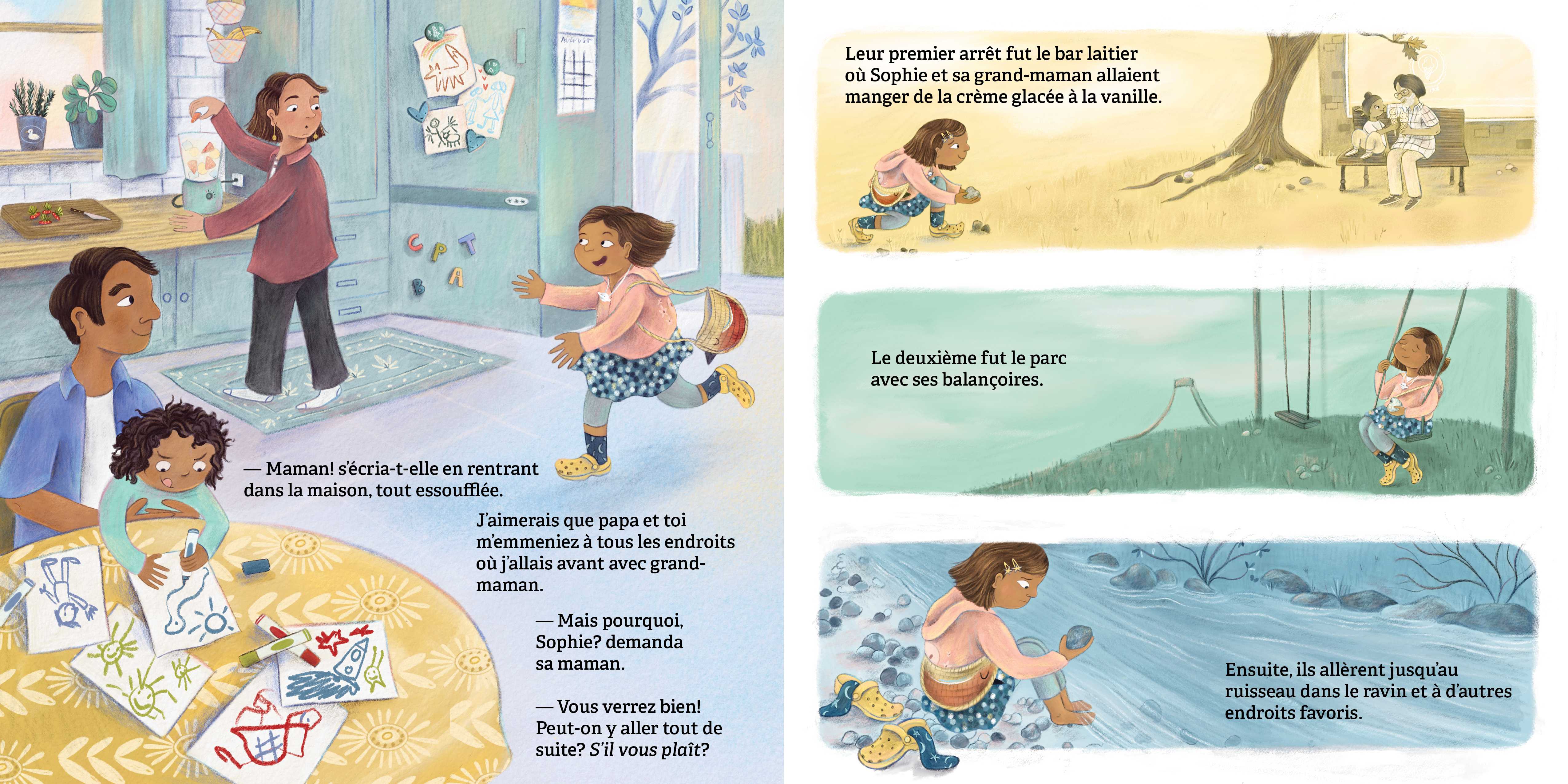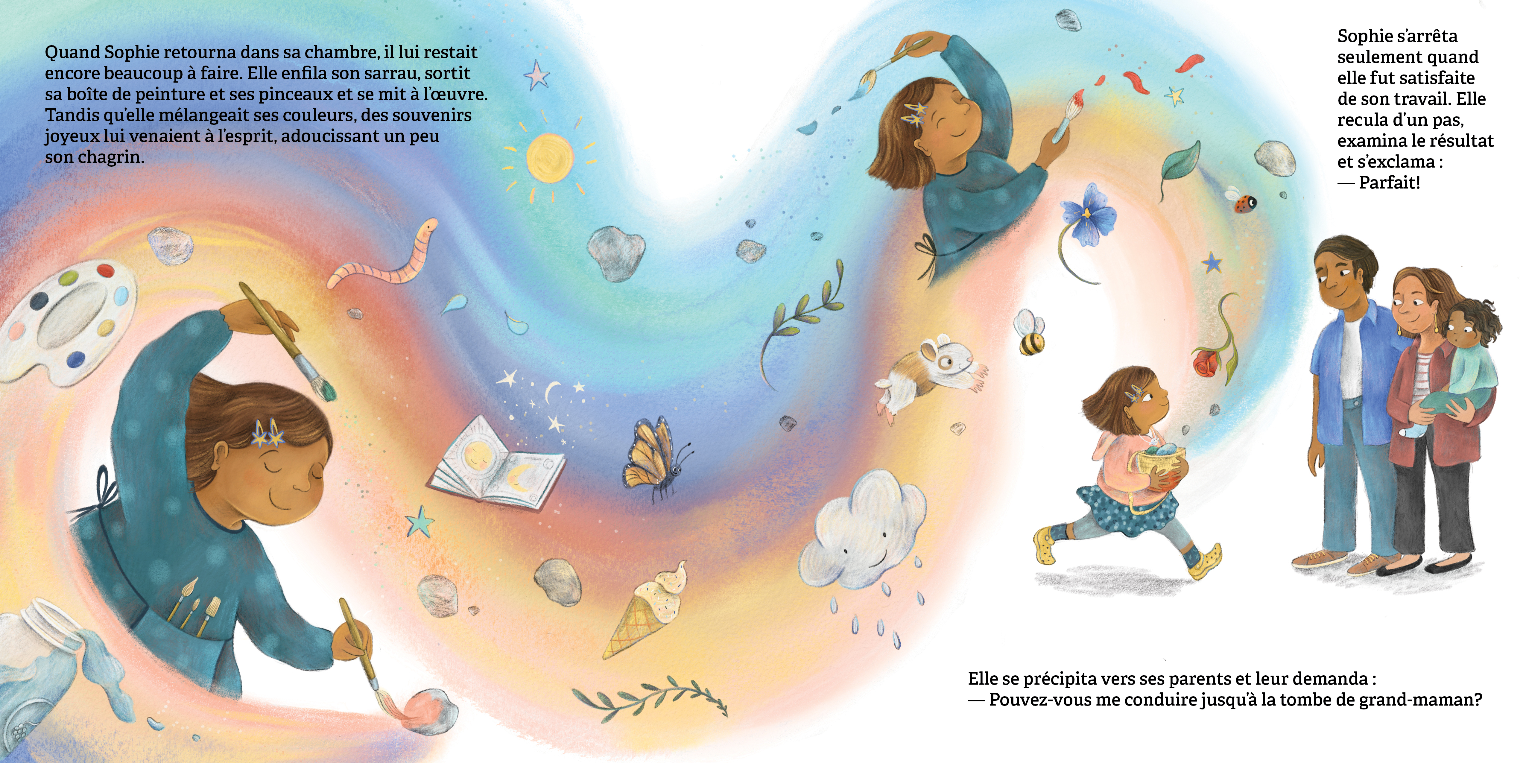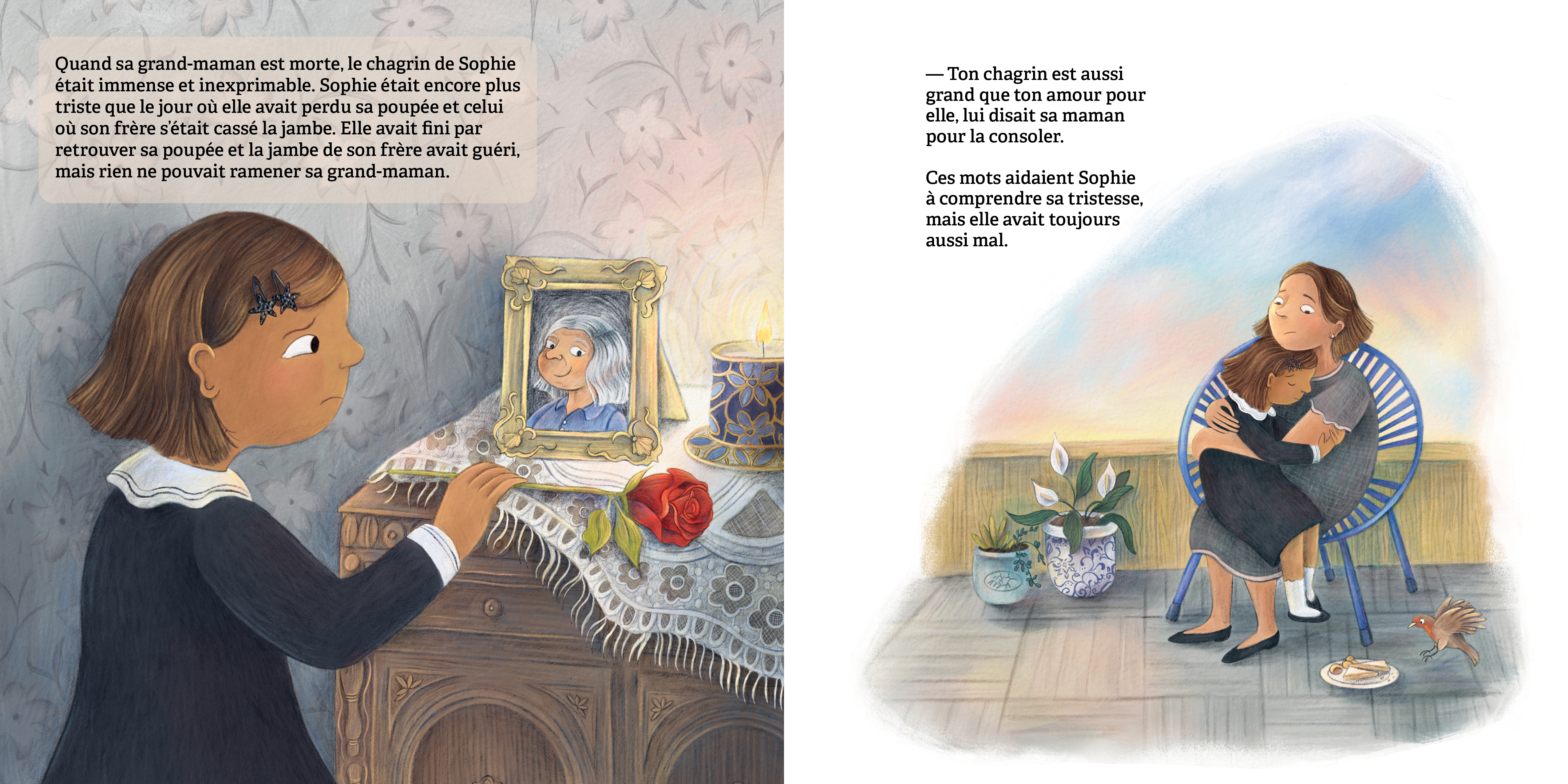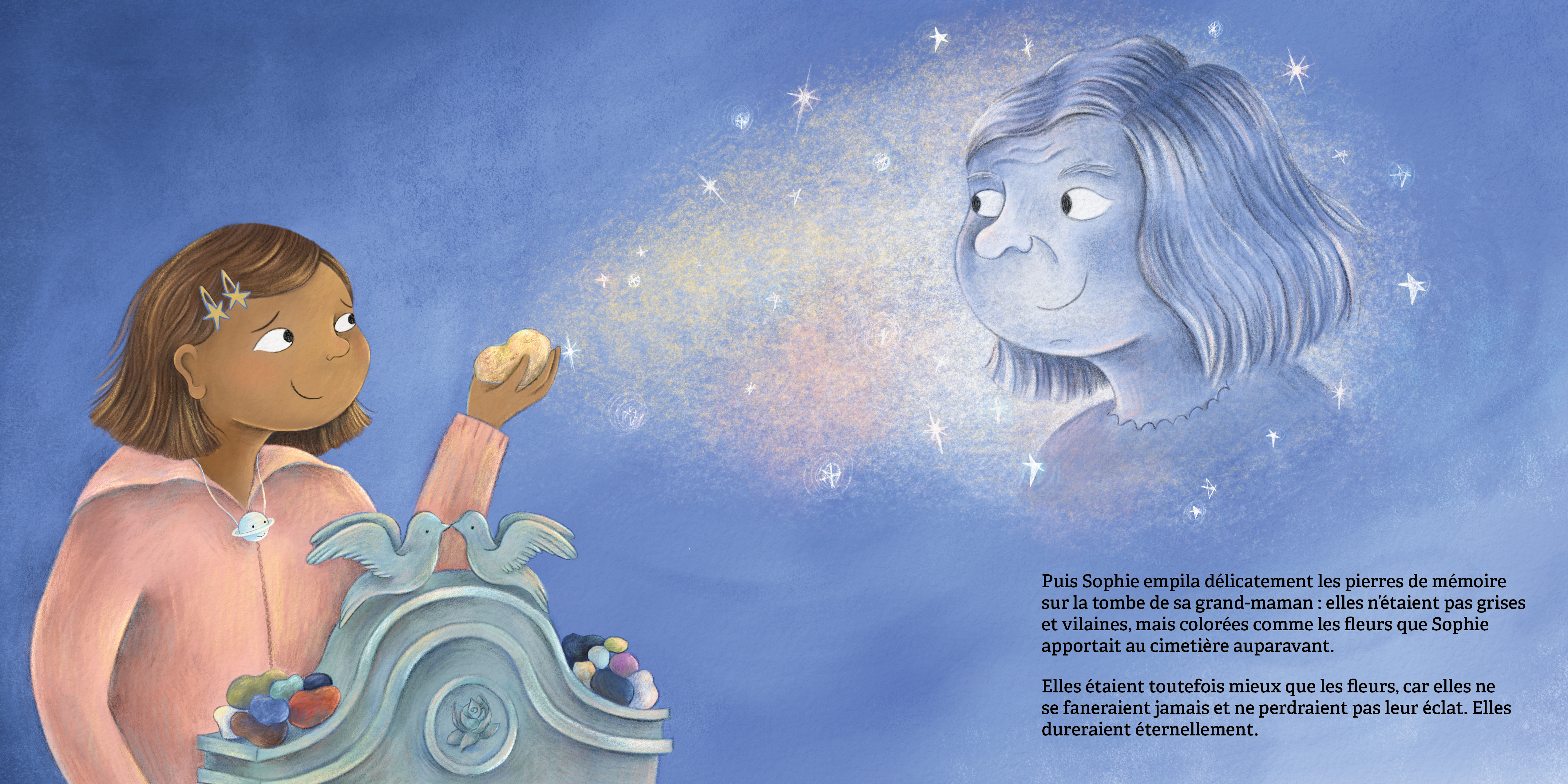 Sophie aimait sa grand-maman plus que tout : plus que les étoiles, plus que les livres et plus que son hamster! À la mort de sa grand-maman, le chagrin de Sophie est immense et inexprimable. Les fleurs qu’elle apporte au cimetière se fanent trop vite à son goût. Quand Sophie découvre la tradition ancienne de poser des pierres sur la tombe d’une personne aimée, cela lui donne une idée pour se souvenir éternellement de sa grand-maman et de tous les bons moments qu’elles ont passés ensemble.