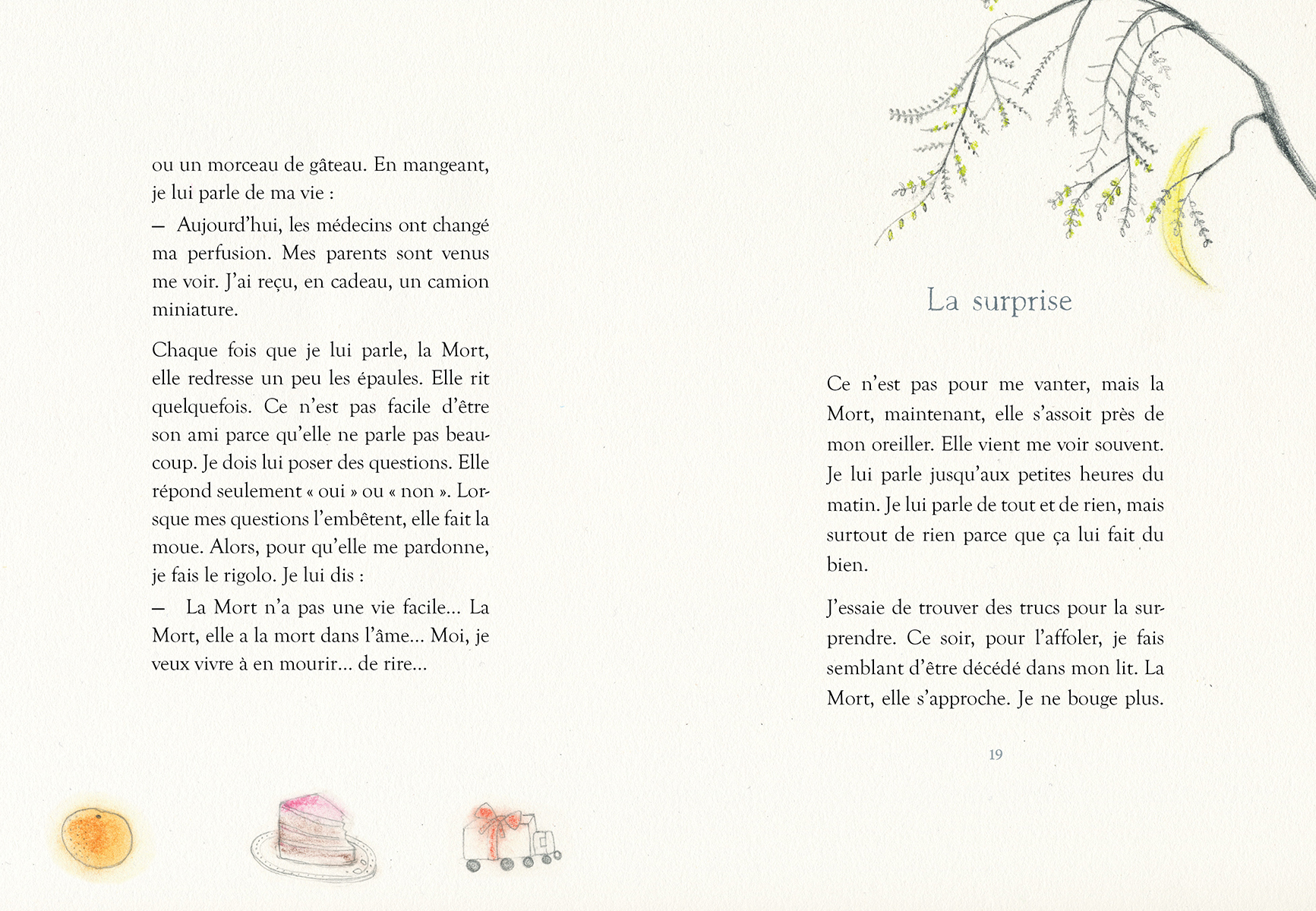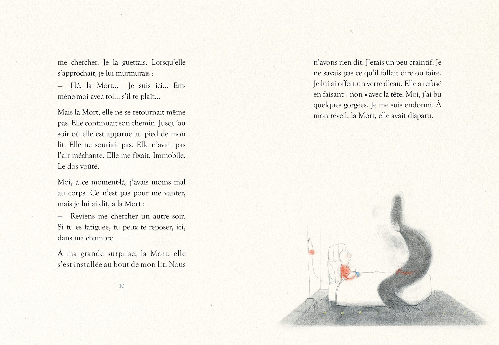Un enfant malade, dans sa chambre d’hôpital, décide de parler avec la Mort. Pour mieux la connaître et, surtout, pour arrêter d’avoir peur. D’abord craintive, l’étrange visiteuse se détend peu à peu en écoutant les confidences du garçonnet. Tout comme le renard du Petit Prince, elle se laisse tranquillement apprivoiser. De jour en jour, un lien fort se tisse entre eux, entre l’enfant et celle qui détient la clé du pays des rêves. De jour en jour, elle se rapproche davantage de lui et lui, d’elle. Jusqu’à ce que…