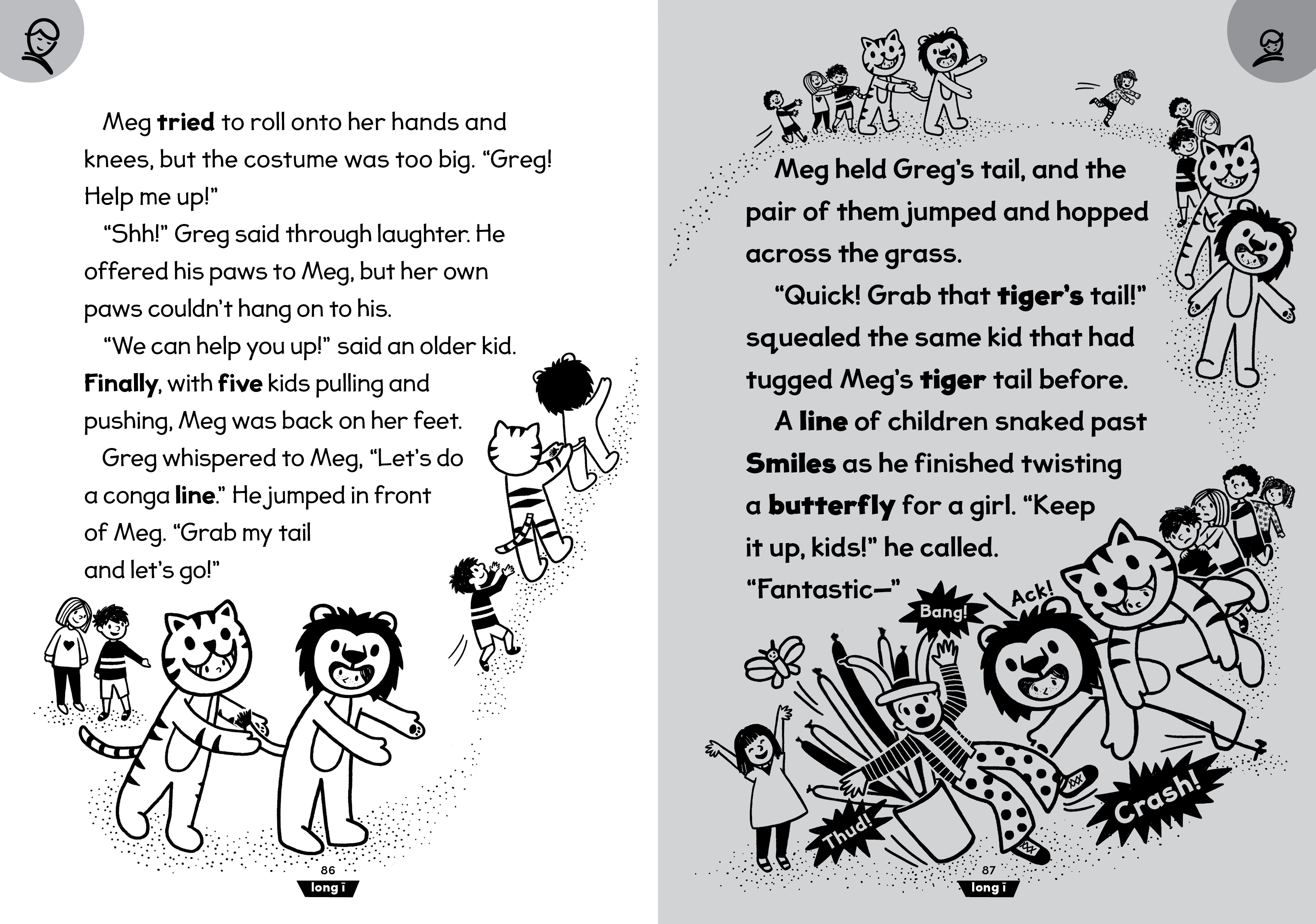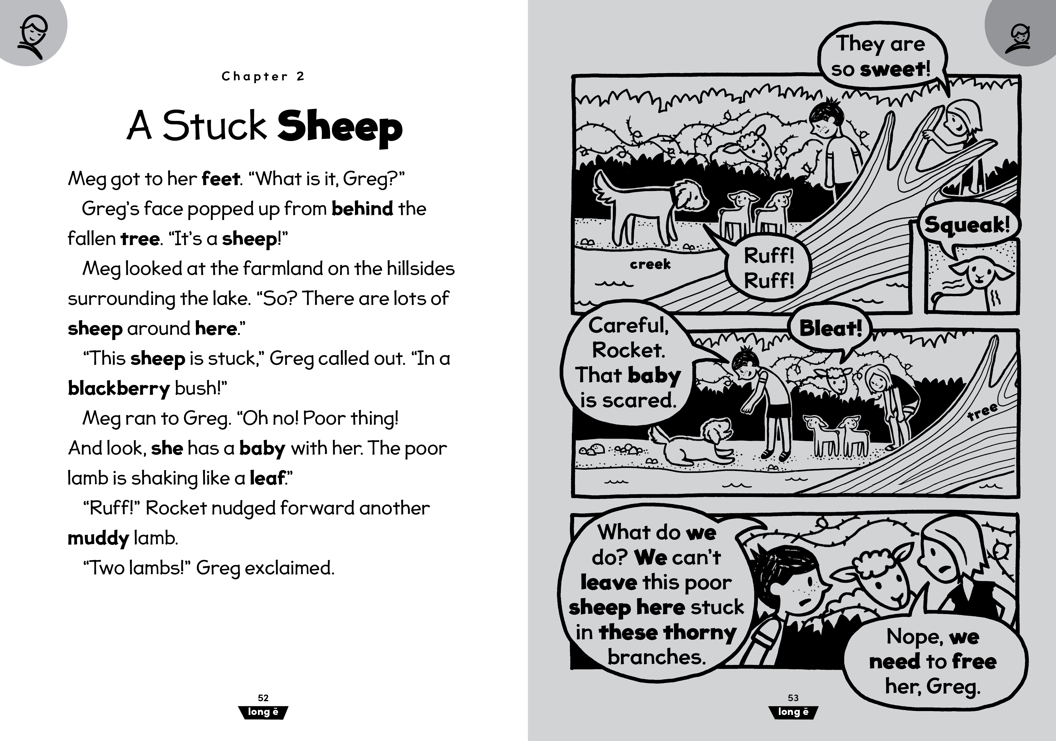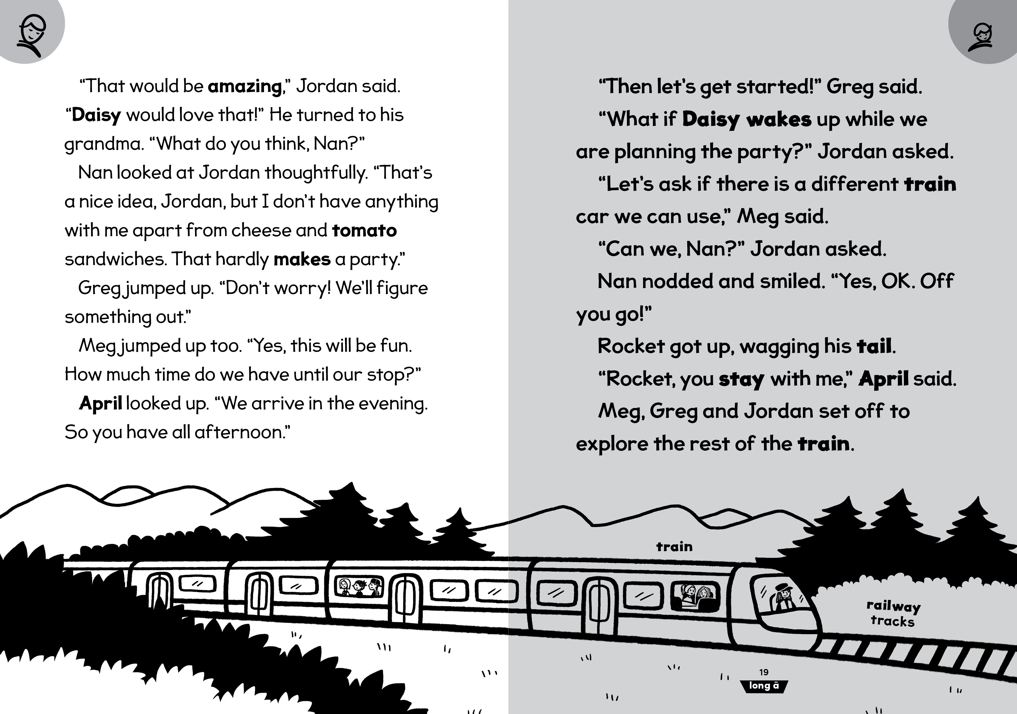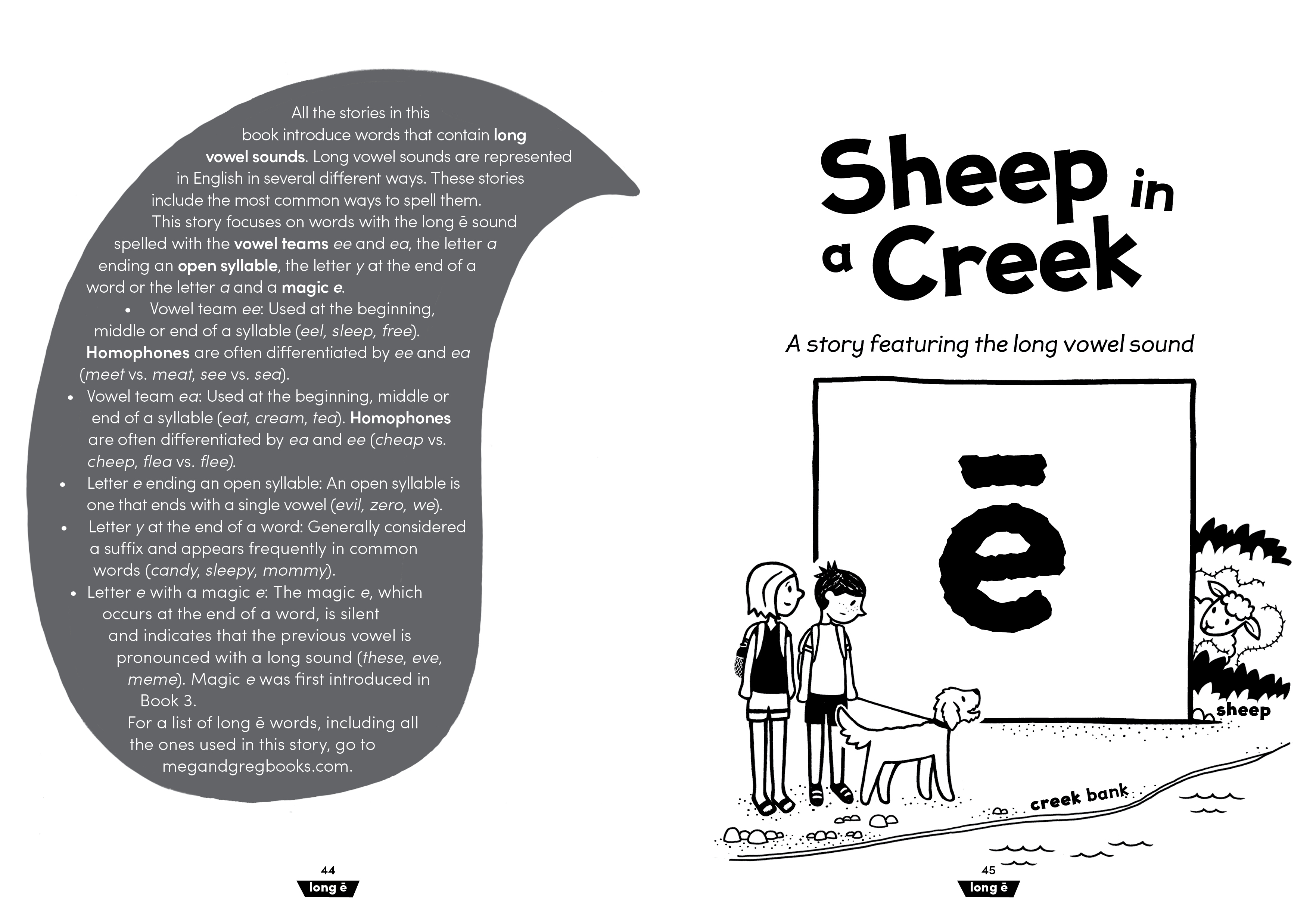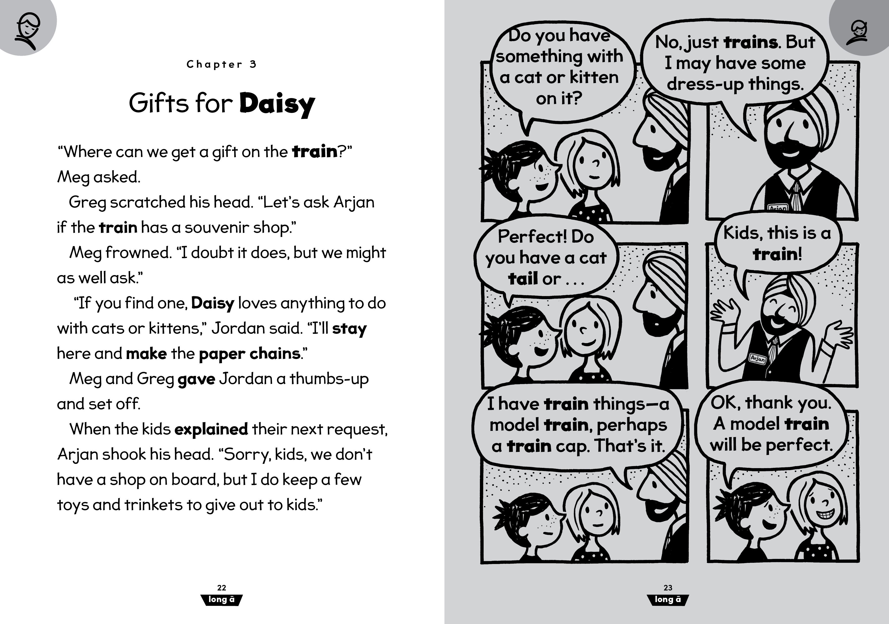 Meg and Greg: Train Day! is the sixth book in the Meg and Greg series designed for shared reading between a child learning to read and an experienced reader. The four stories inside (plus a bonus mini story!) introduce long vowels using vowel teams (long a: ai, ay, a, a-e; long e: ee, ea, e, y, e-e; long i: igh, ild, ind, i, y, i-e; long o: oa, ow, old, oll, olt, ost, o, o-e; long u: ue, ew, u, u-e). In addition to the familiar comic-style kids’ pages, highly controlled and decodable prose pages gently increase the amount of text that readers experience and provide even more opportunities to practice the reading skills previously introduced in Meg and Greg Books 1–5.