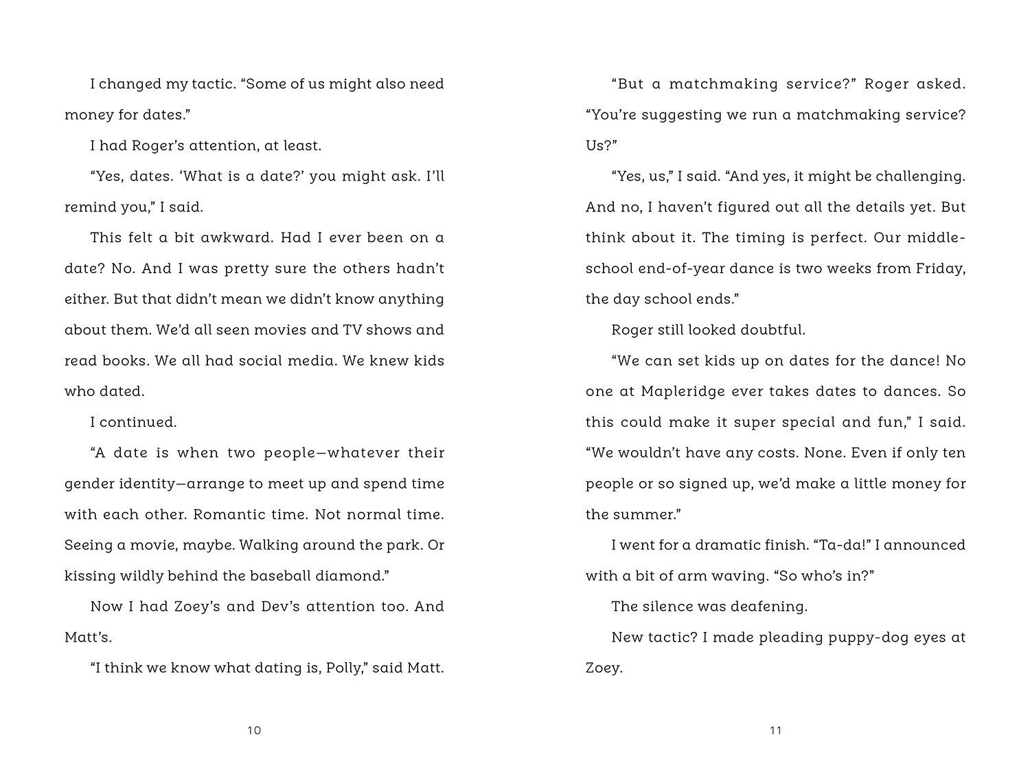 While almost everyone in the seventh and eighth grades has a crush, none of them are brave enough to ask anyone to the dance. That's where Polly and her friends' matchmaking service comes in. But setting up dates for middle-schoolers isn't as easy as it seems. Polly and her friends face unexpected obstacles and uncomfortable truths as they discover the ups and downs of running a business and dating.
