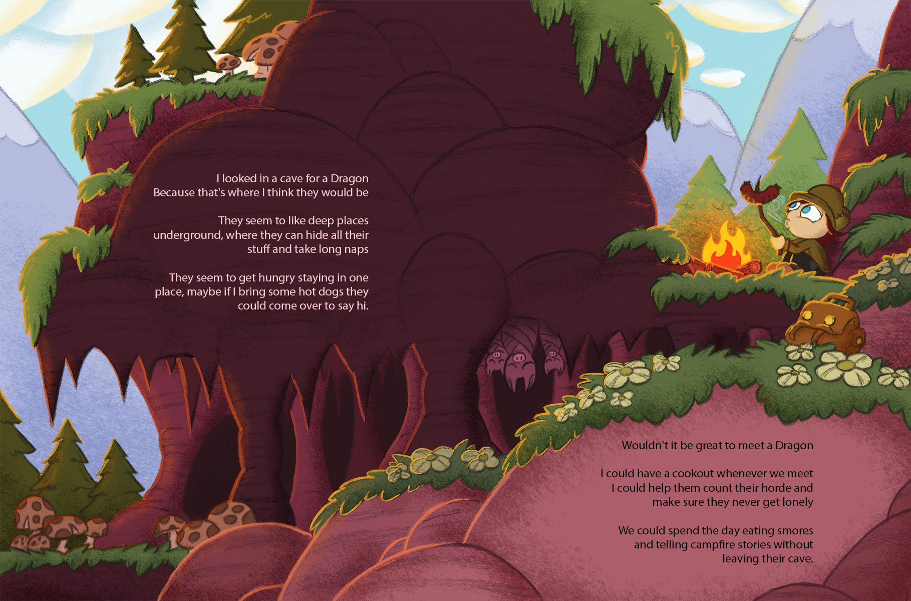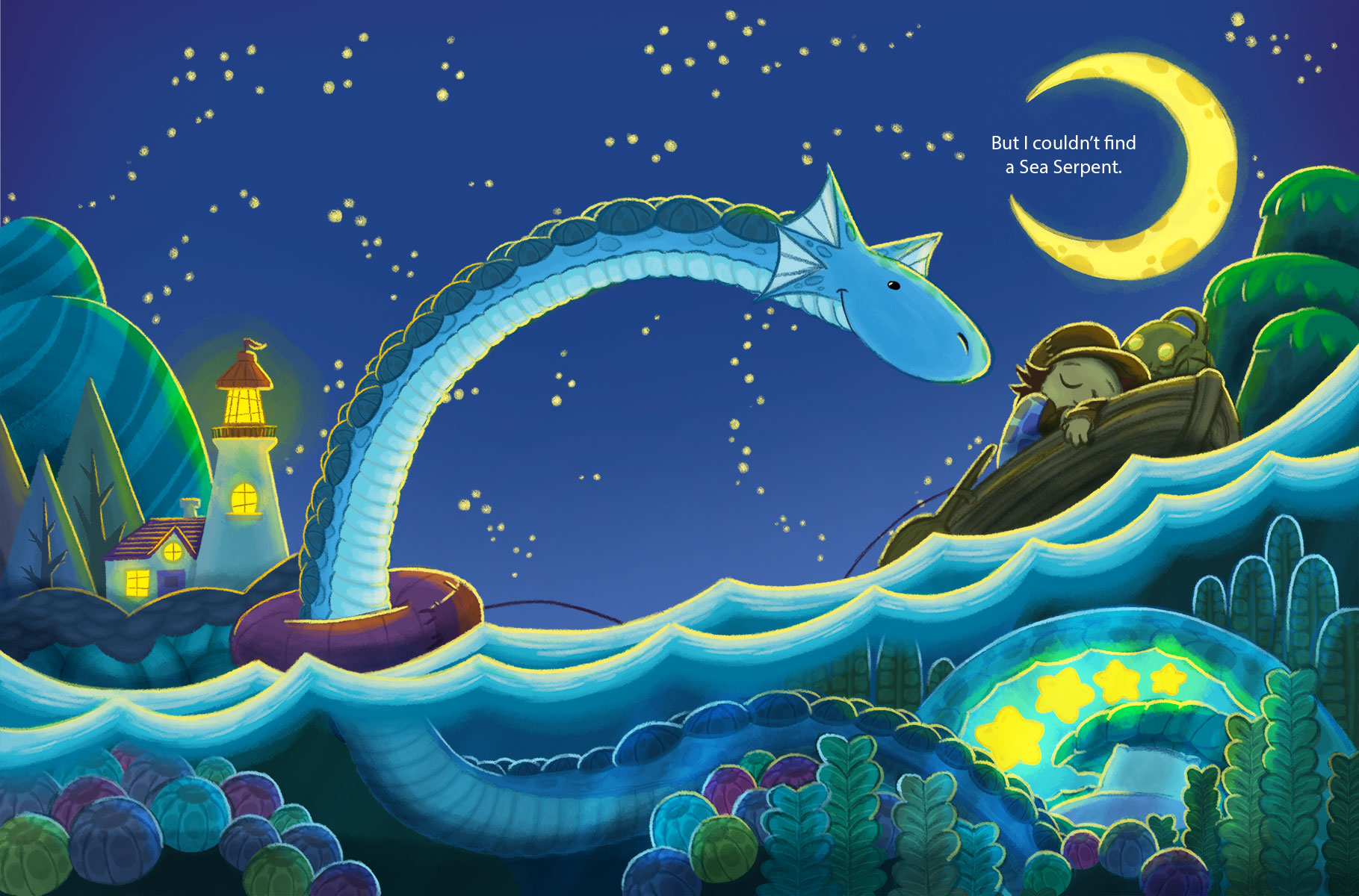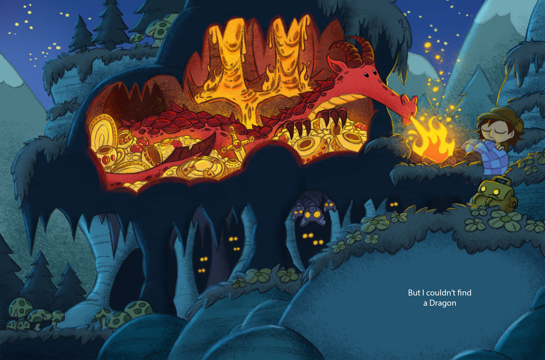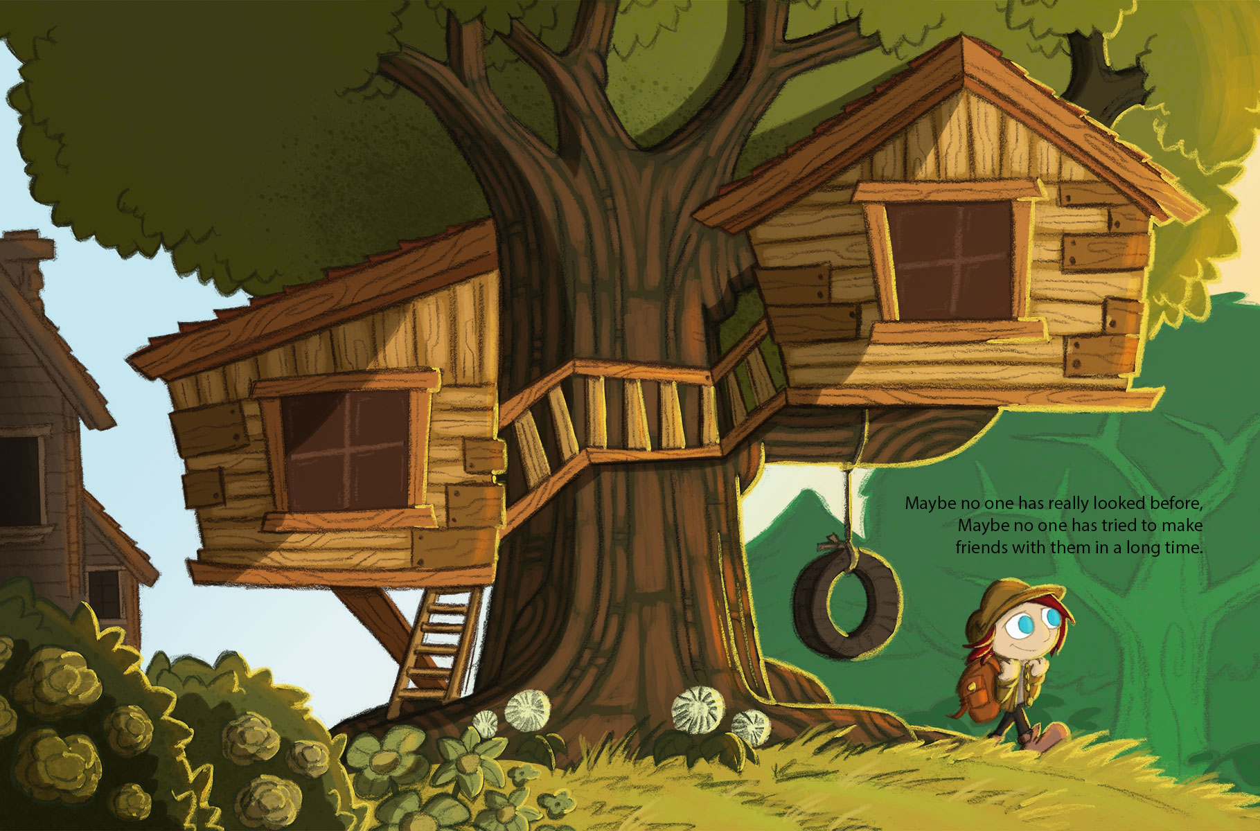 A friendly character living in a forest in a cabin in a tree learns about mythical creatures in books. He figures he should go look for these creatures since no one seems to have found them. As he searches for them, he is disappointed that he can’t appear to find any. The creatures are there for the reader to see but escape the view of the seeker. A wonderful story of loneliness and friendship in odd places. Creatures in books do not always exist but they do reside in our imagination.