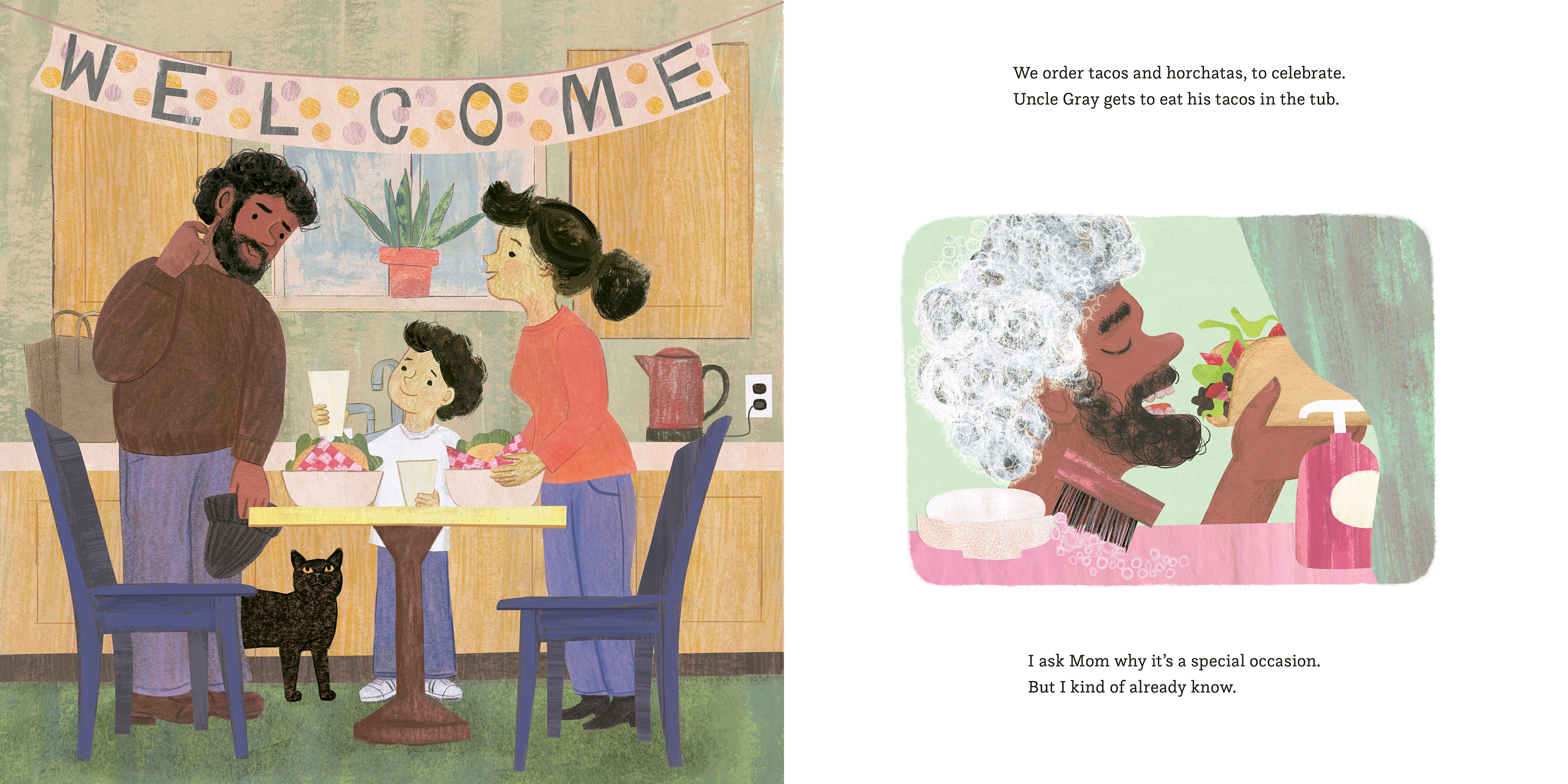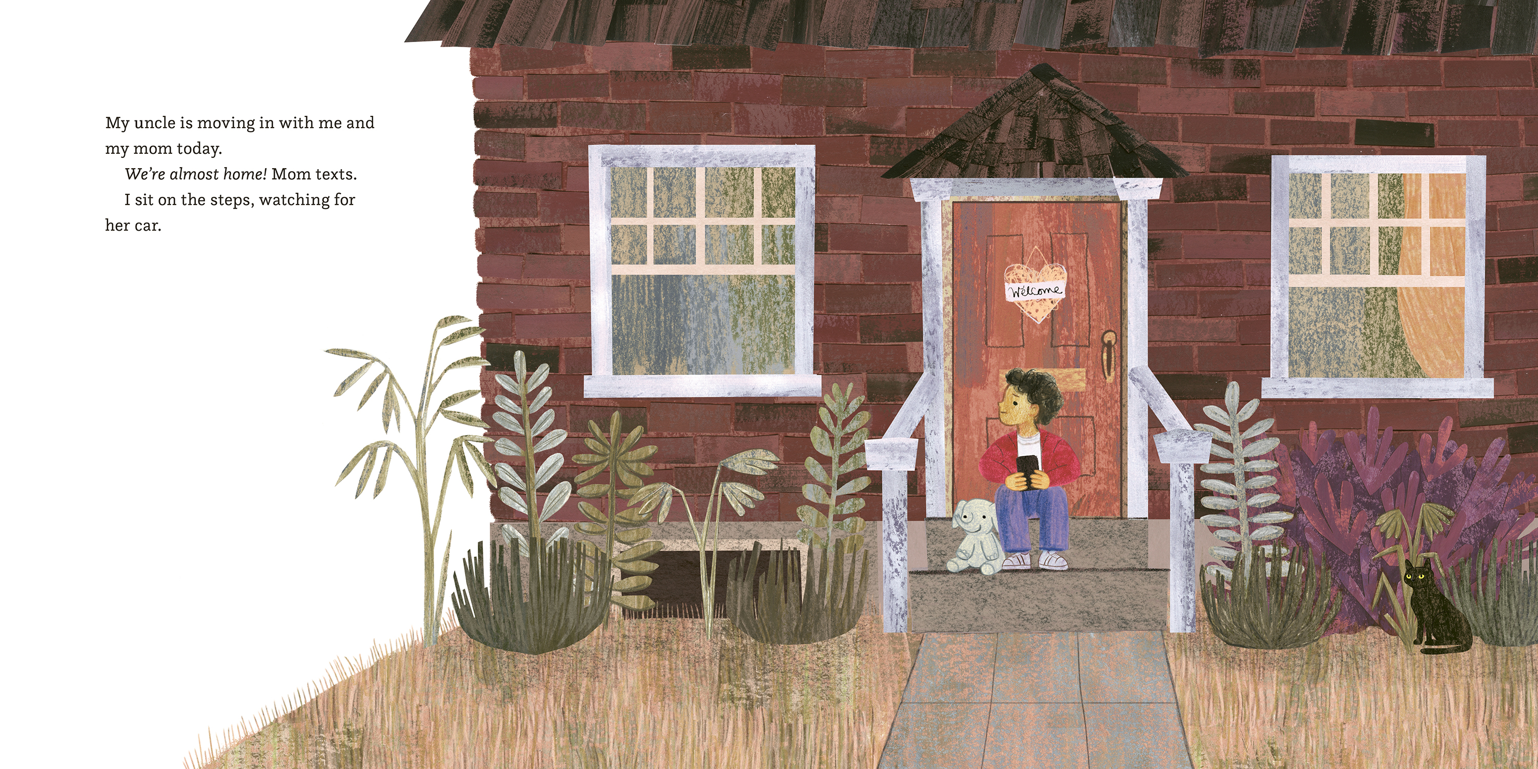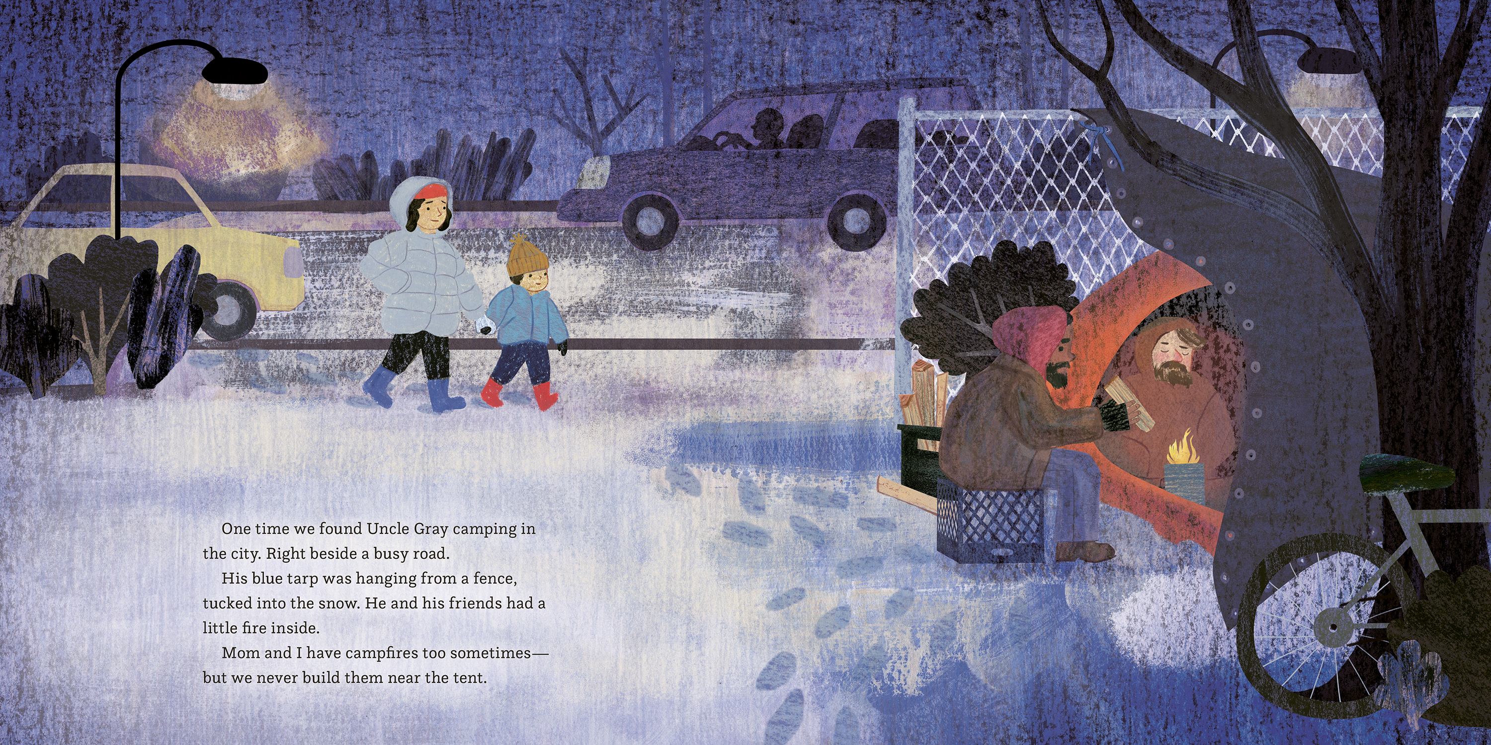 His nephew stands waiting for him out on the porch, and when Uncle Gray arrives, the boy is surprised his uncle only has one little backpack. Uncle Gray has been living on the streets for years, and the boy remembers how he and his mom used to go driving to look for him, especially during the winter. Sometimes they'd find him in his tent, with ice in his beard. He was always glad to see them. Now that Uncle Gray is ready to move in, he'll have his own cozy room, and the boy is glad to know they won't have to go looking to check if he's okay. Because he'll be right downstairs.