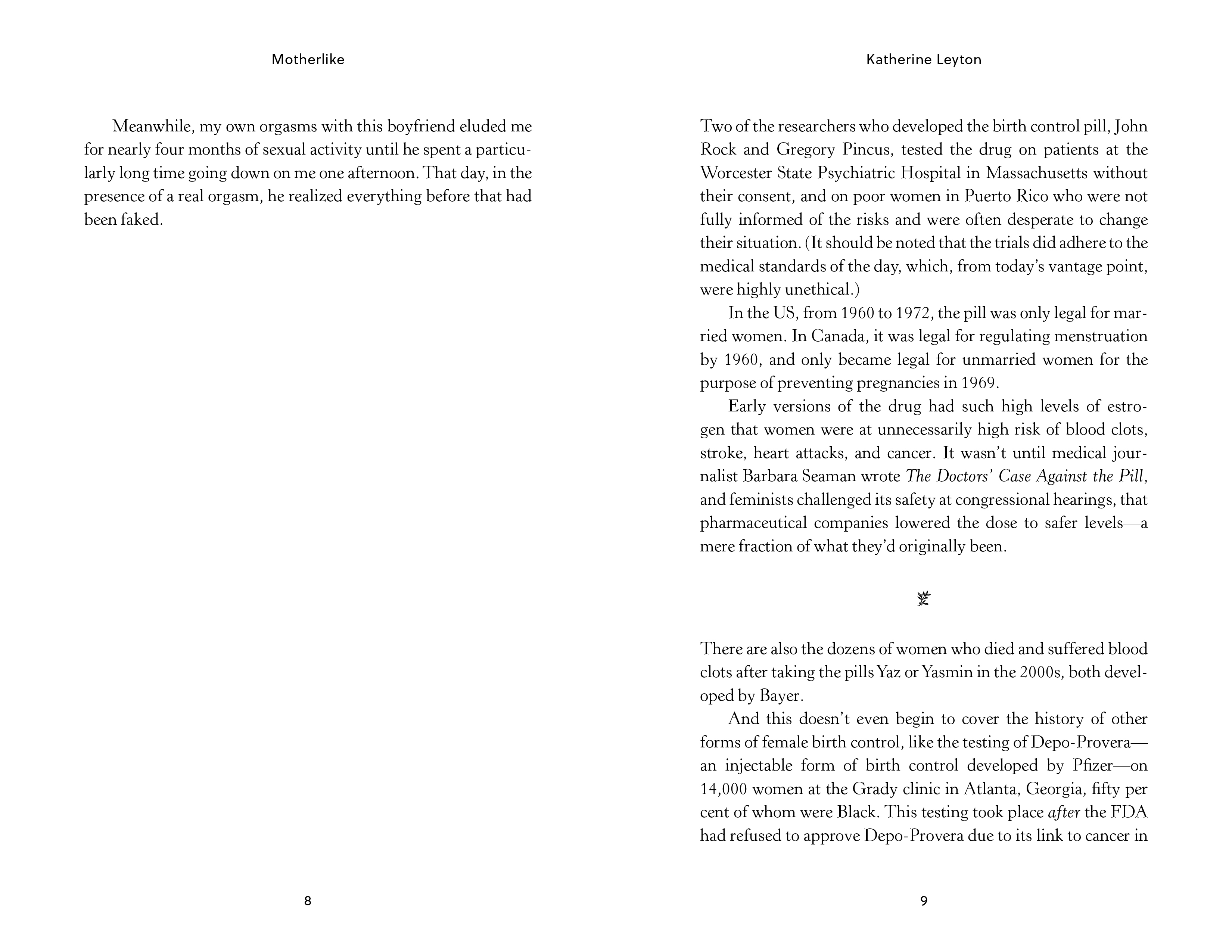 Sharp and intensely candid, entertaining, and deeply poignant, Leyton weaves her own experience of becoming a mother to her son (the shocks, the strangeness, and the pleasures) with historical research and cultural commentary. Everything from the history of the birth control pill and the objectification of women's bodies to the risks of labor and the realities of being postpartum. Leyton invites us into a very personal story that reflects a larger picture of ourselves.
