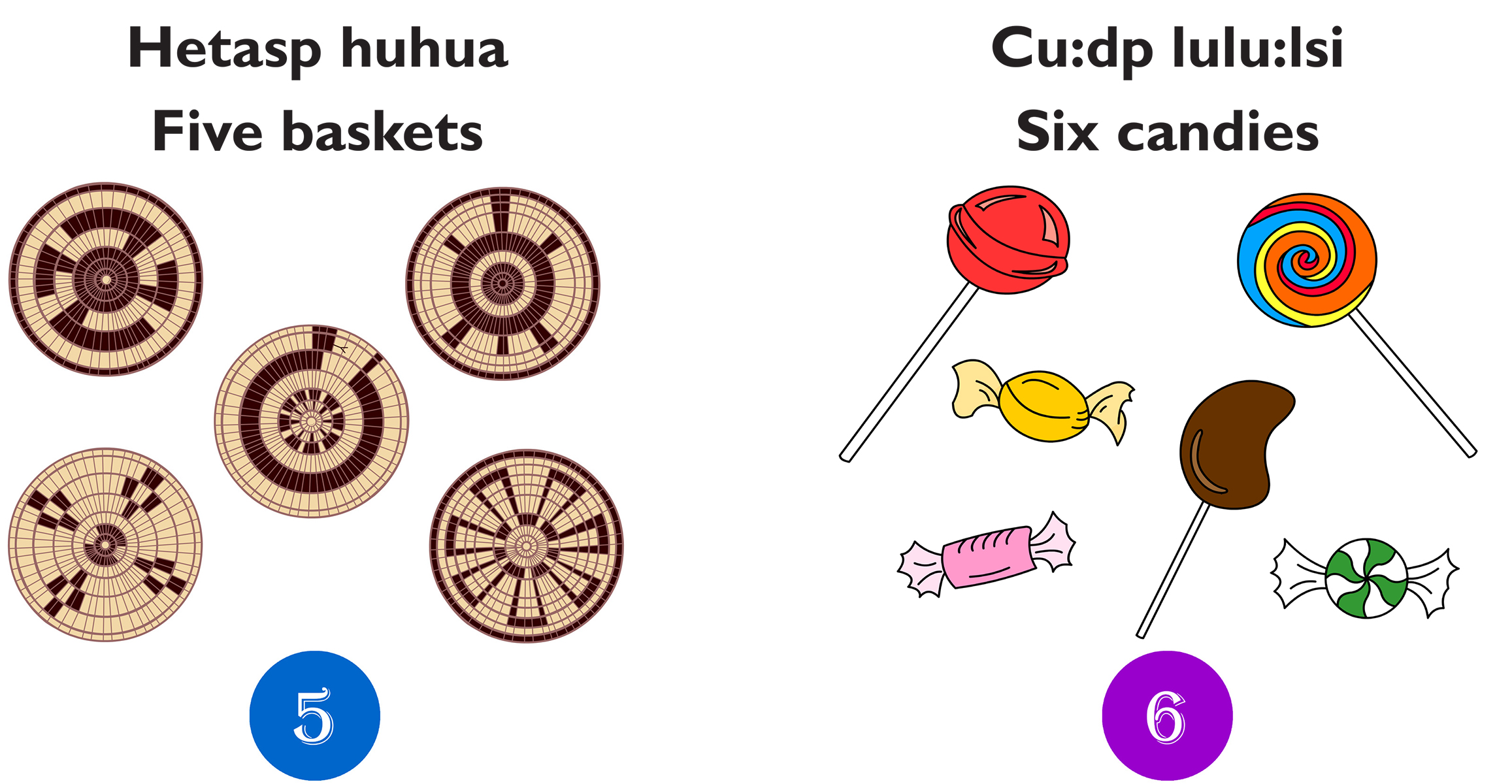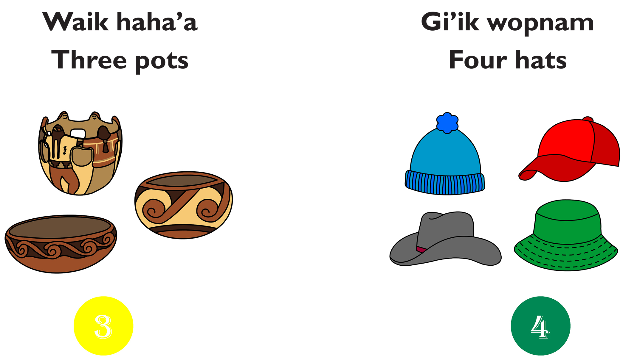 This colorful board book presents numbers in both the English and O’odham language. The numbers and words are presented in both languages with clear, vibrant images that would be familiar to early language learners. Each number also has a simple sentence to introduce English and O’odham language structure. Each number has a corresponding set of images to support the number. Many of the various images are familiar to O’odham culture to promote usage of the words at home, in the community, or in school. The board book also has a glossary at the end for quick reference. There is a QR code link that directs visitors to a webpage with the pronunciations of the words, numbers and sentences found in the board book.