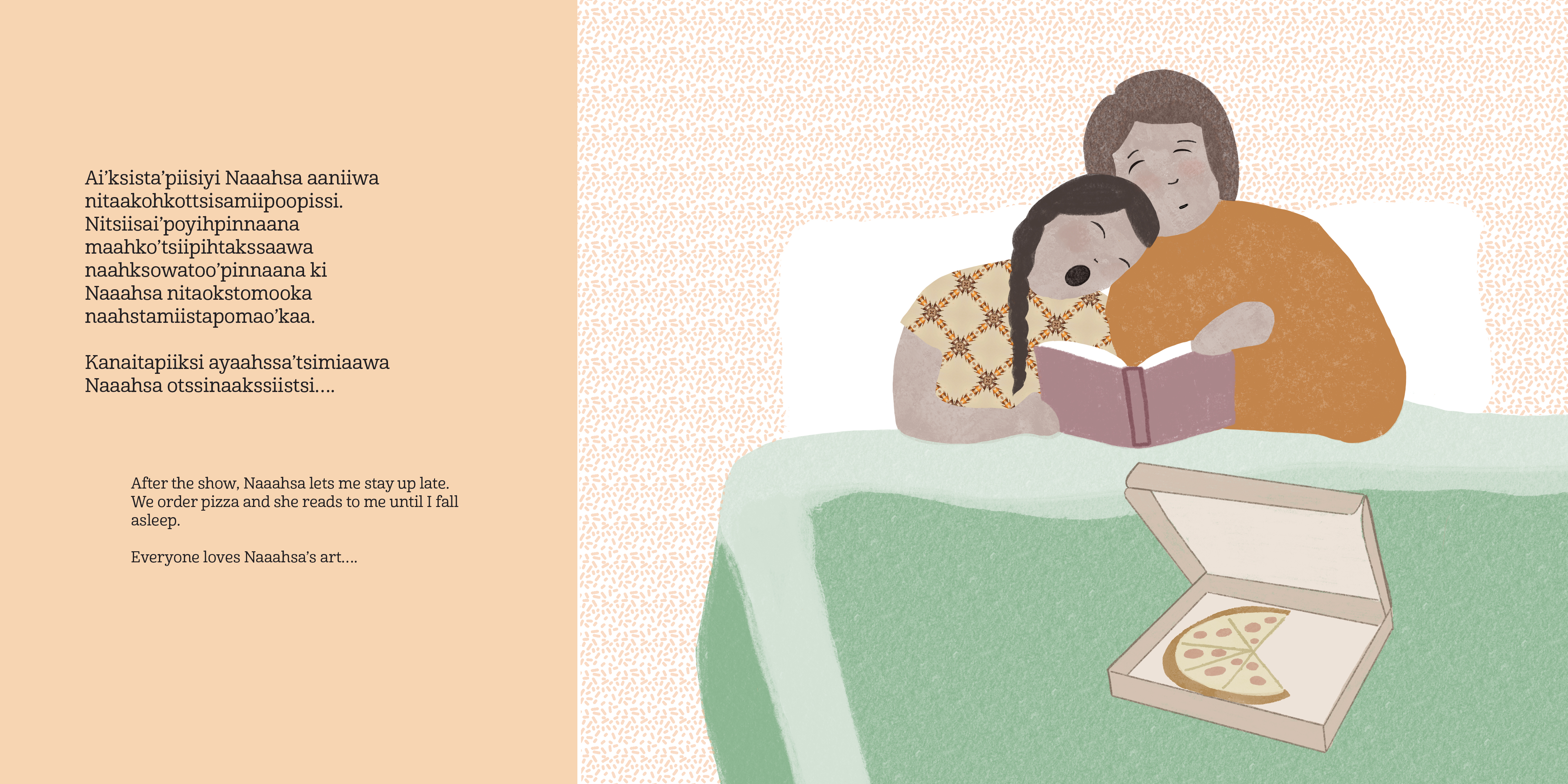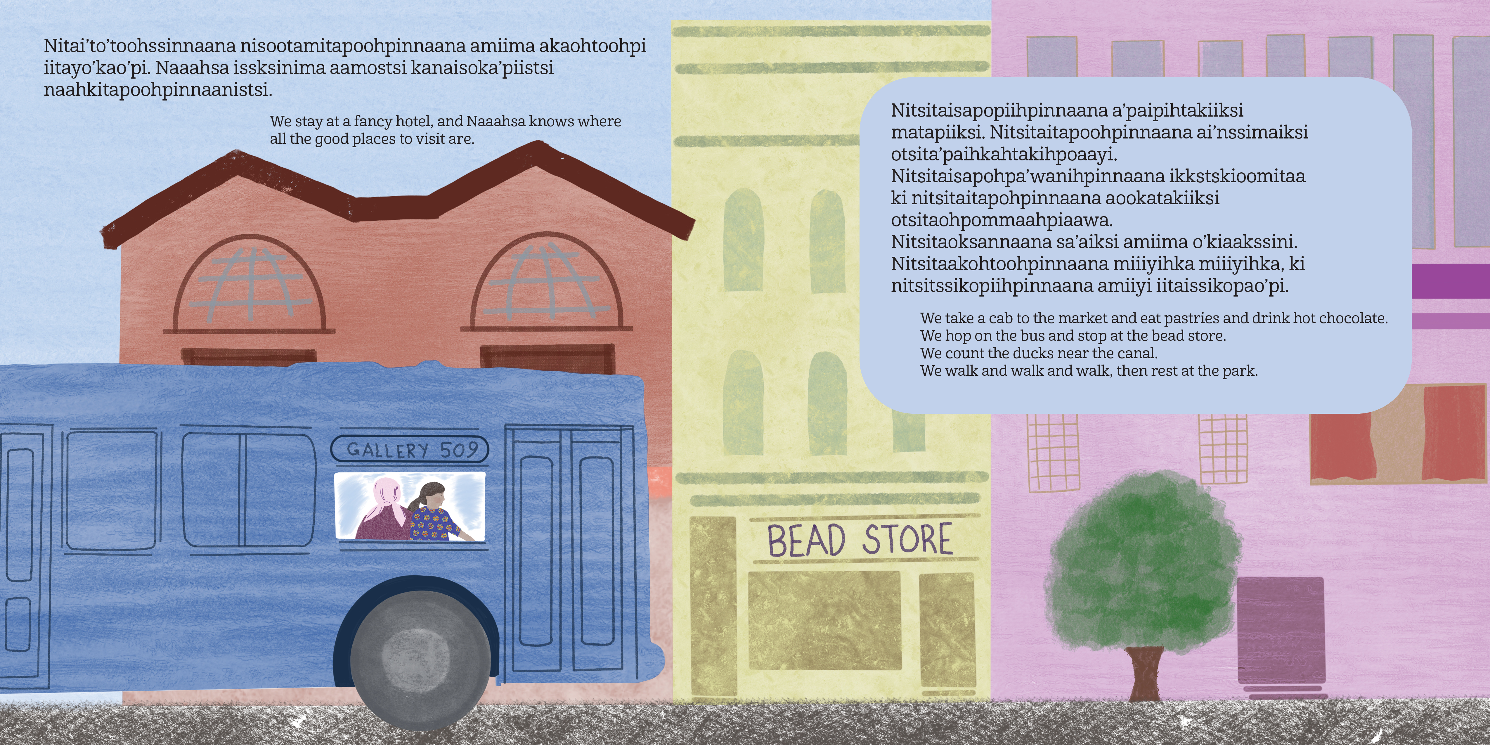 Naaahsa says art is a language everyone understands. Sometimes we make art together. We draw, we bead, we sing. Sometimes Naaahsa tells stories in Blackfoot. I even get to go with her to see her art show at the National Gallery. Naaahsa is famous for her art, but I love her hugs best!