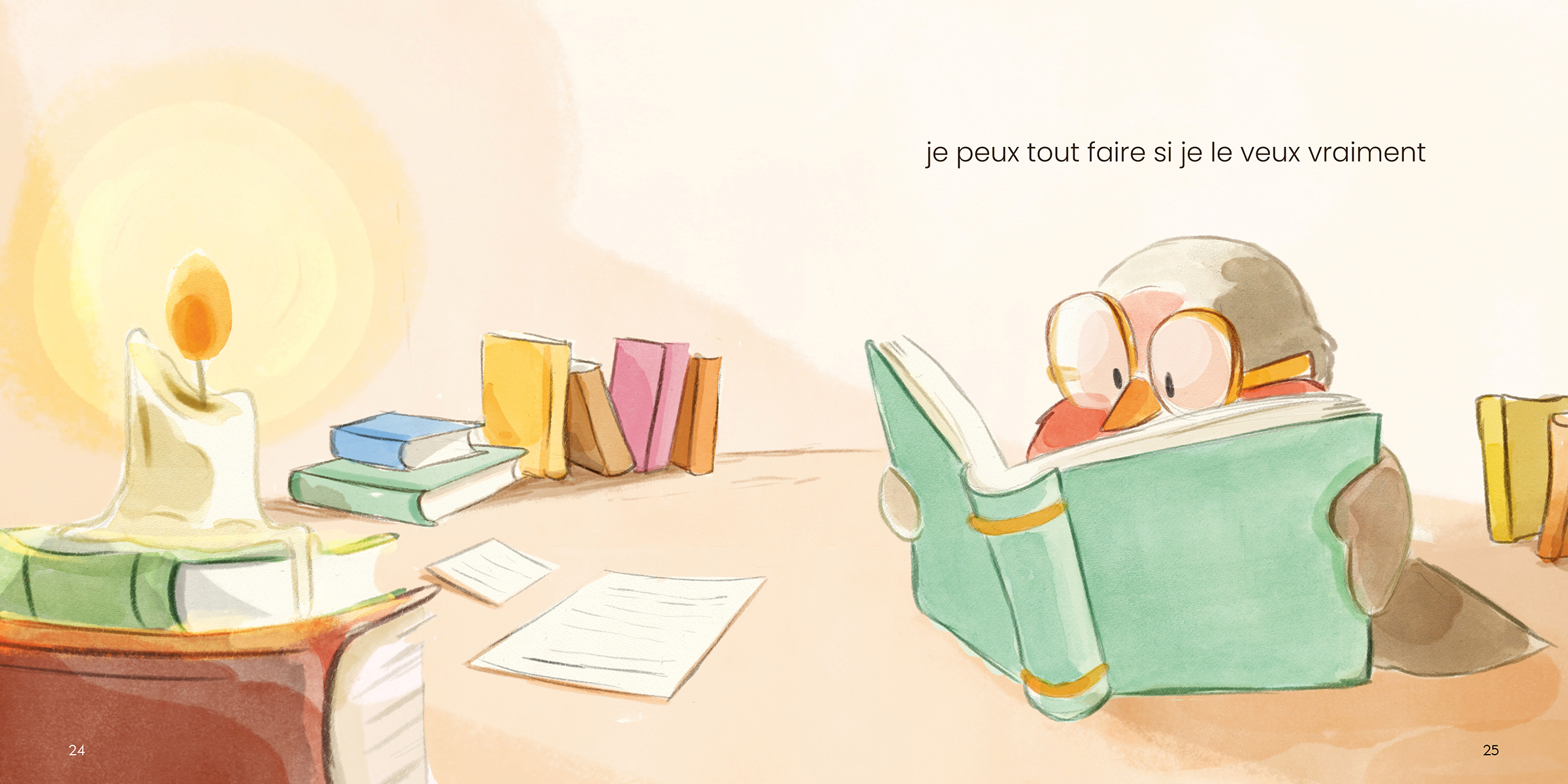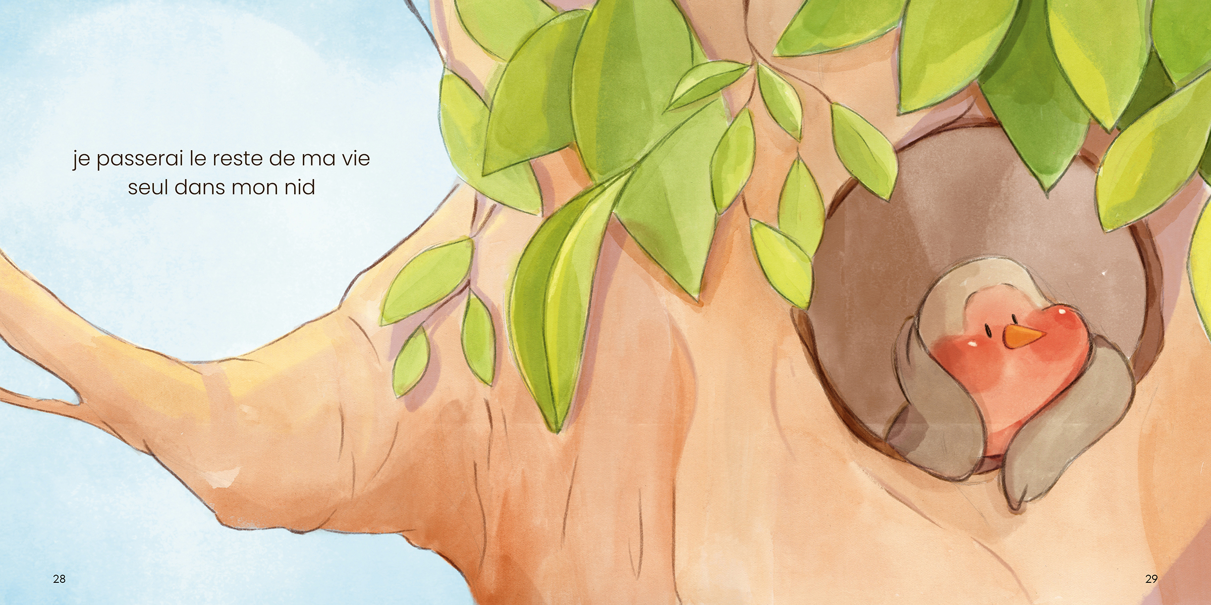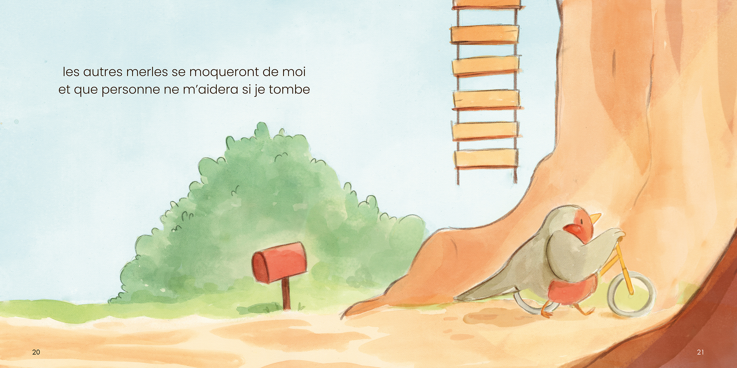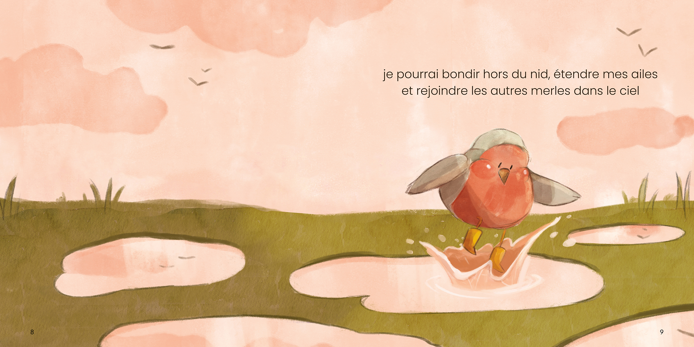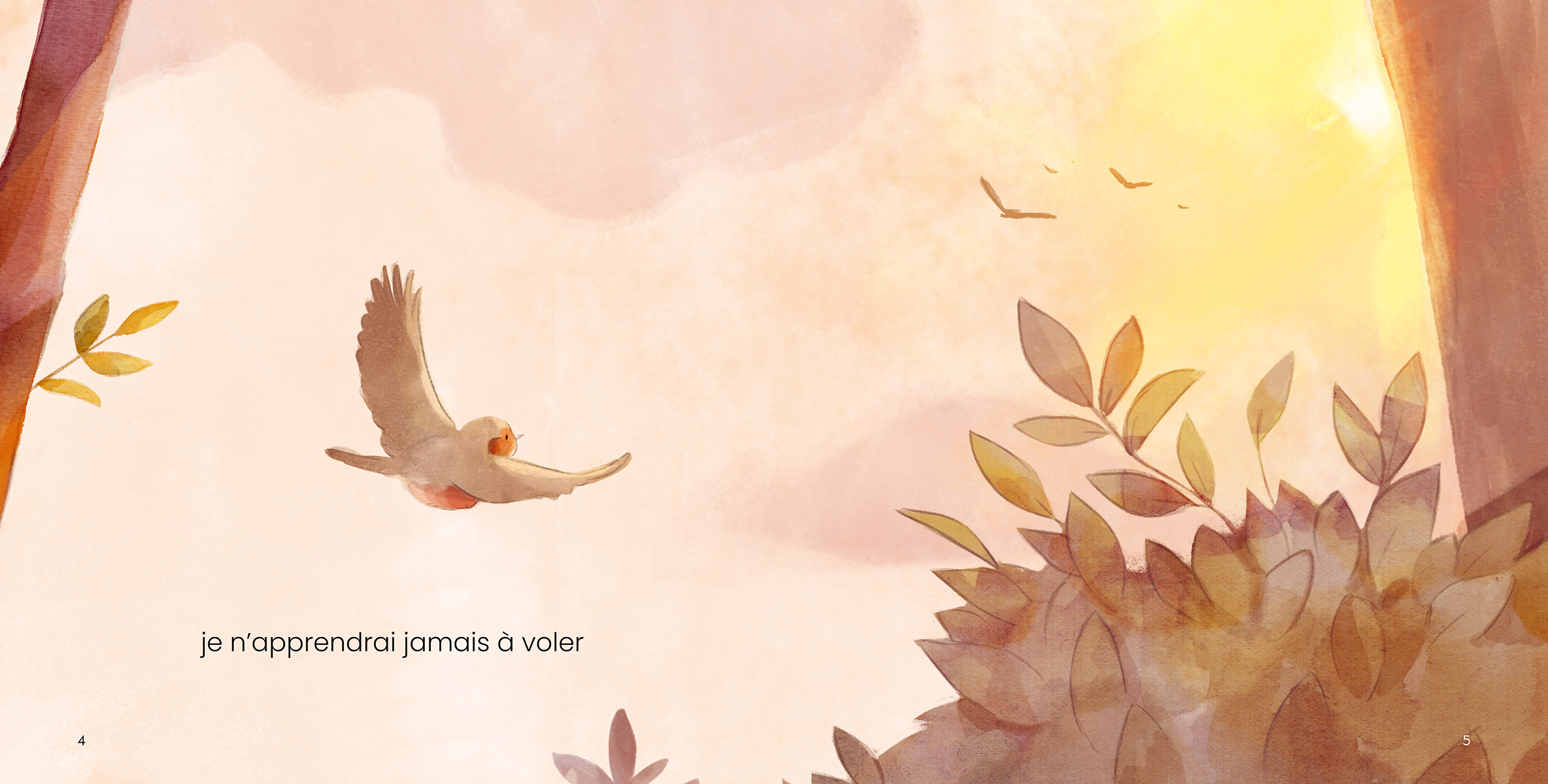 Un rouge-gorge refuse de quitter son nid, persuadé qu’il ne saura jamais voler. Sa professeure de vol lui révèle deux secrets : on n’apprend rien sans erreurs, et changer de perspective peut transformer un échec en aventure. Une histoire à lire dans deux directions pour voir les choses autrement.