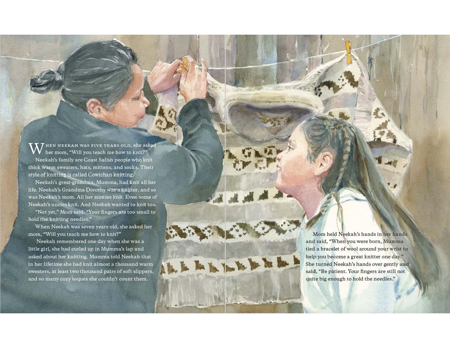 Neekah’s great grandma, Mumma, knit all her life. Her Grandma Dorothy knits, her mom knits and all her aunties knit. Even some of Neekah’s uncles knit, too. Every year she asks her mom if she can learn, and every year she hears, “Be patient. Your hands aren’t quite big enough yet.”