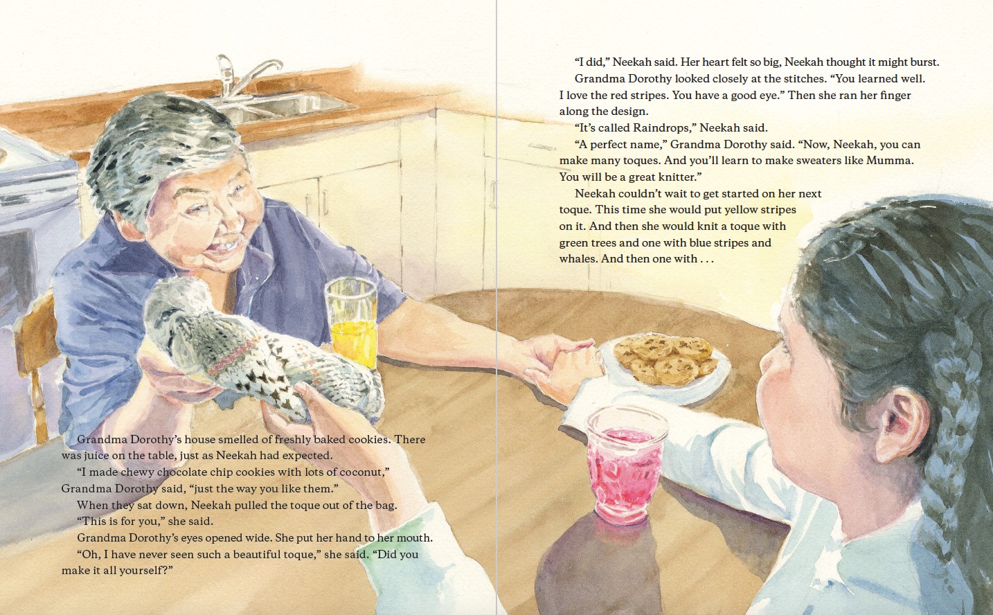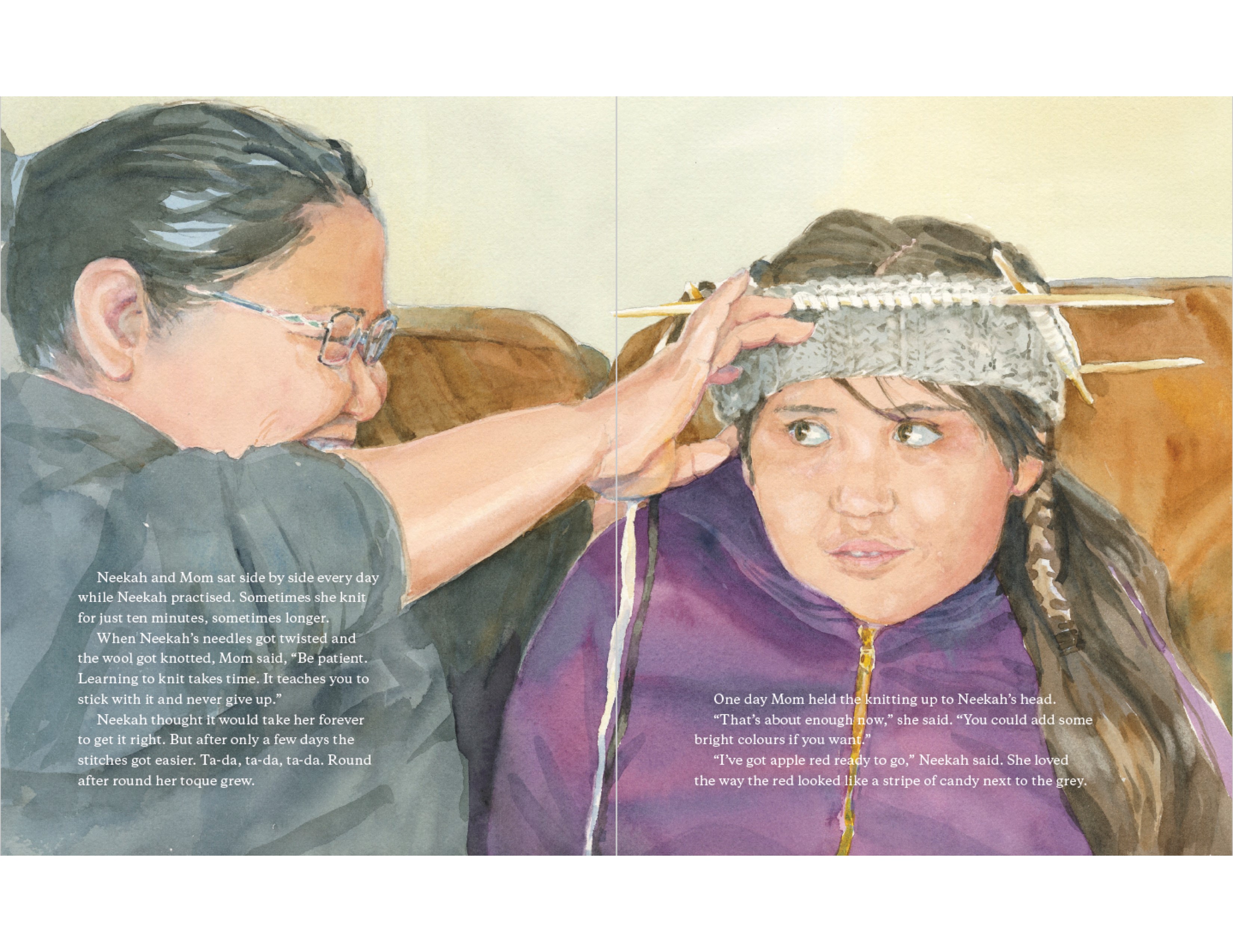 At last Neekah is ready to learn, her head and heart bursting with the colorful designs she will create with the wool. She sits down with her mom, holding the wooden needles Grandpa Carl has made for her and the wool she chose from Auntie Joni’s shop. But knitting a toque for Grandma Dorothy is not as easy as she had imagined.