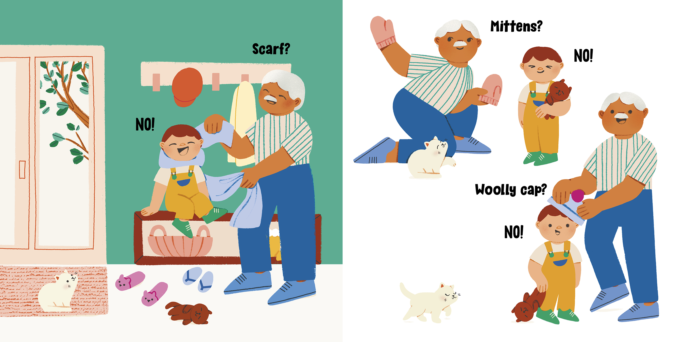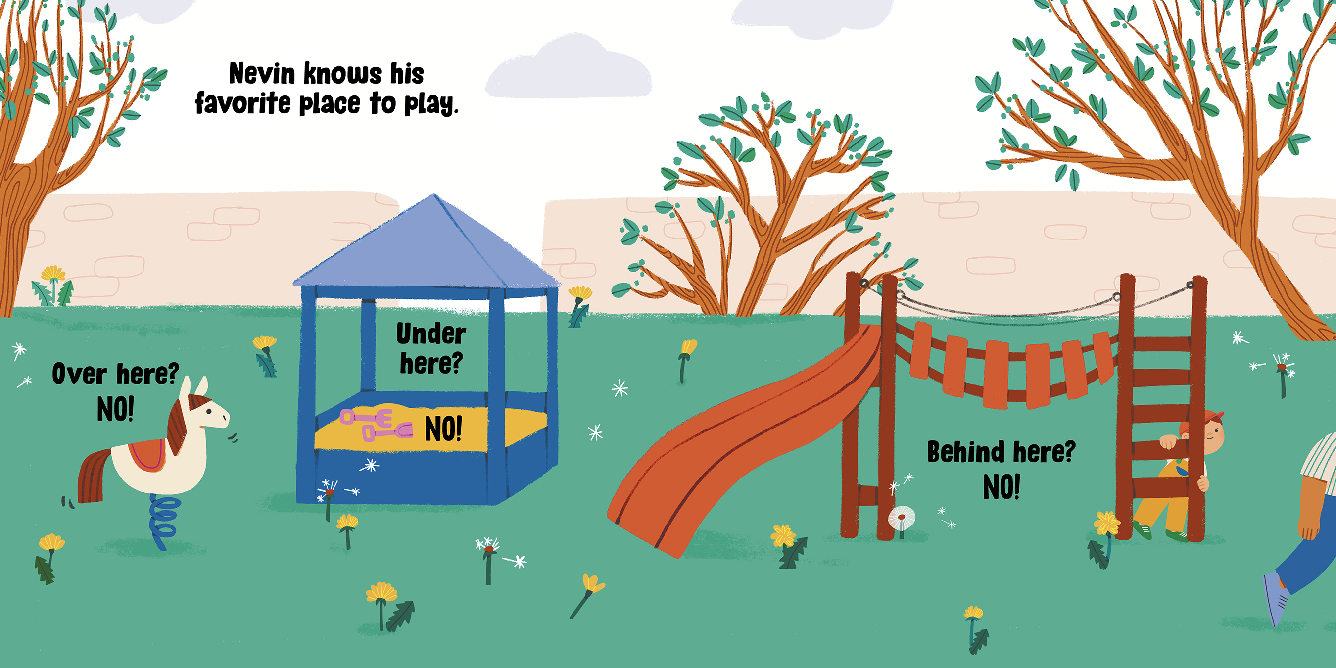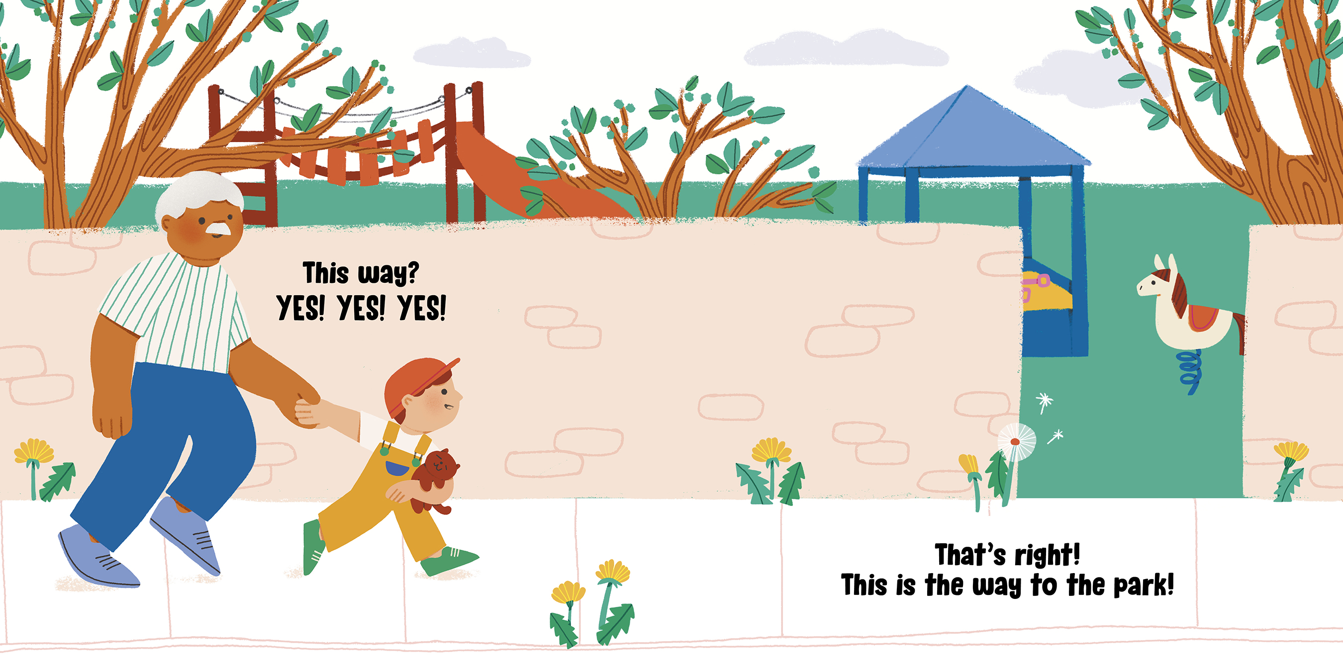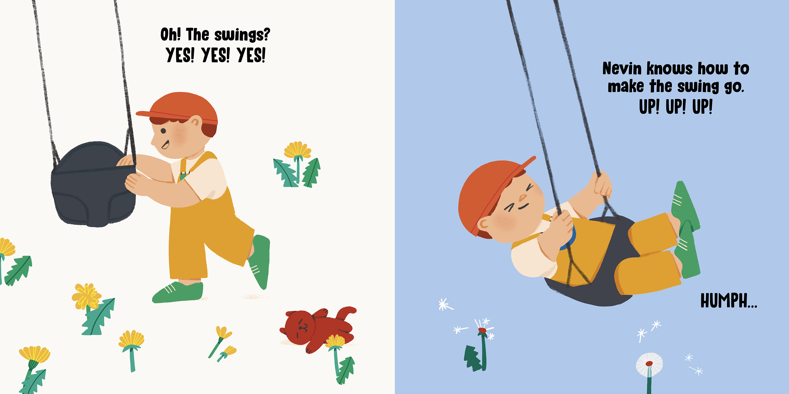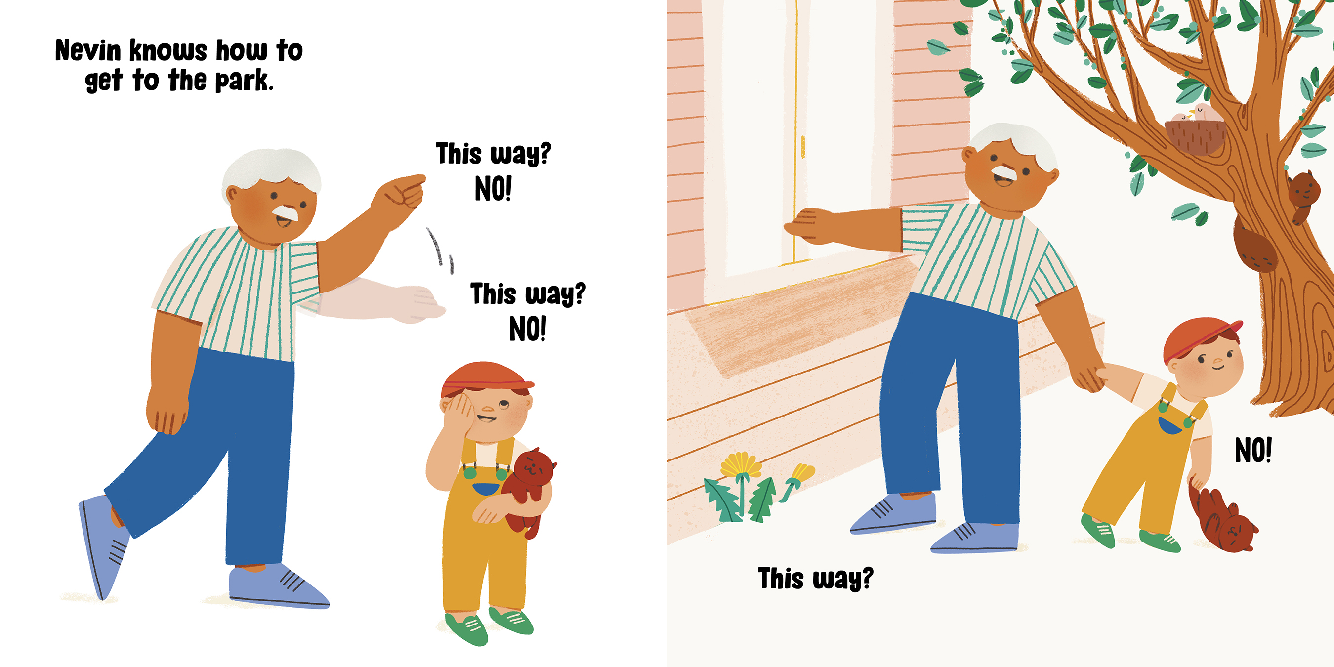 Should he wear boots? NO! Sandals? NO! Slippers? NO! Running shoes? YES! YES! YES! Throughout the book, Grandpa lets Nevin choose which direction to walk in, what to play on at the park and, finally, what flowers to bring home for Nana. Nevin has fun getting to choose for himself, and he shows Grandpa that he might be little, but he knows a lot.