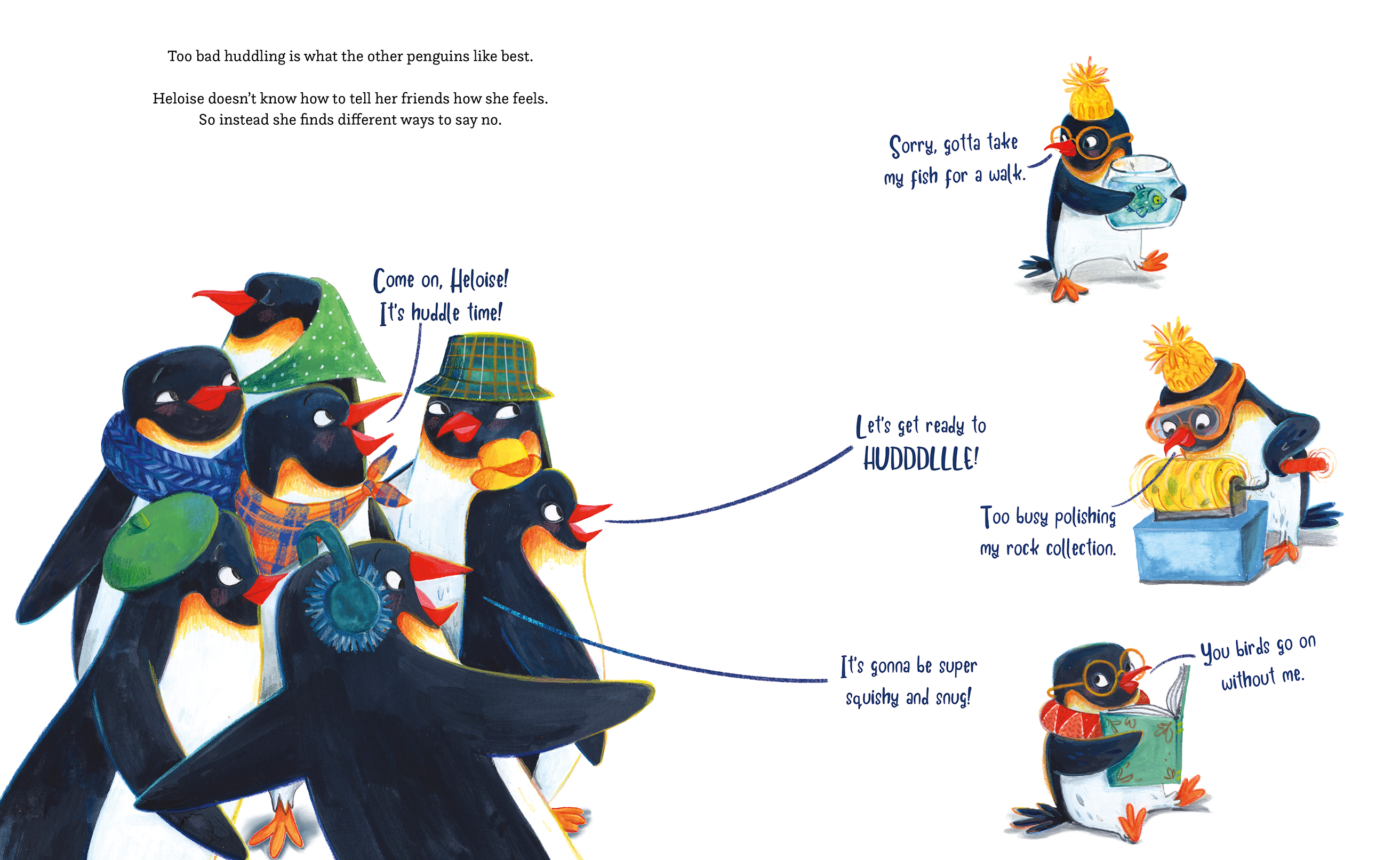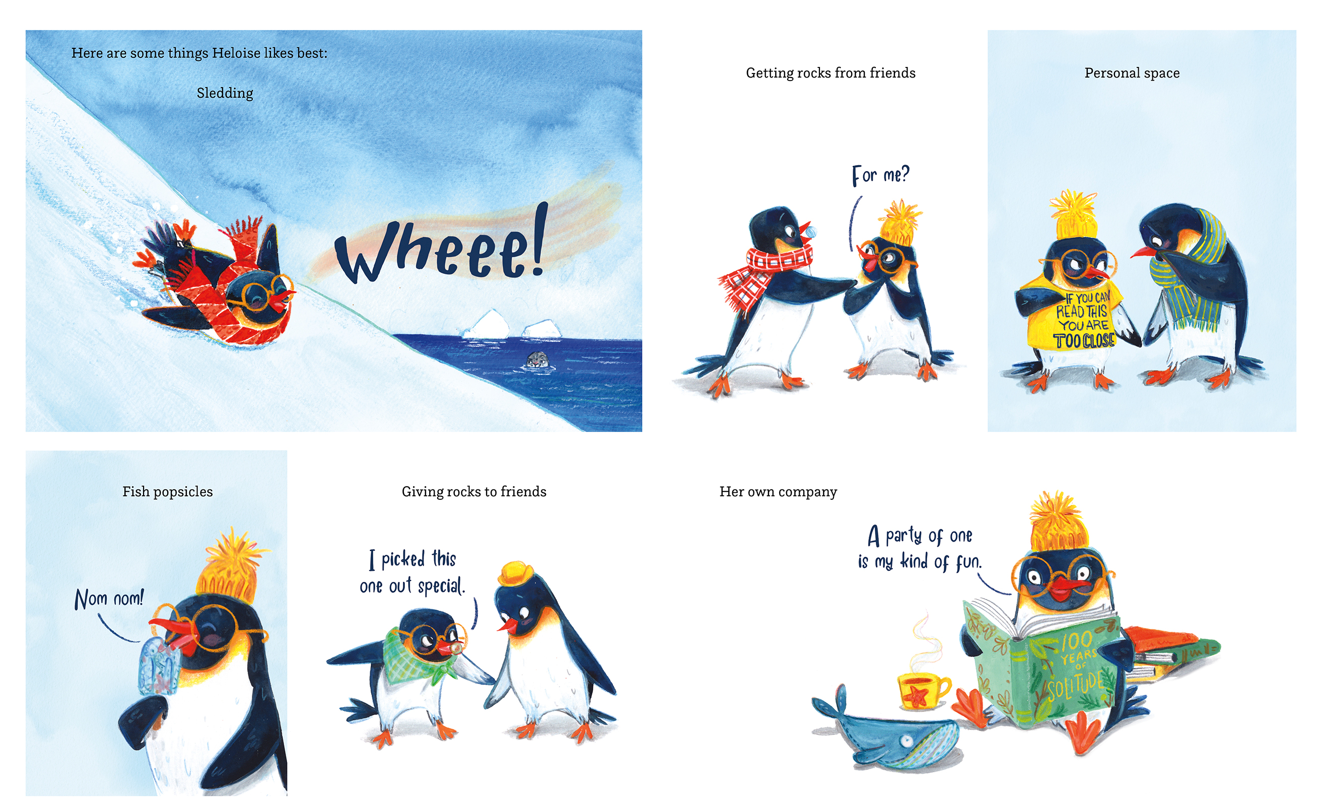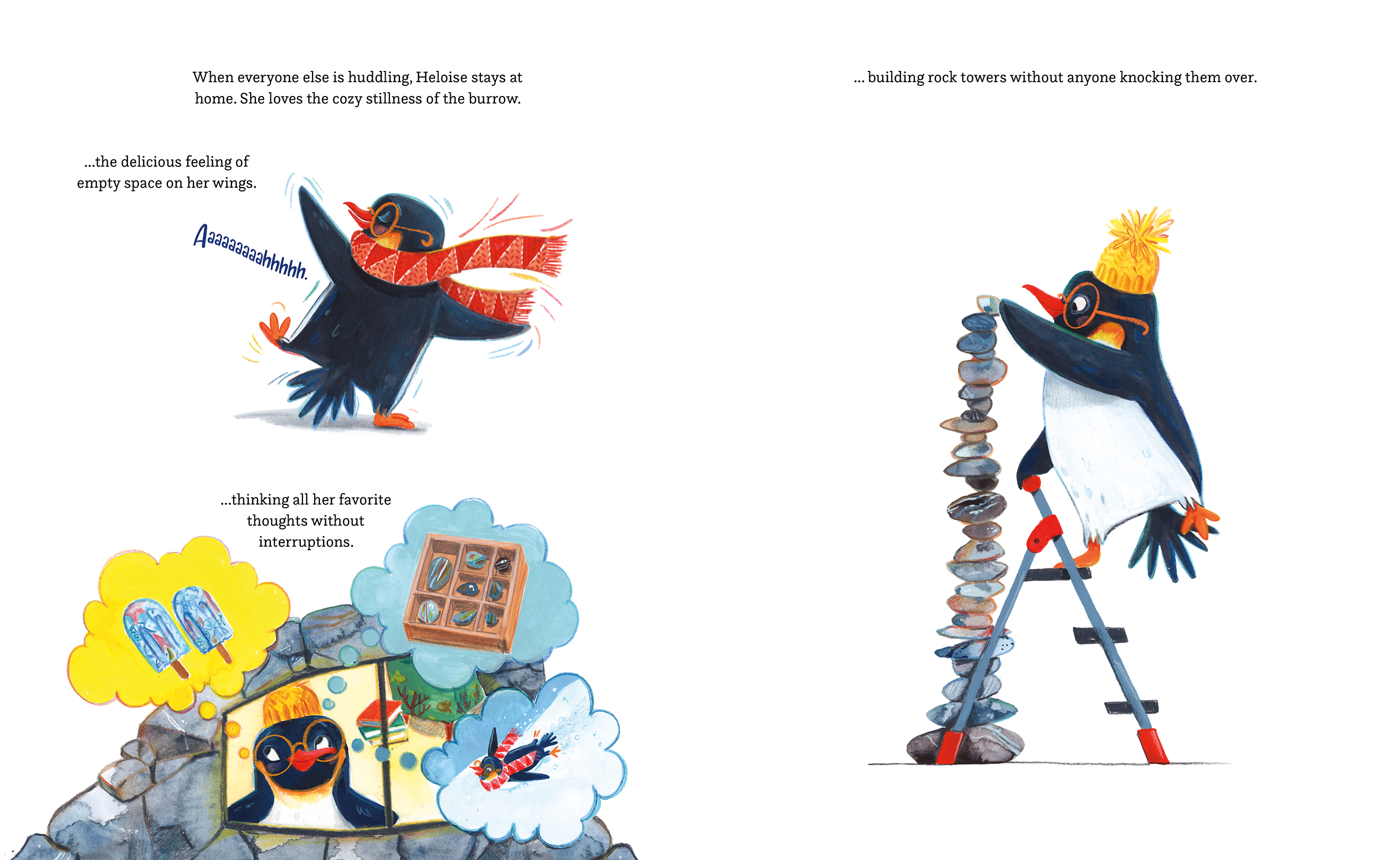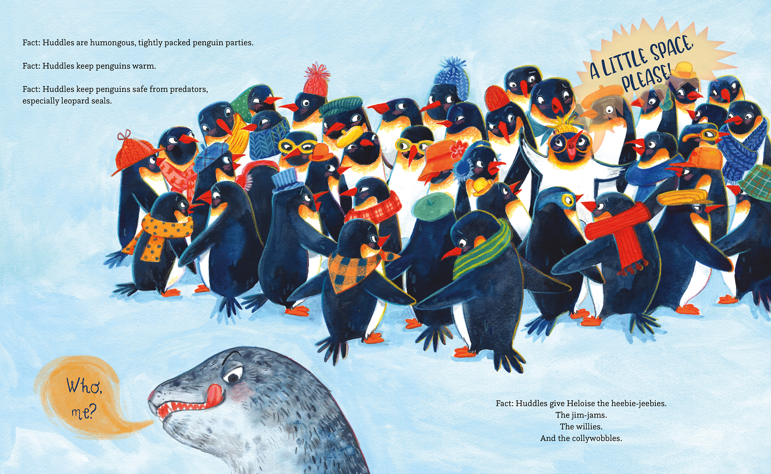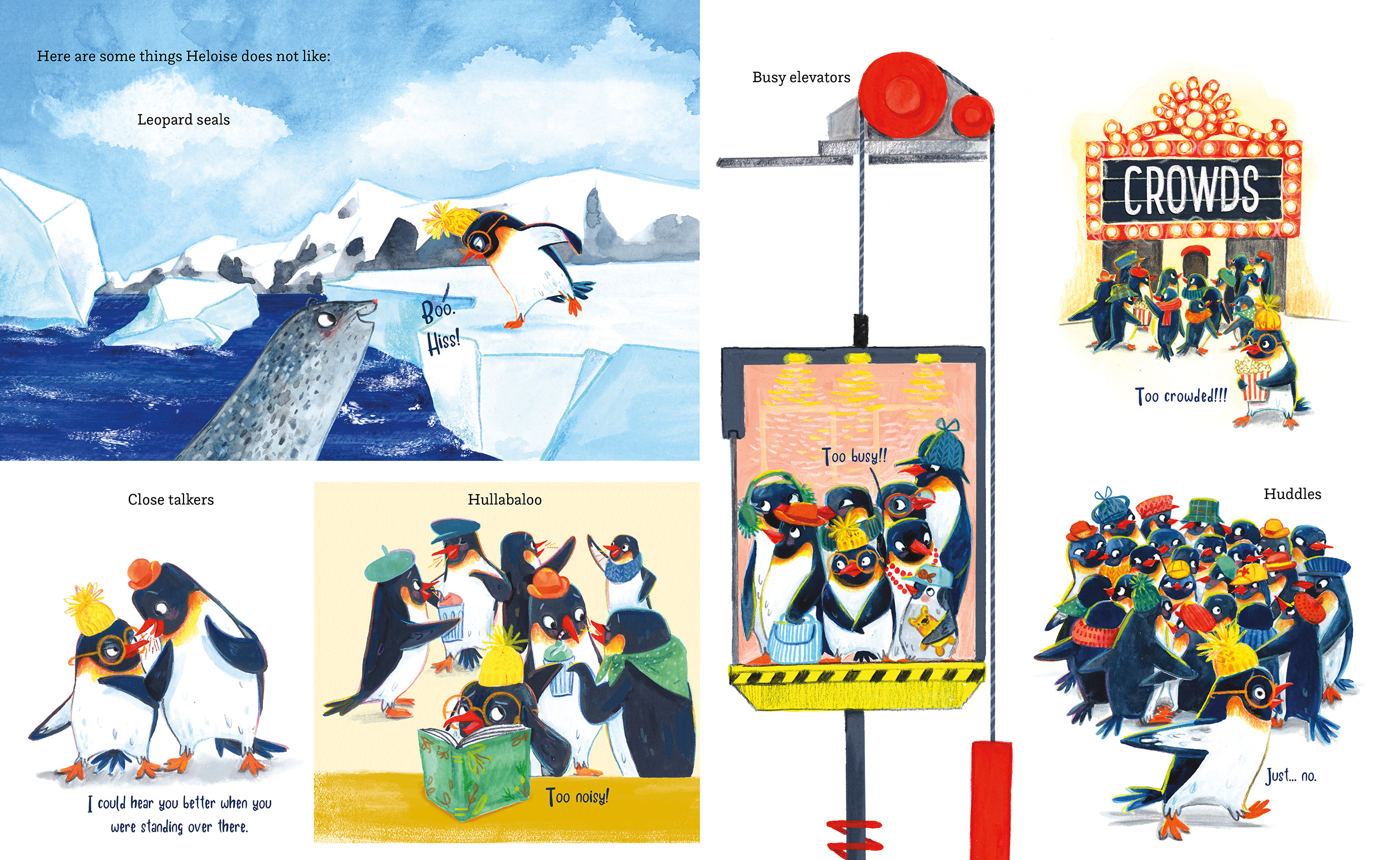 The problem is, huddles are a big part of being a penguin. Everyone gathers together to keep warm and stay safe from leopard seals. But huddles give Heloise the collywobbles! Heloise sets off to find others like her. Along the way, she meets other animals who don’t seem so friendly, and after a close brush with a leopard seal, Heloise realizes that she needs to get back to her community. Is there a way for Heloise to be a penguin and keep her personal space?