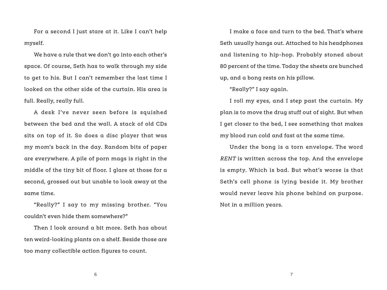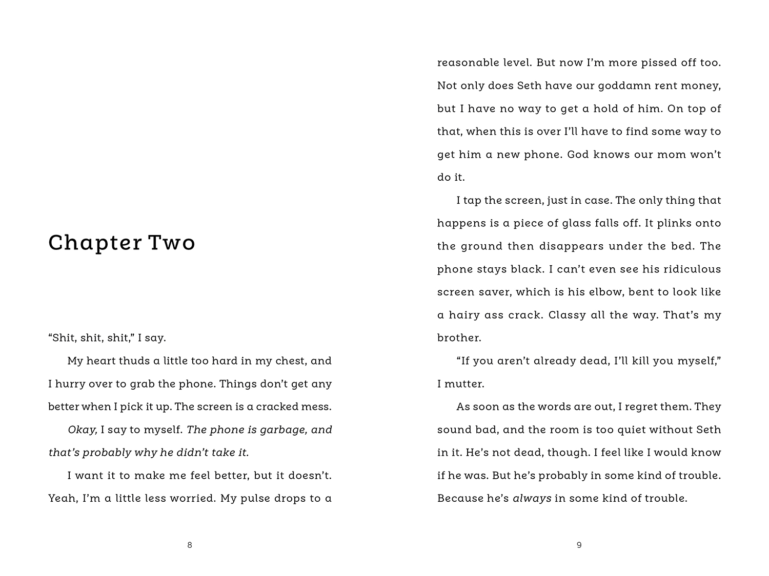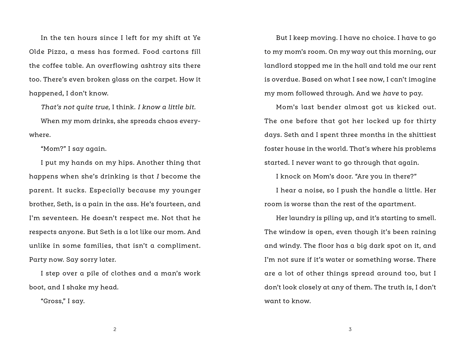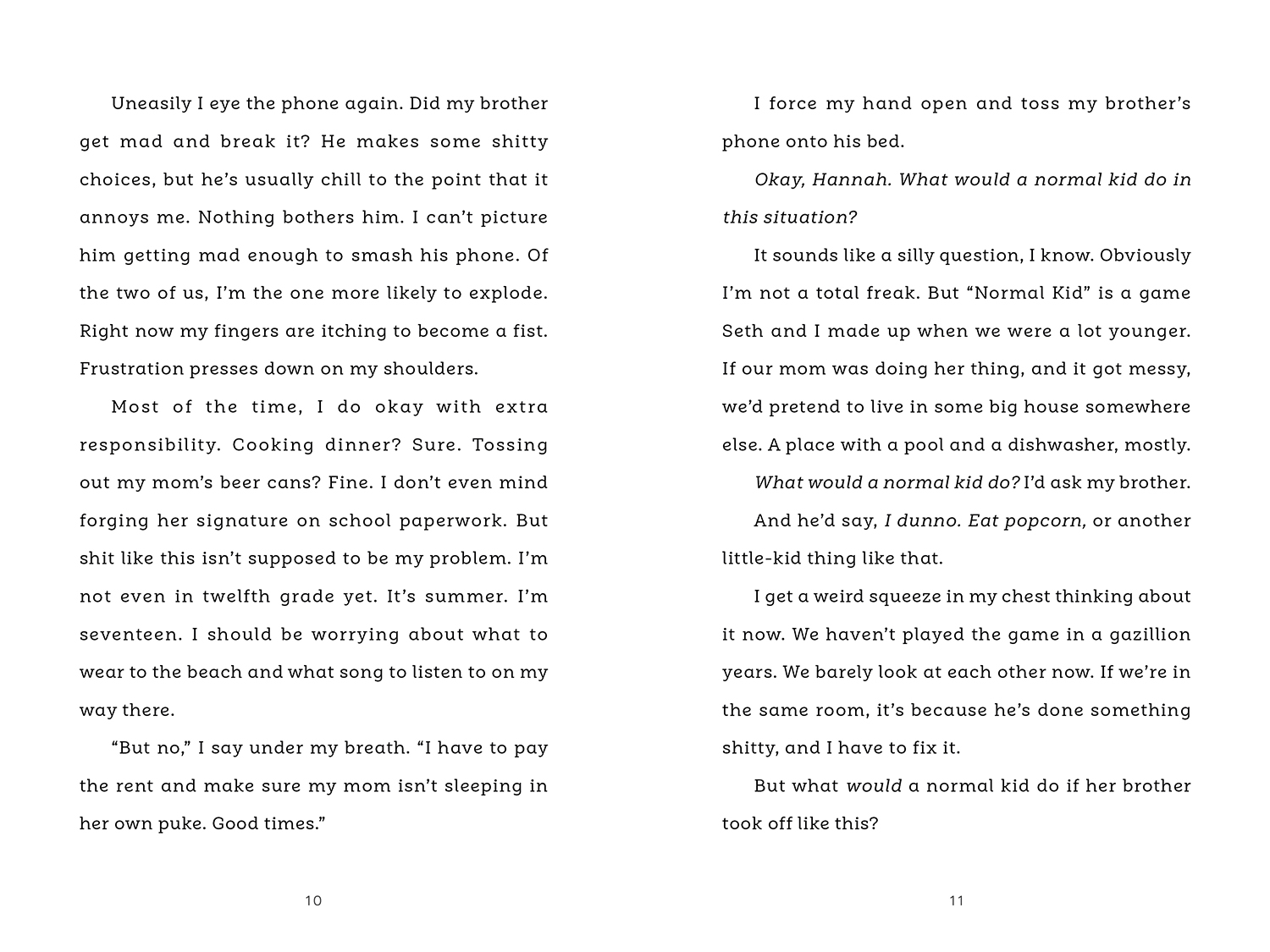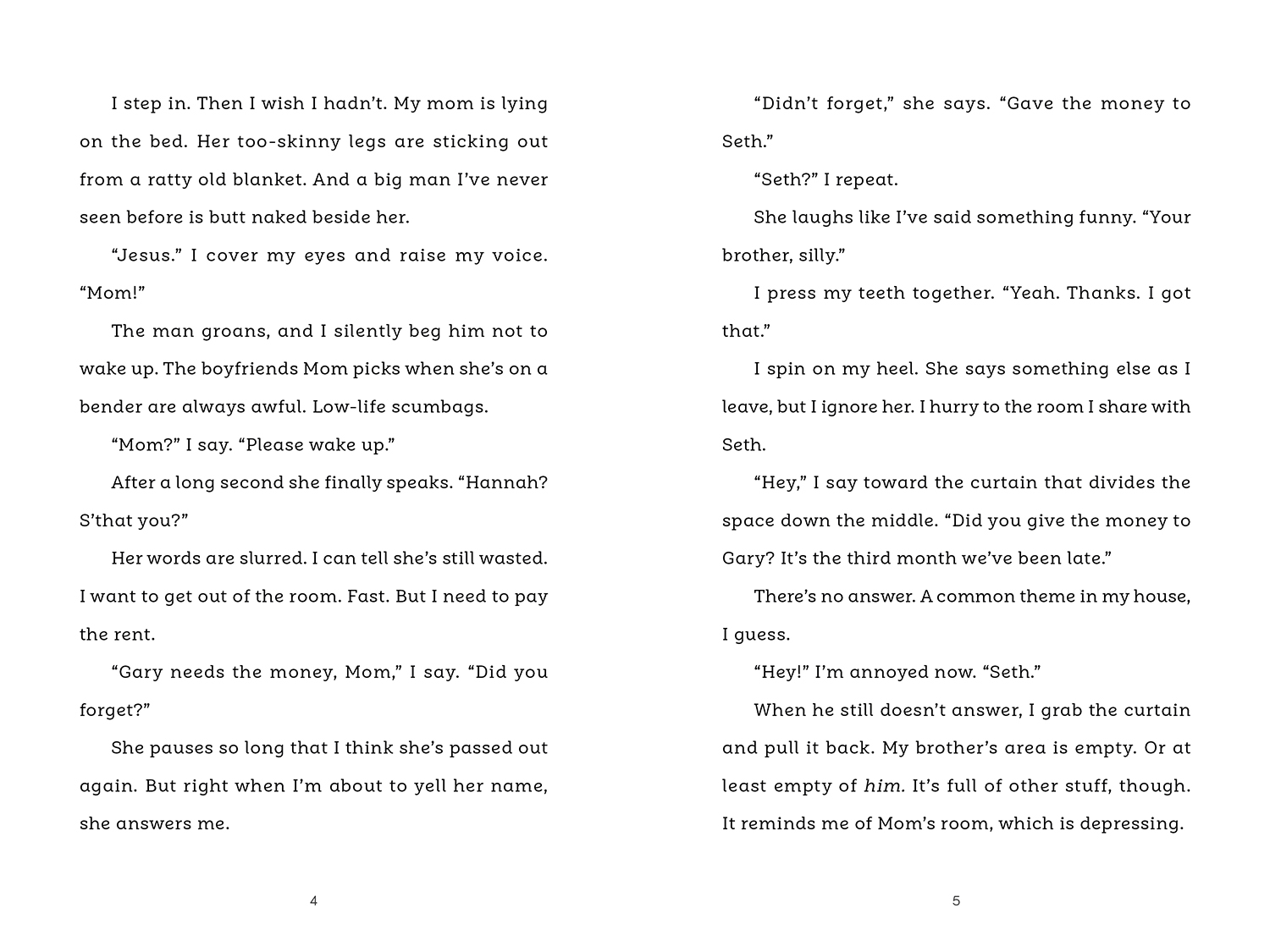 When Hannah comes home to find that her alcoholic mom is wasted, she’s not surprised. But when she discovers that her younger brother, Seth, has disappeared with the overdue rent money, she worries they’ll be evicted or taken away by social services. Hannah knows she can’t rely on anyone but herself, so she has no choice but to chase down her brother. During her search she meets charming Eli, who offers to help her. But can Hannah set aside her pride and learn to trust him?