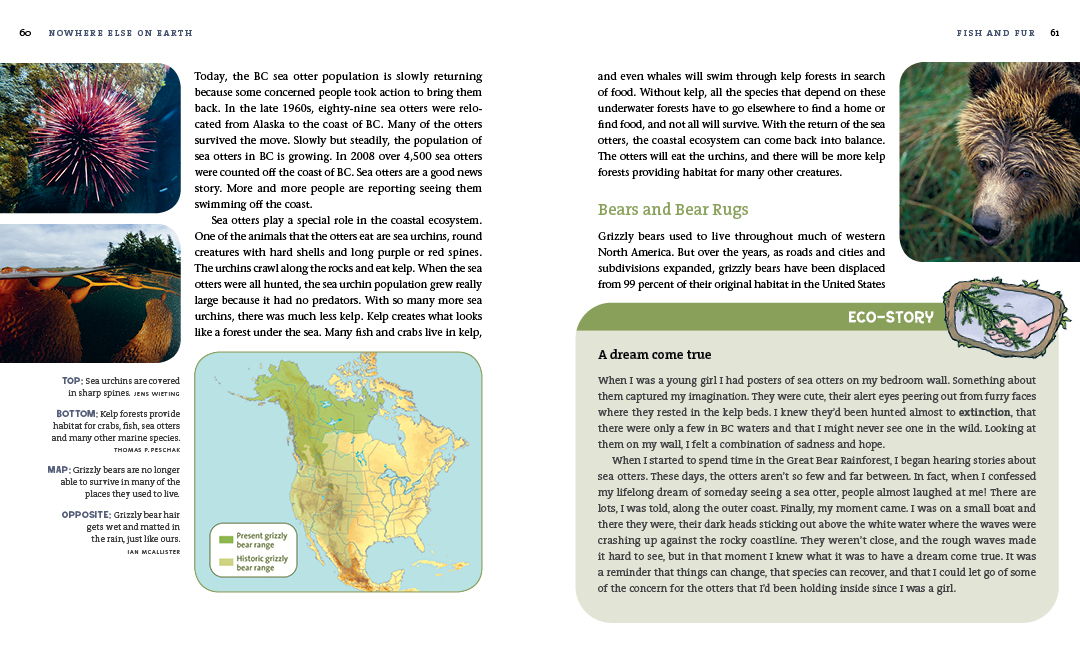 Visit http://www.greatbearrainforest.ca to find teacher and student resources, view the online photo gallery, or read a sample chapter from the book. To access the free teacher's guide for Nowhere Else on Earth, click here:http://orcabook.com/nowhereelseonearth/guides/teachersguide.pdf.