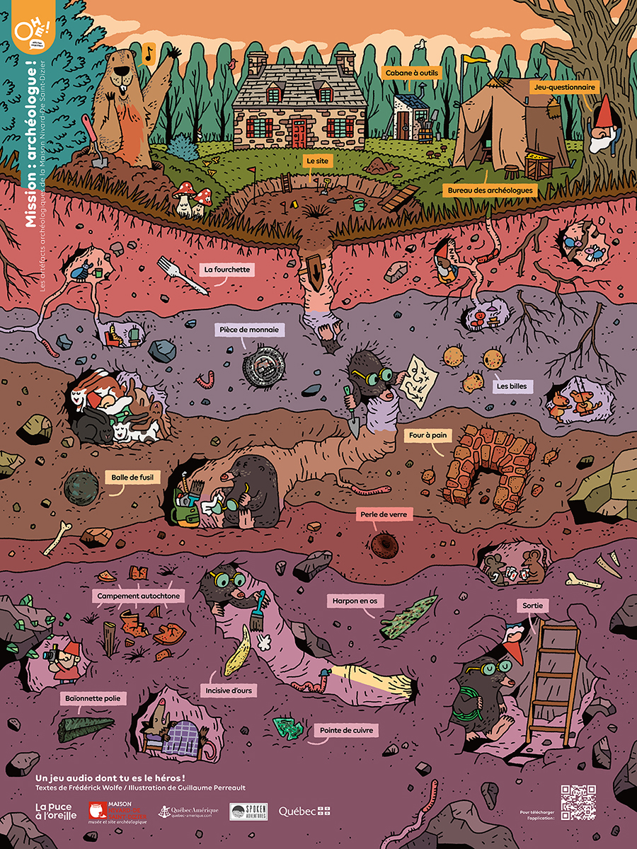 Mission : archéologue! est un jeu audio dont tu es le héros! Par la lecture à voix haute des mots inscrits sur l’affiche, tu déclencheras des quêtes interactives fonctionnant via la reconnaissance vocale. Et si tu prêtes bien attention, tu découvriras aussi plusieurs jeux surprises!