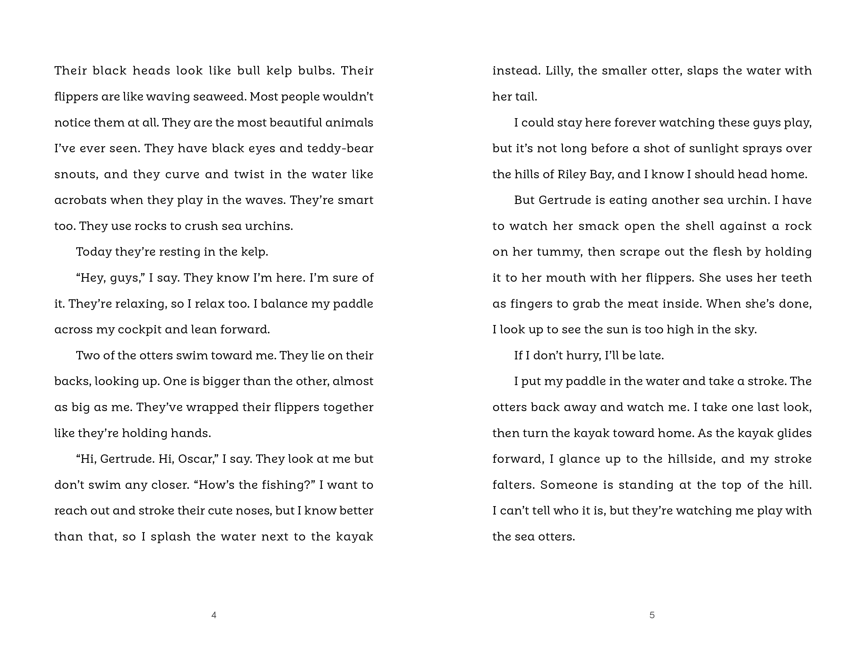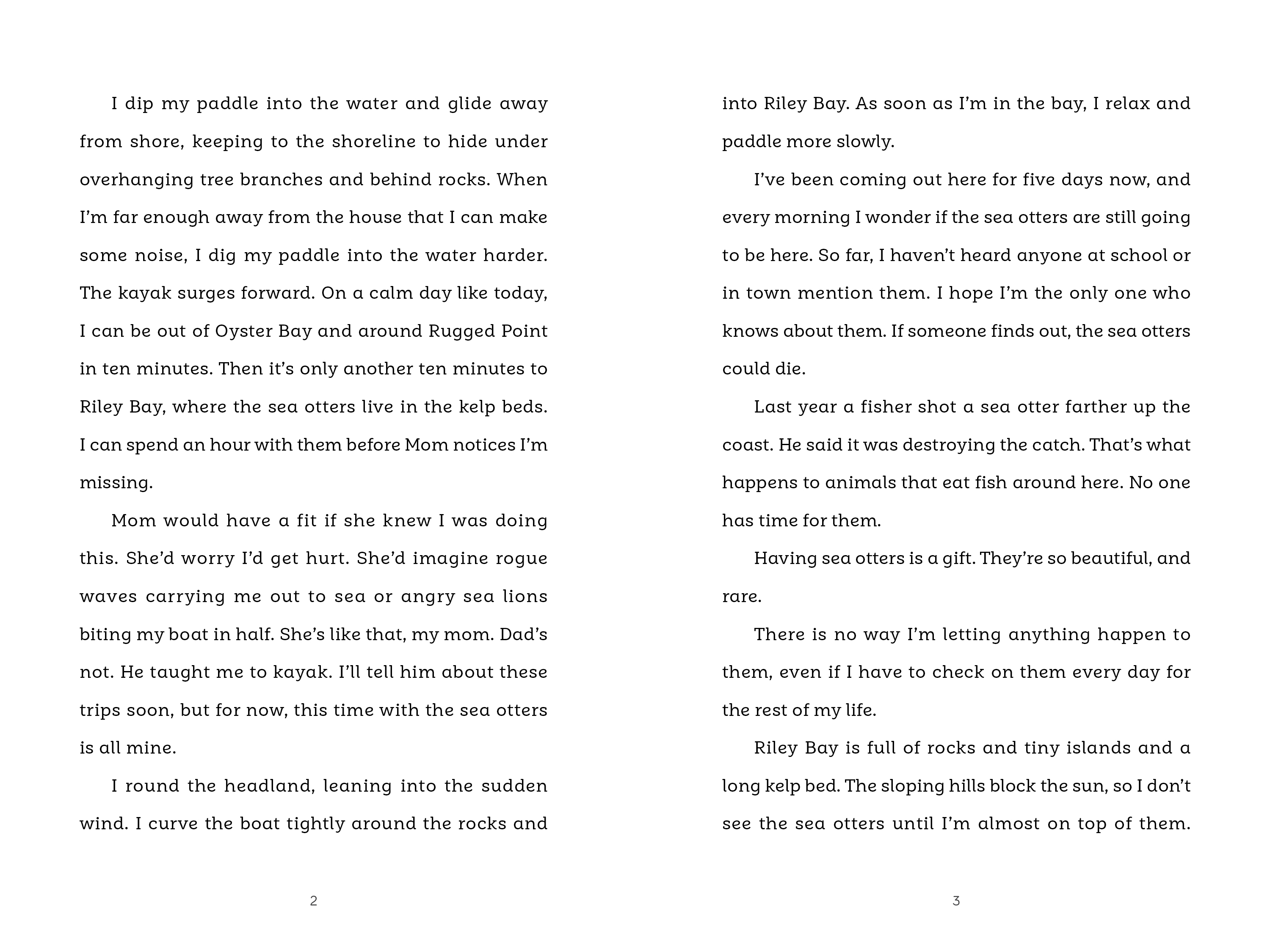 Fourteen-year-old Maya sneaks out in her kayak before breakfast every morning to check on a family of sea otters living in the nearby bay. The animals Maya loves threaten her family's main source of income, and Maya doesn't know if she can trust her family not to hurt them. She is determined to protect the sea otters, no matter what. One morning, Maya discovers she's being watched. Who is it and what do they want? Soon Maya finds herself in a dangerous race to save both the sea otters and her family's livelihood.