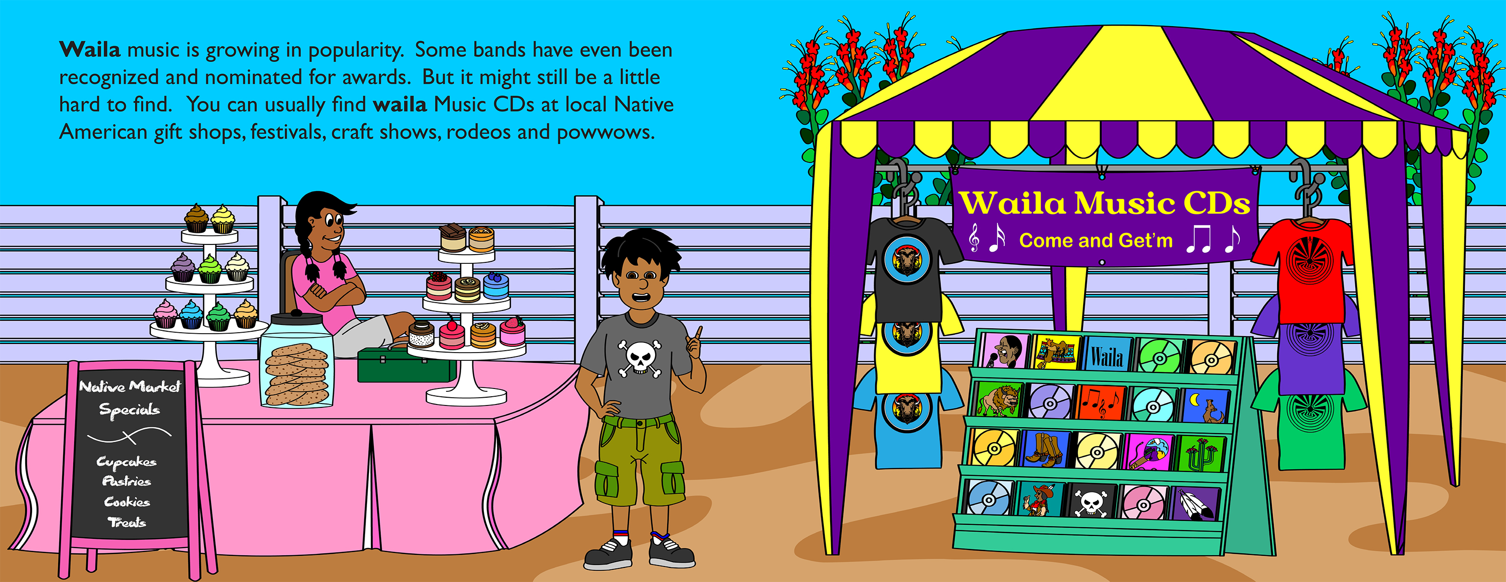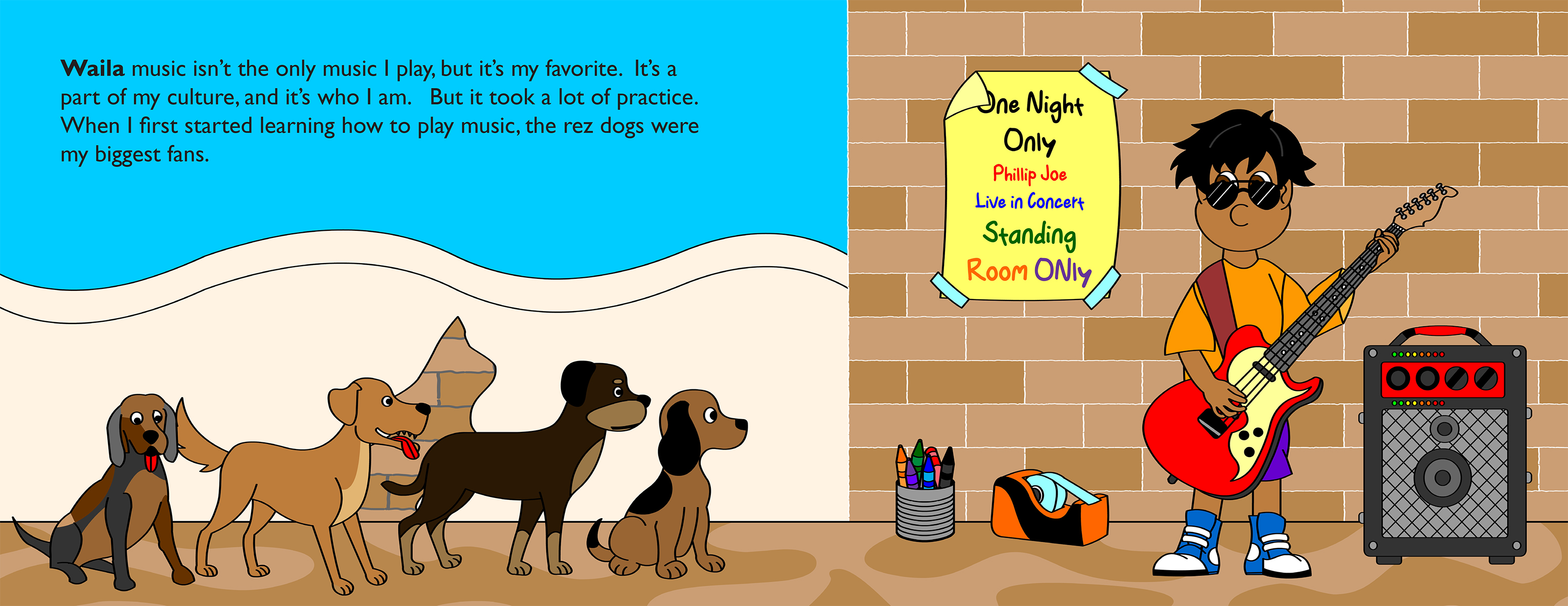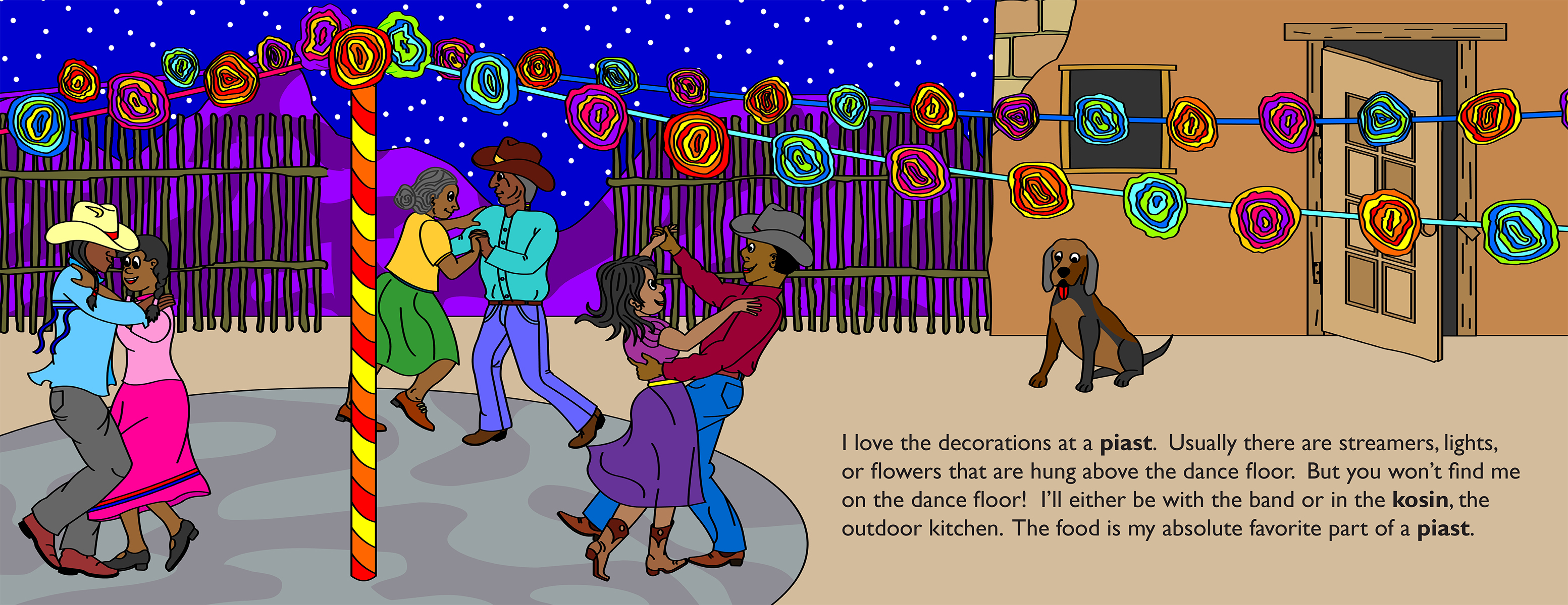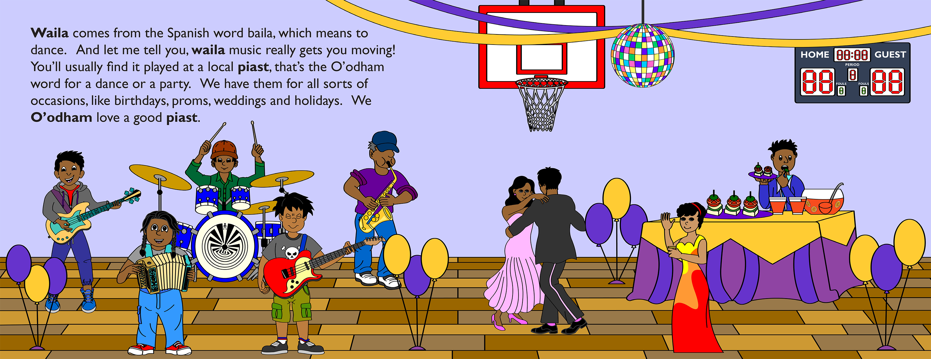 This lyrical and joyously illustrated bilingual book celebrates waila (why-la) dance music, a blend of Polish, German, Mexican dance music unique to the Tohono O’odham Nation in southern Arizona. As explained by protagonist Philip Joe, “waila music really gets you moving.” He learned as a child to play the multiple instruments that blend to create the fast moving, upbeat rhythms that are a part of every community piast (celebration) and continues to play in bands and teach young tribal members the exciting form of music.