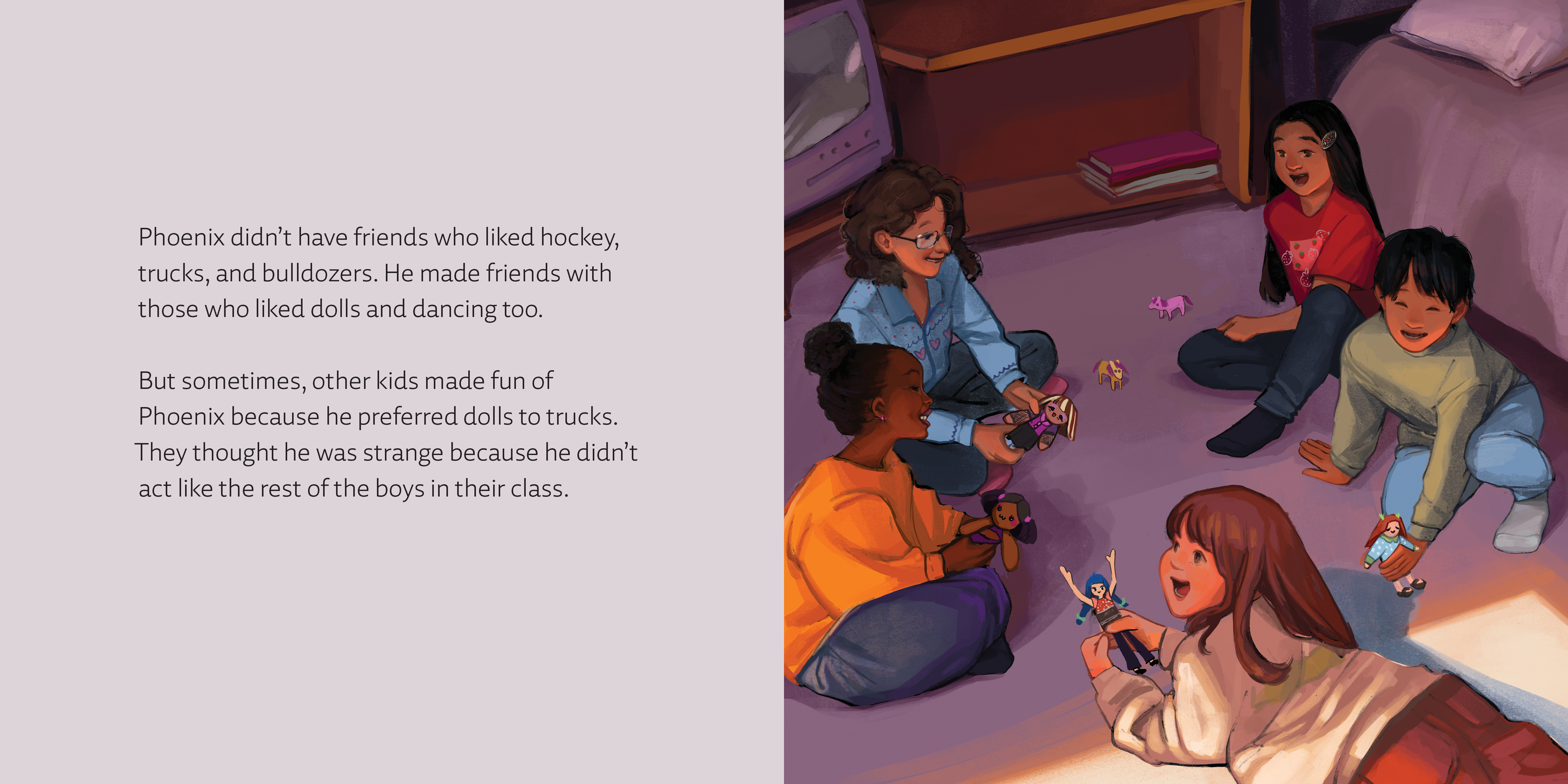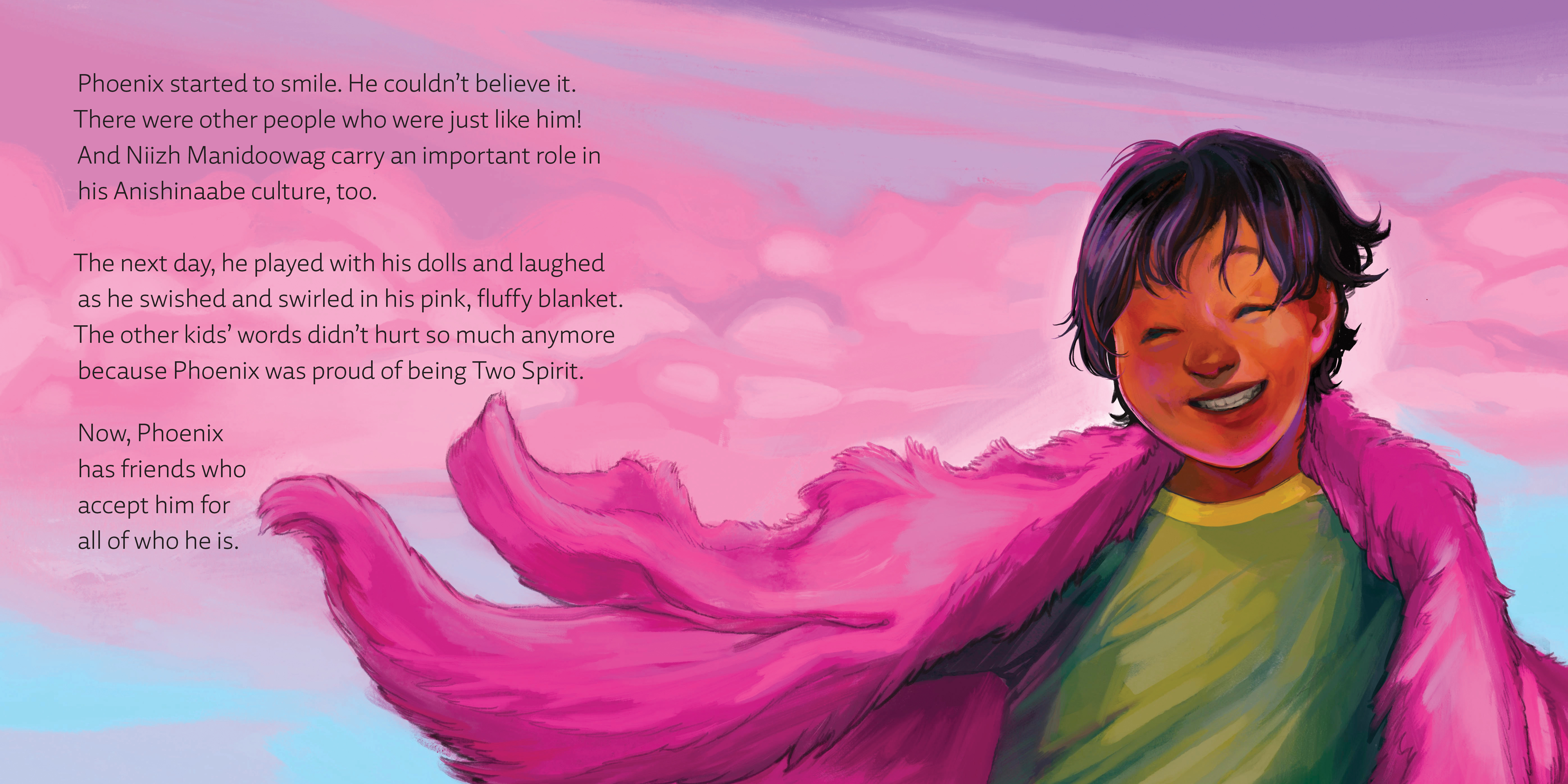 Phoenix loves to play with dolls and marvel at pretty fabrics. Most of all, he loves to dance—ballet, Pow Wow dancing, or just swirling and twirling around his house. Sometimes Phoenix gets picked on and he struggles with feeling different, but his mom and brother are proud of him. With their help, Phoenix learns about Two Spirit/Niizh Manidoowag people in Anishinaabe culture and just how special he is.