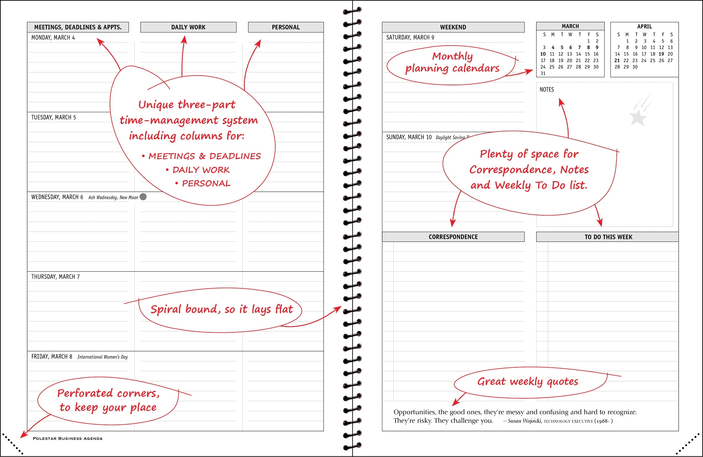 - PLANNING MADE EASY—monthly, weekly and daily planning capabilities for meetings, deadlines, appointments, correspondence, to-do lists and personal tasks.