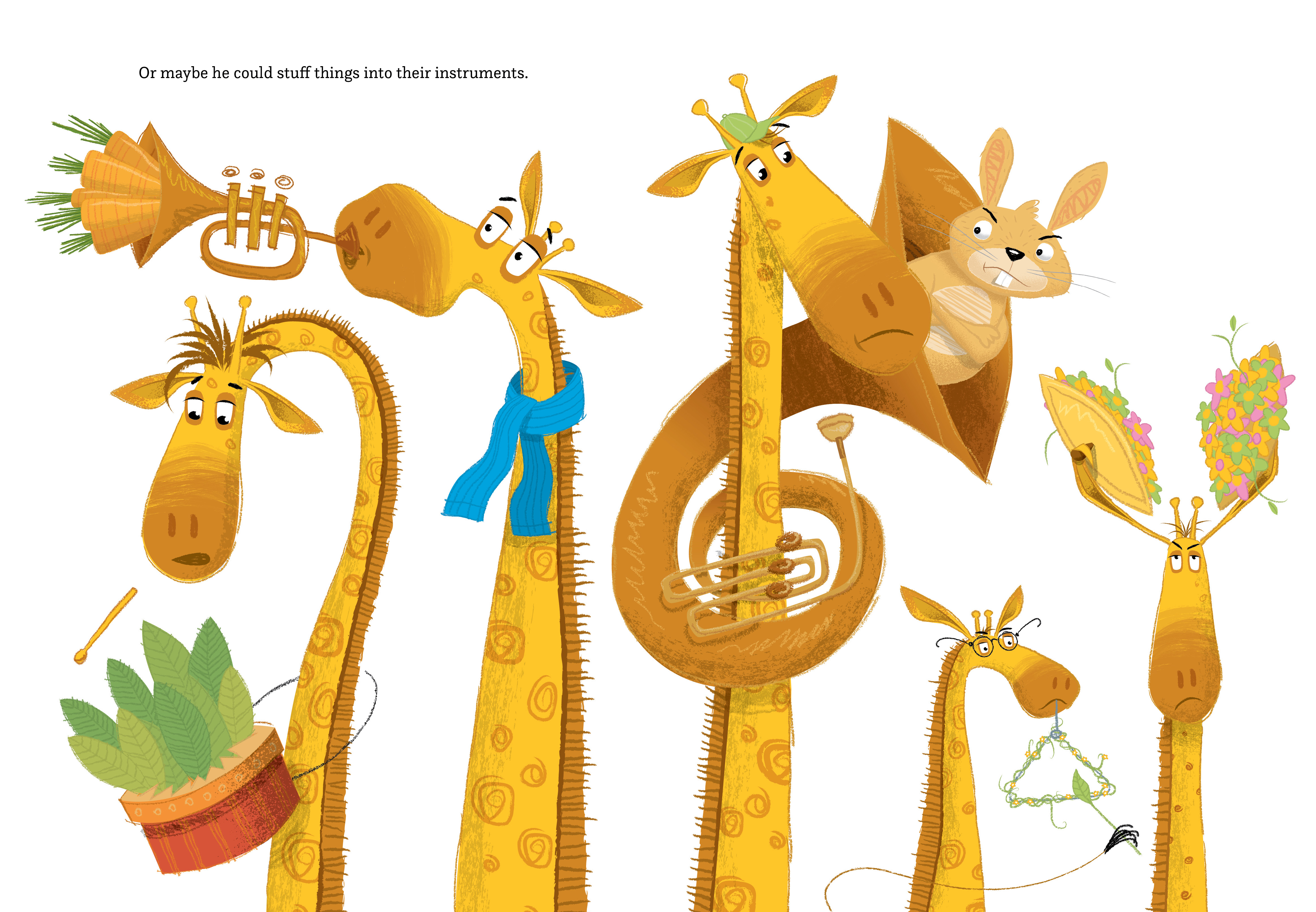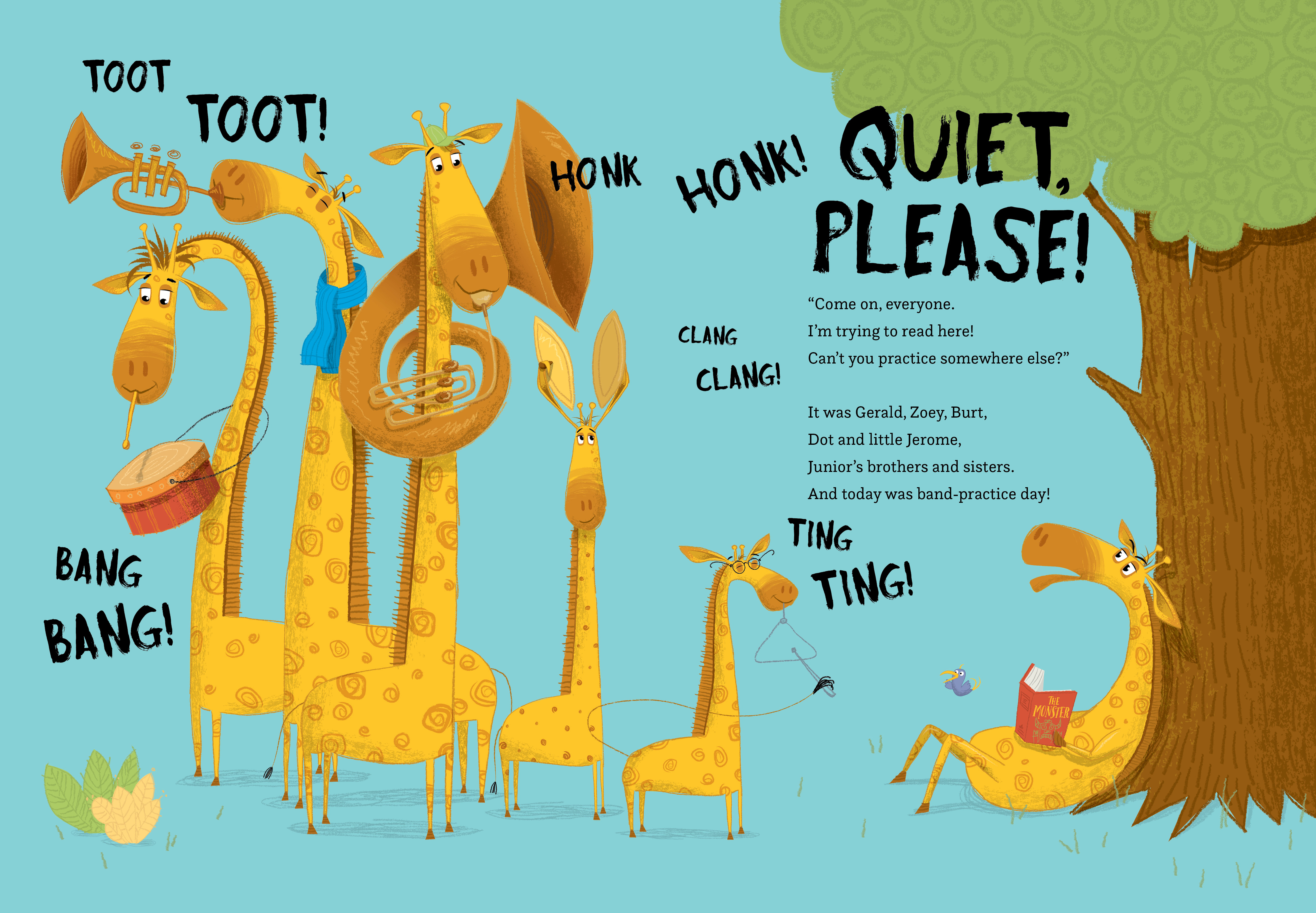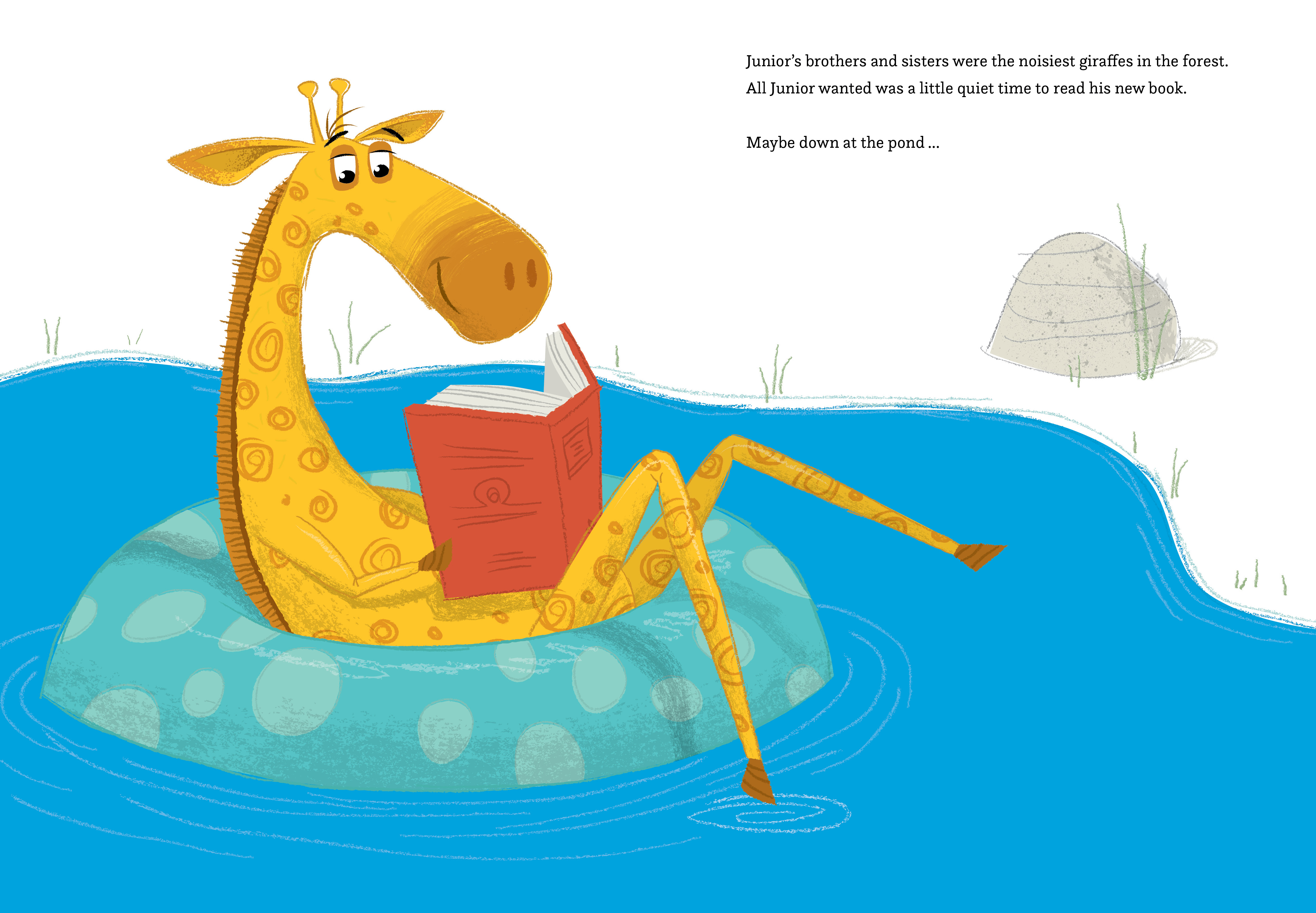 But there is one problem (actually, five problems): Junior’s brothers and sisters are the noisiest giraffes in the jungle! Whether it’s band practice, family singalongs or just really loud burping, Junior can’t escape the noise of his sonorous siblings! In an act of desperation, he finally discovers the one thing that will keep them quiet: reading his book out loud.