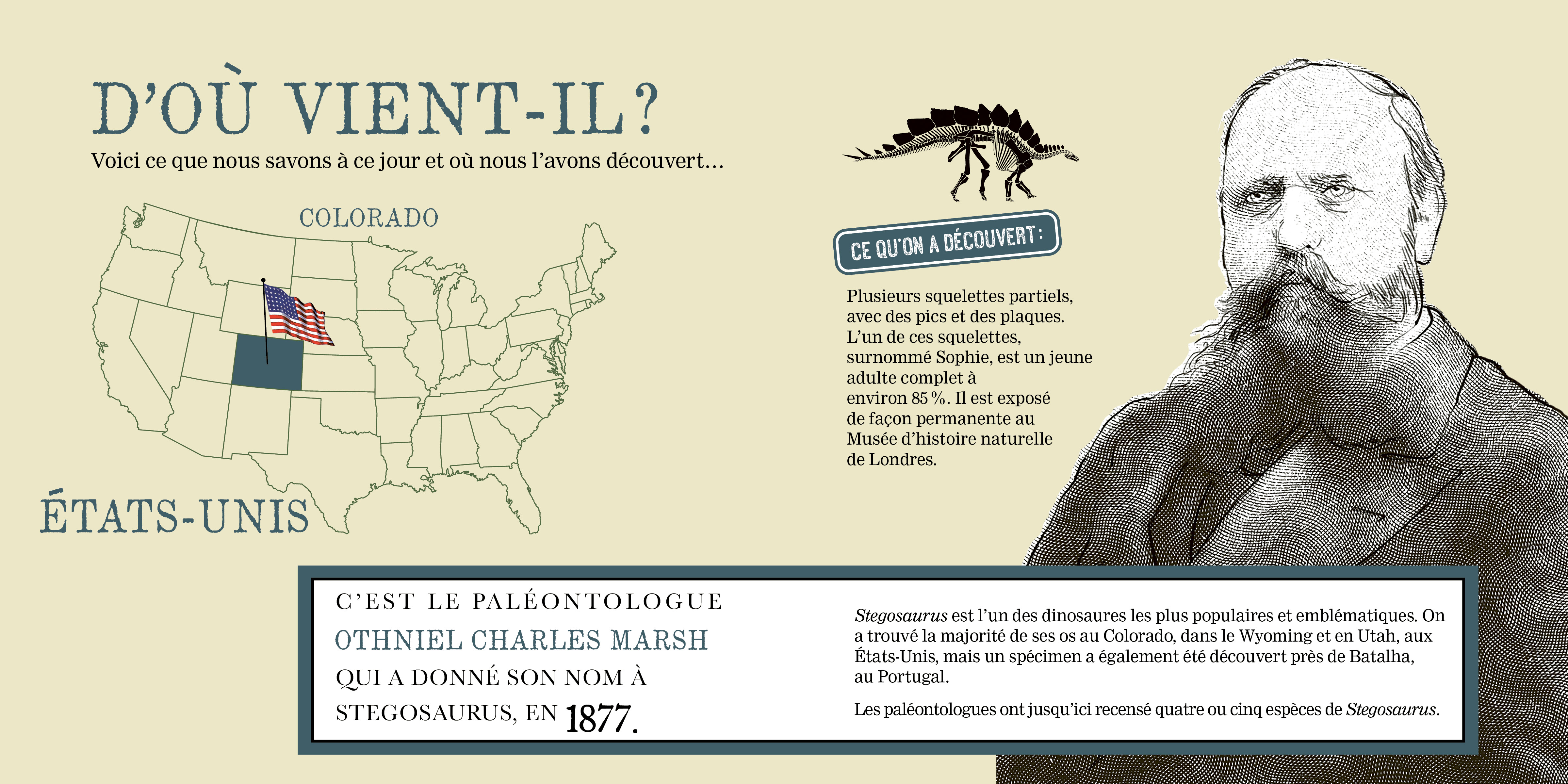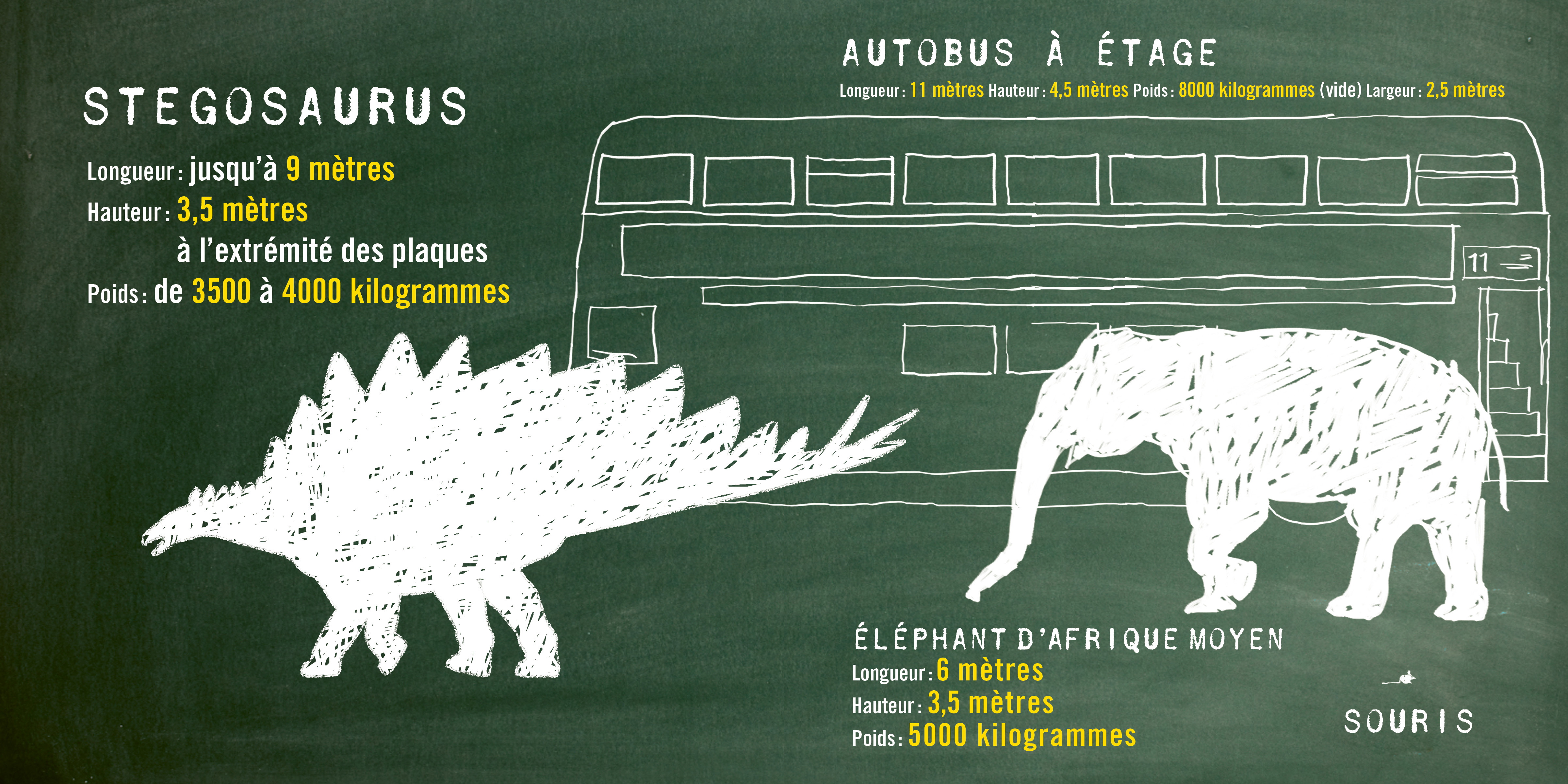 Savais-tu que… Stegosaurus peut être décrit comme un dinosaure ayant un corps presque aussi gros qu’un autobus, une tête de la taille d’un cheval et un cerveau petit comme une noix de Grenoble? Si cela paraît bien étrange, tu découvriras dans les prochaines pages comment cette drôle de combinaison arrivait à fonctionner...