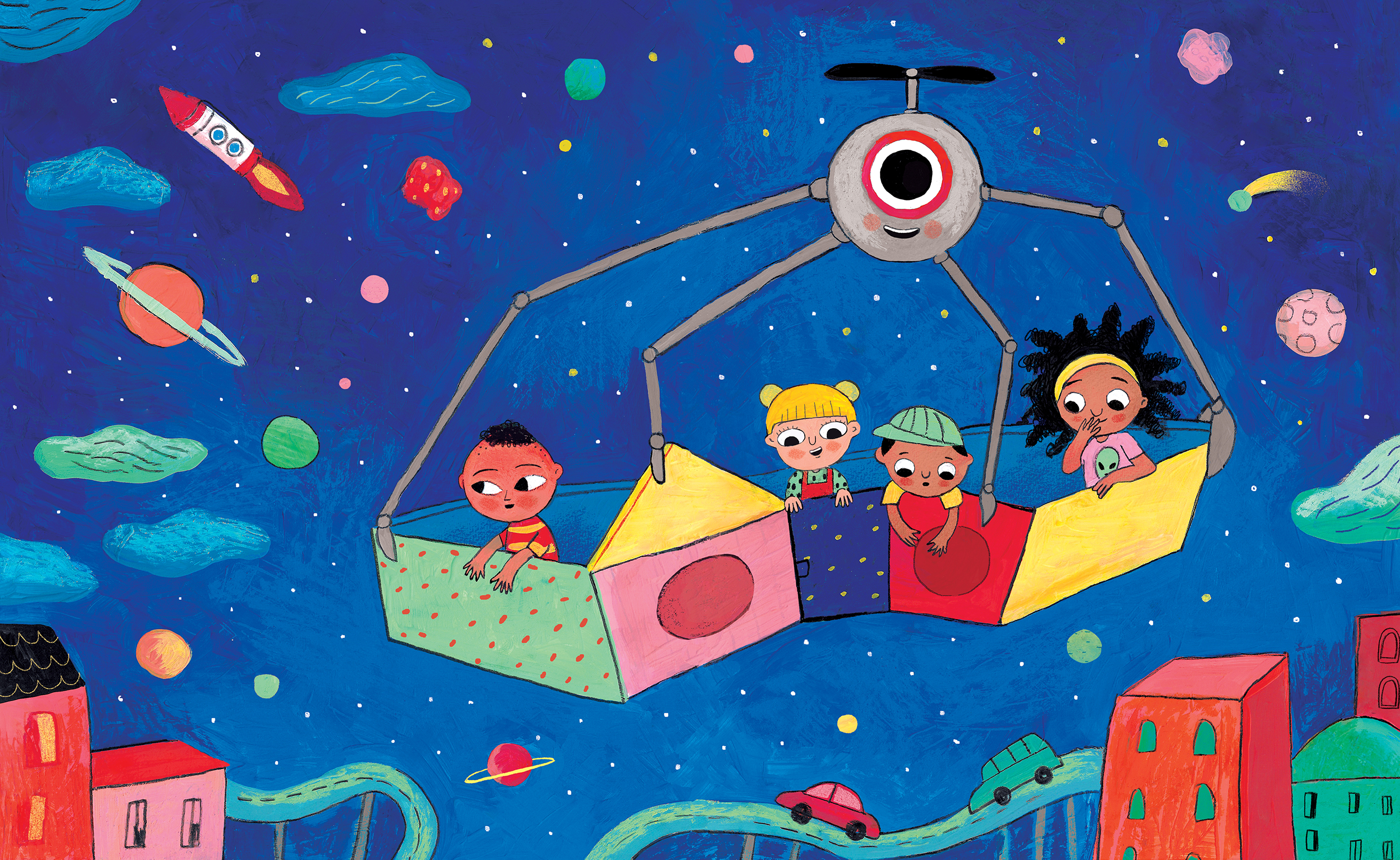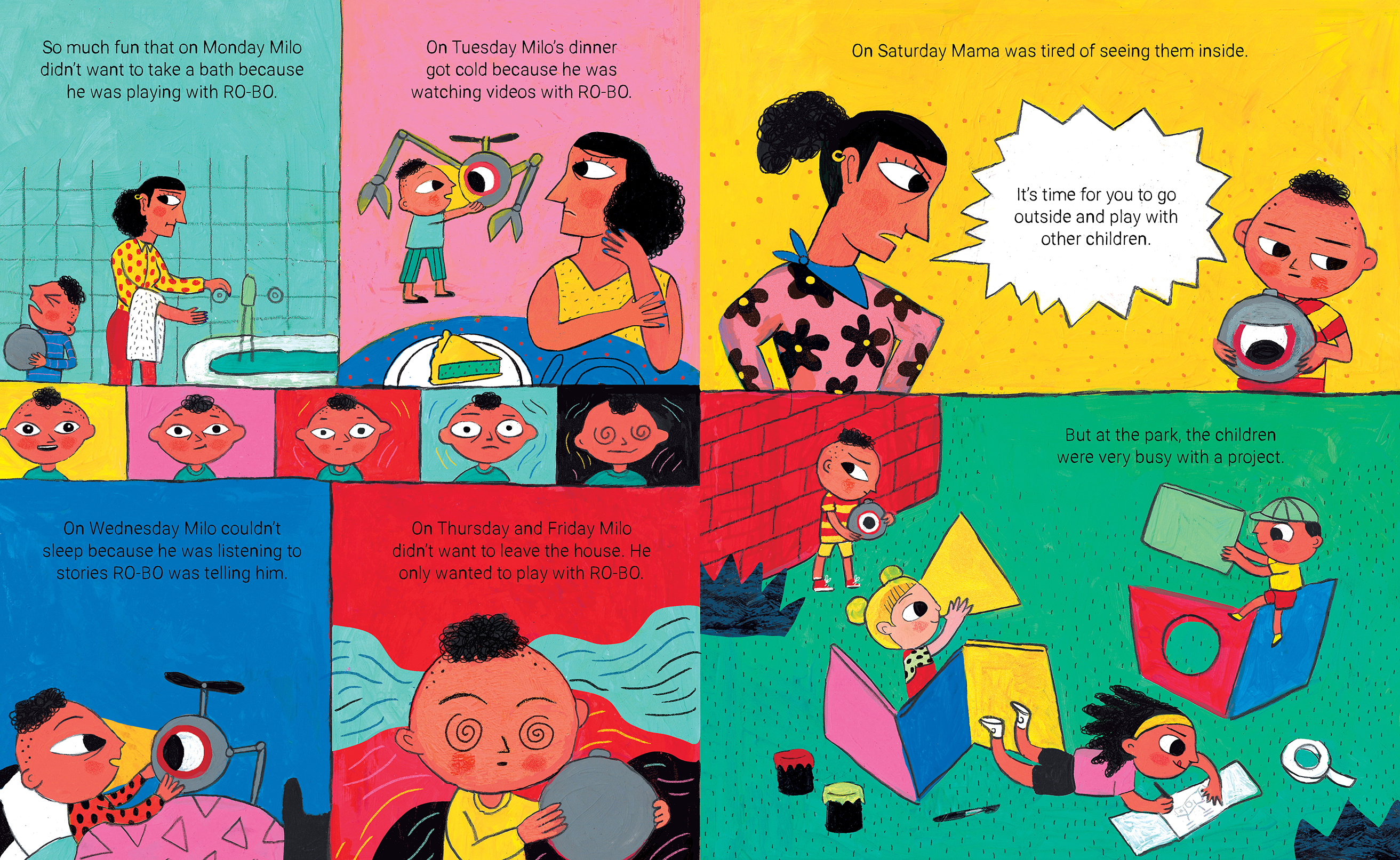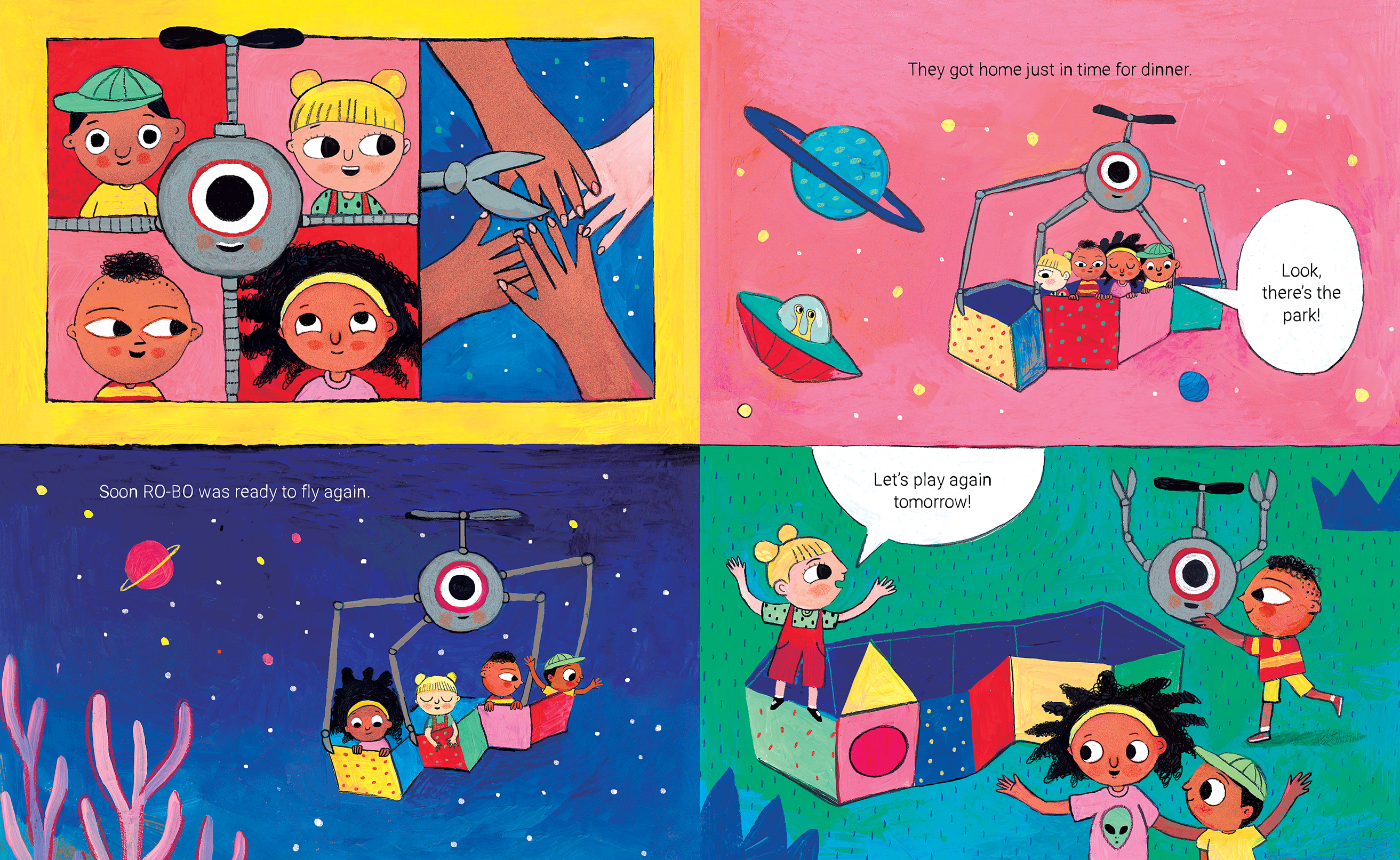 Milo only wants to spend time with his new robot, and together they play video games, listen to stories and learn new skills, like how to make breakfast. Then Milo’s mother insists he go outside to play with other kids. RO-BO can help with that too! Soon Milo and some new friends are building a spaceship together, and RO-BO steps in to take them on a great adventure to another world. But disaster strikes when RO-BO uses too much energy and its batteries run down. It seems like hope is lost until the friends start playing catch with RO-BO and its battery charges through kinetic energy. By working together, the new friends find their way home and plan for their next amazing adventure.