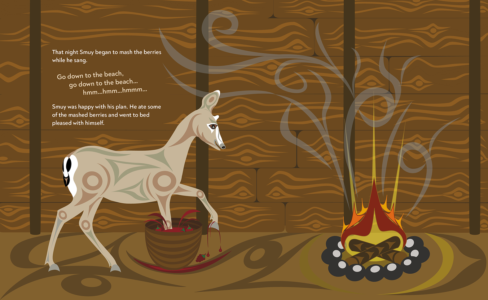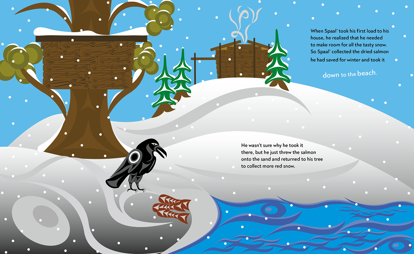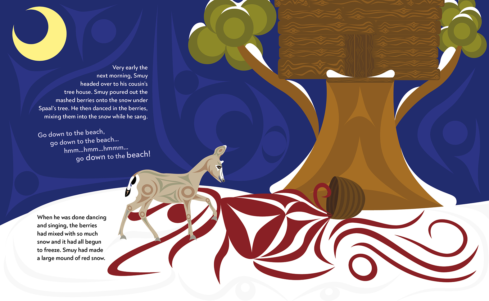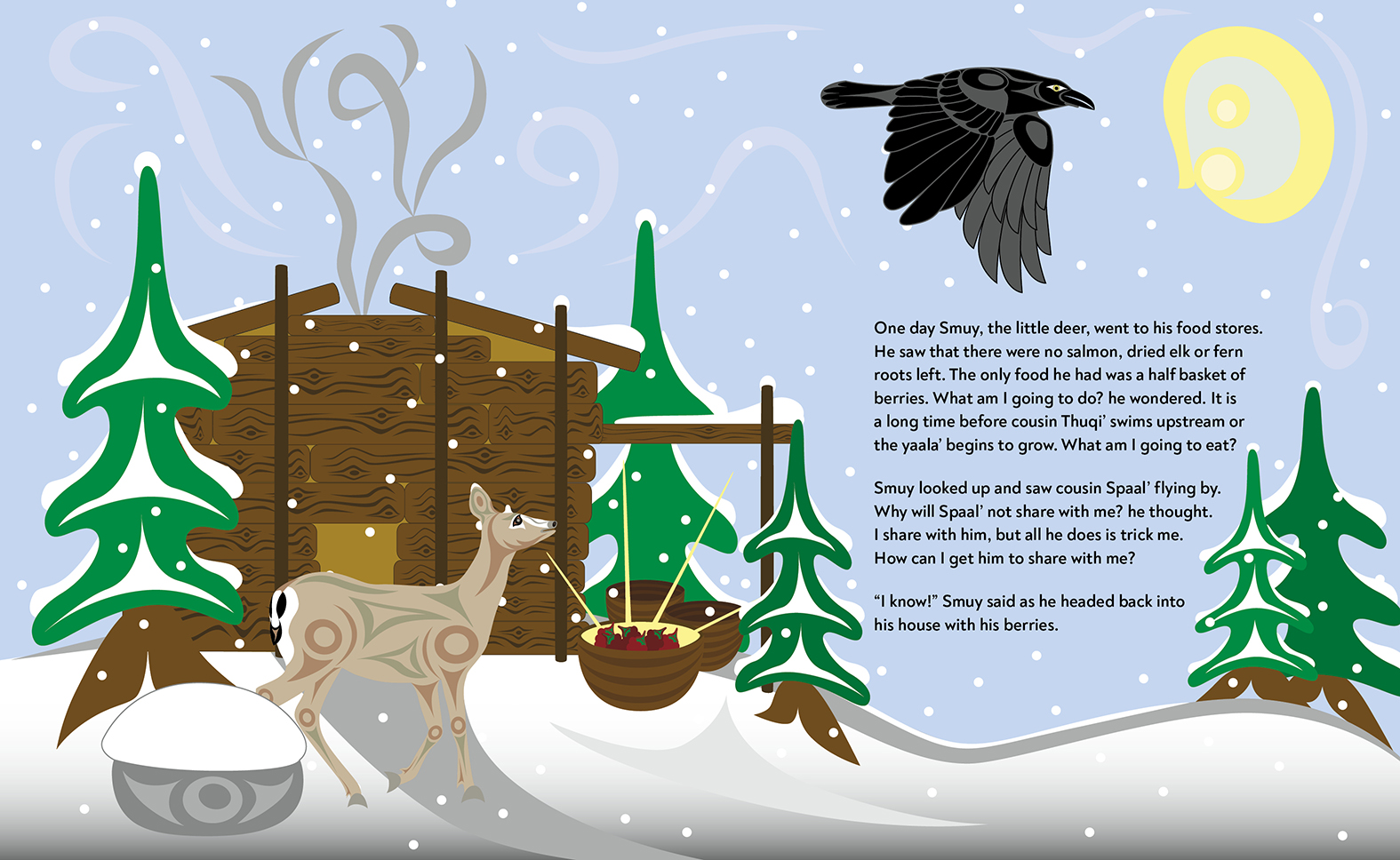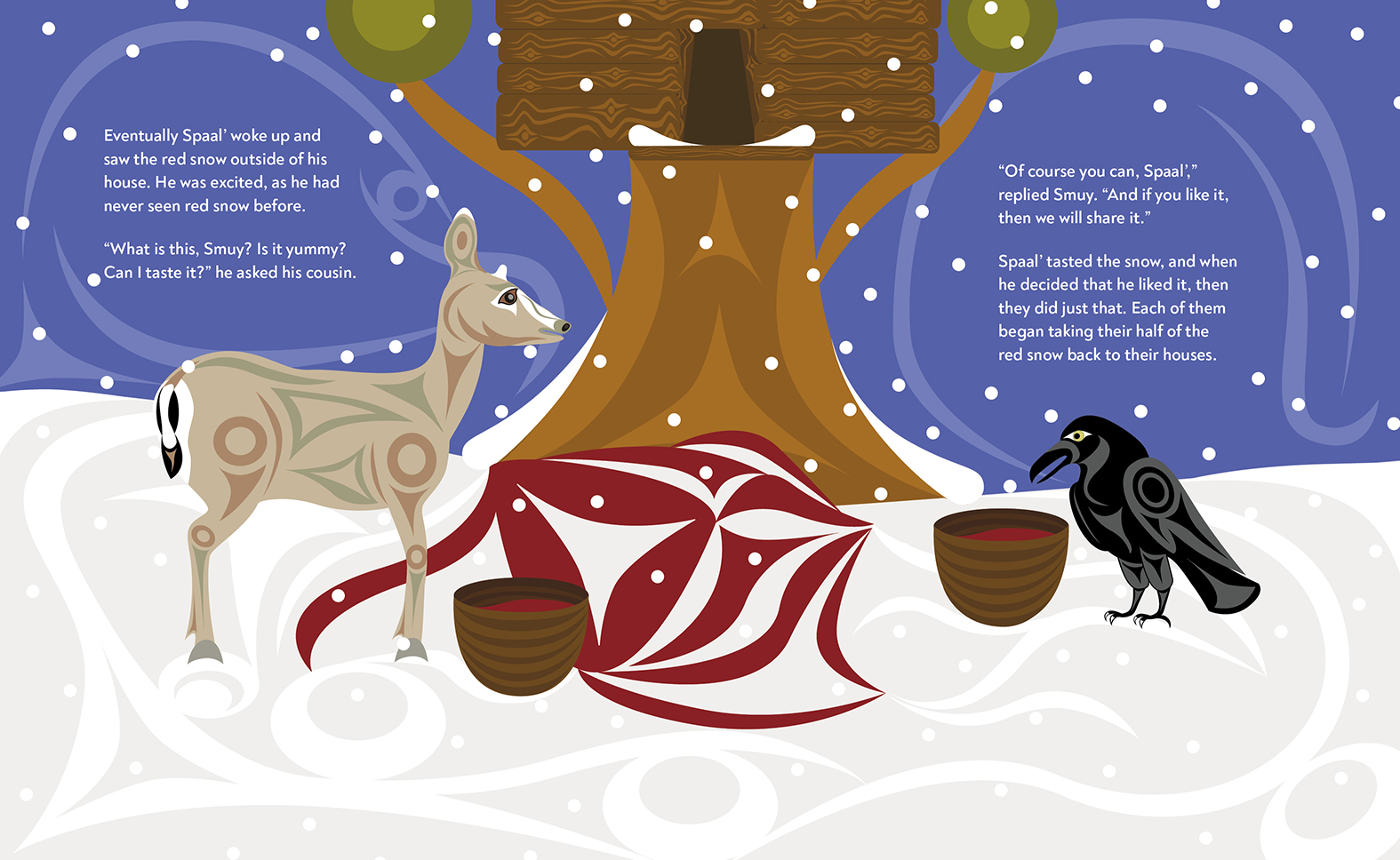 Smuy the little deer is almost out of food and wishes Spaal' the raven would share with him. But even though Smuy always offers to share with Spaal', Spaal' only ever tricks Smuy in return. So Smuy decides to try something new. He mashes the last of his stored berries and mixes them into the snow outside. Spaal' notices the delicious-looking red snow and asks to taste some. Smuy agrees, but this time he is prepared for Spaal's tricks and is ready with a little trick of his own—one that will ensure that both animals are warm and fed for the winter.