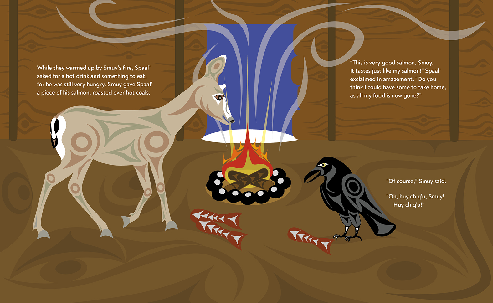 In this Traditional Story set in Coast Salish Traditional Territory, author and artist Andrea Fritz uses Indigenous storytelling techniques and art to share the culture and language of the Hul’q’umi’num’-speaking Peoples. This is the third book in the Coast Salish Tales, following Otter Doesn't Know and Crow Helps a Friend.