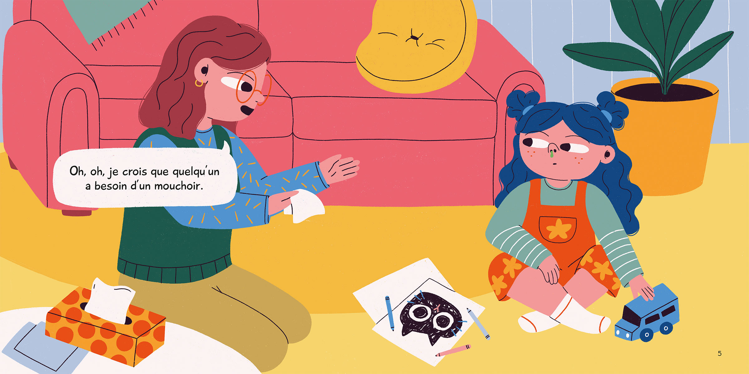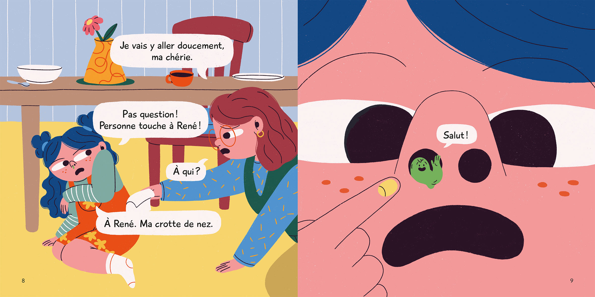 Ludique et gluante, l’histoire de la débrouillarde Pauline qui ne veut pas se moucher ressemble à celle de bien des enfants! Quand Pauline tente d’échapper à sa mère qui voudrait la moucher, la fillette est ferme :