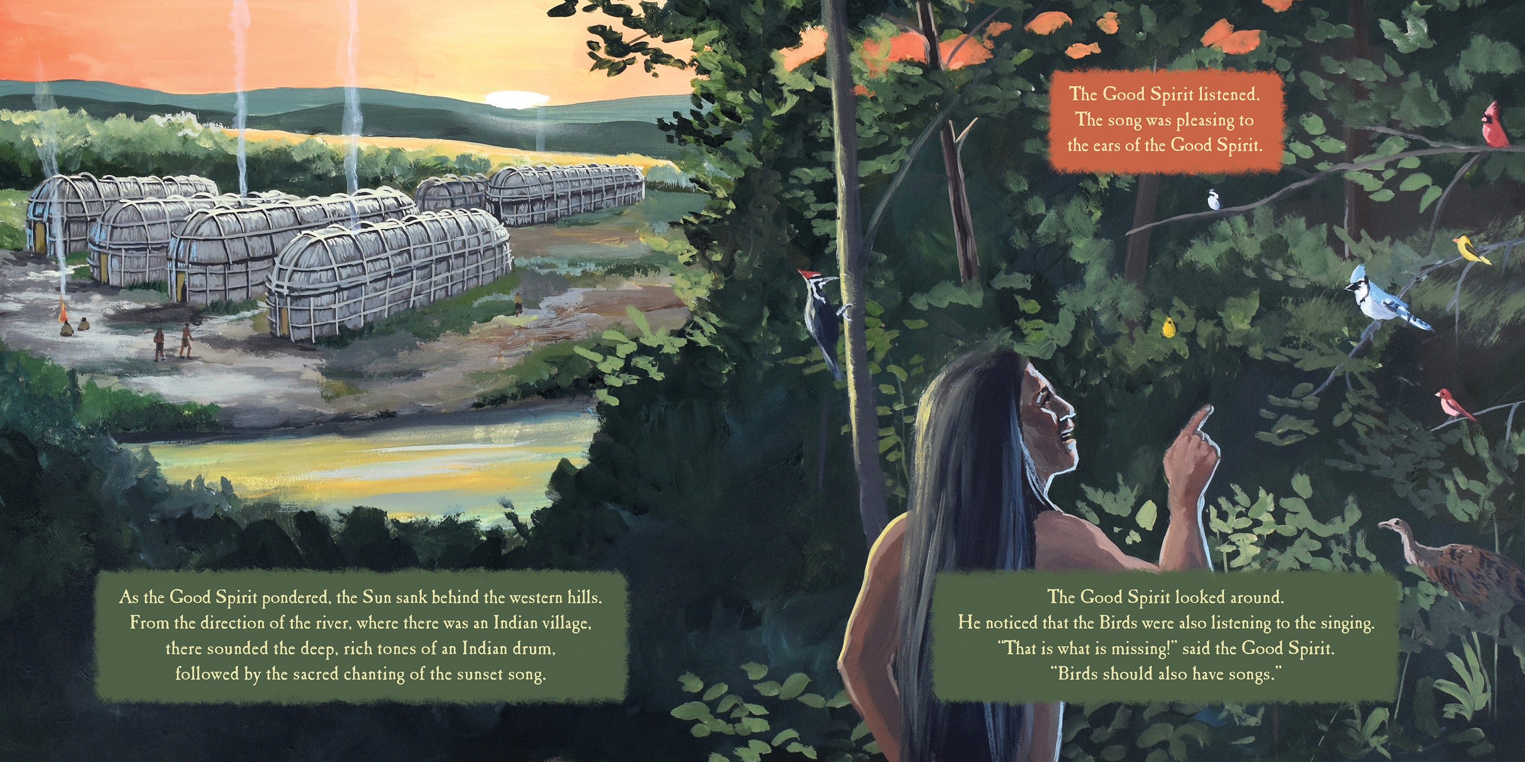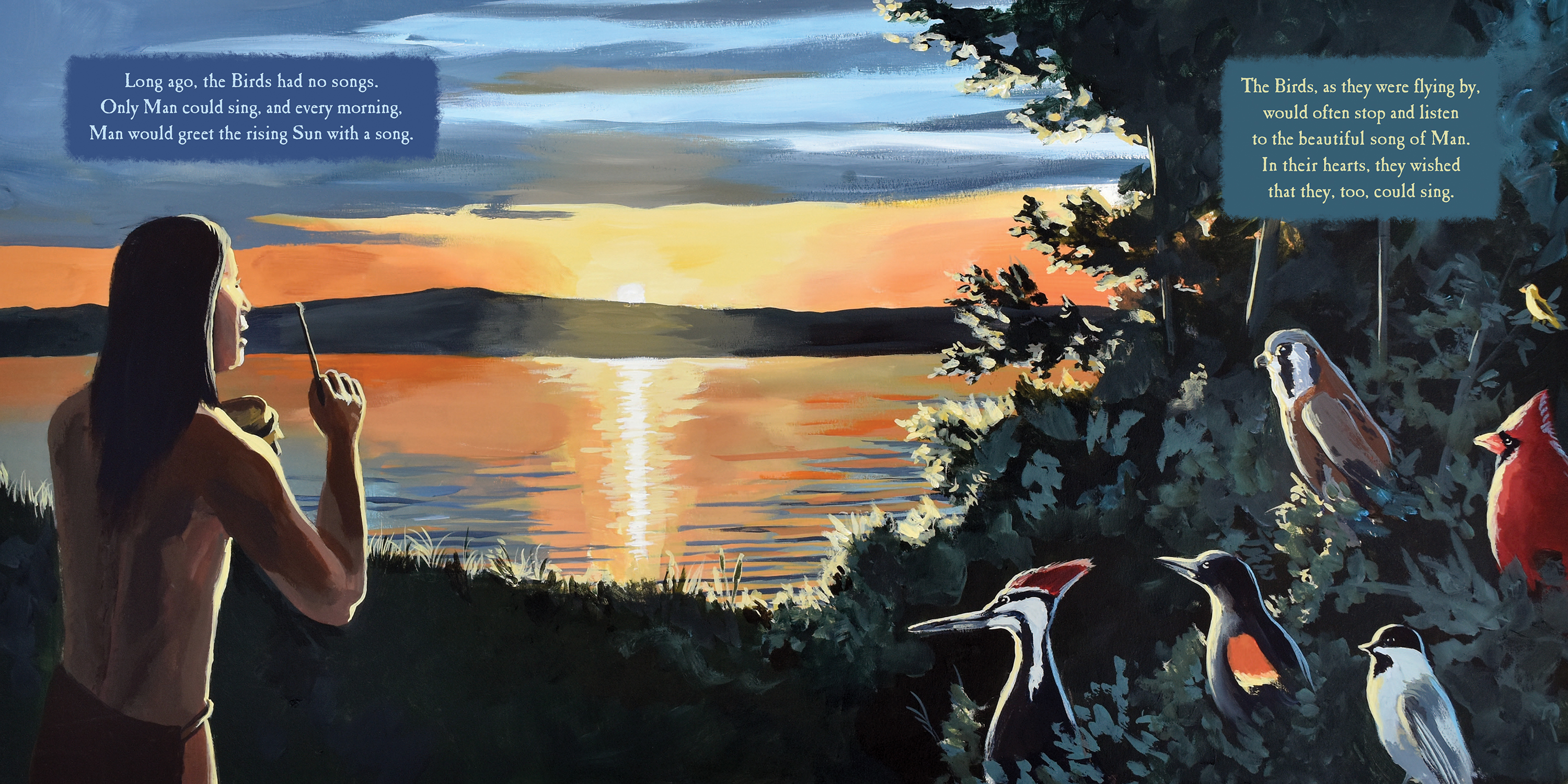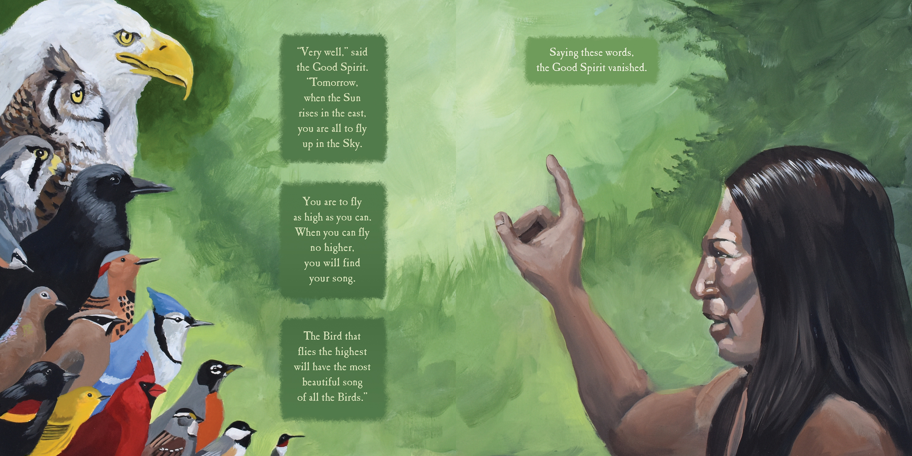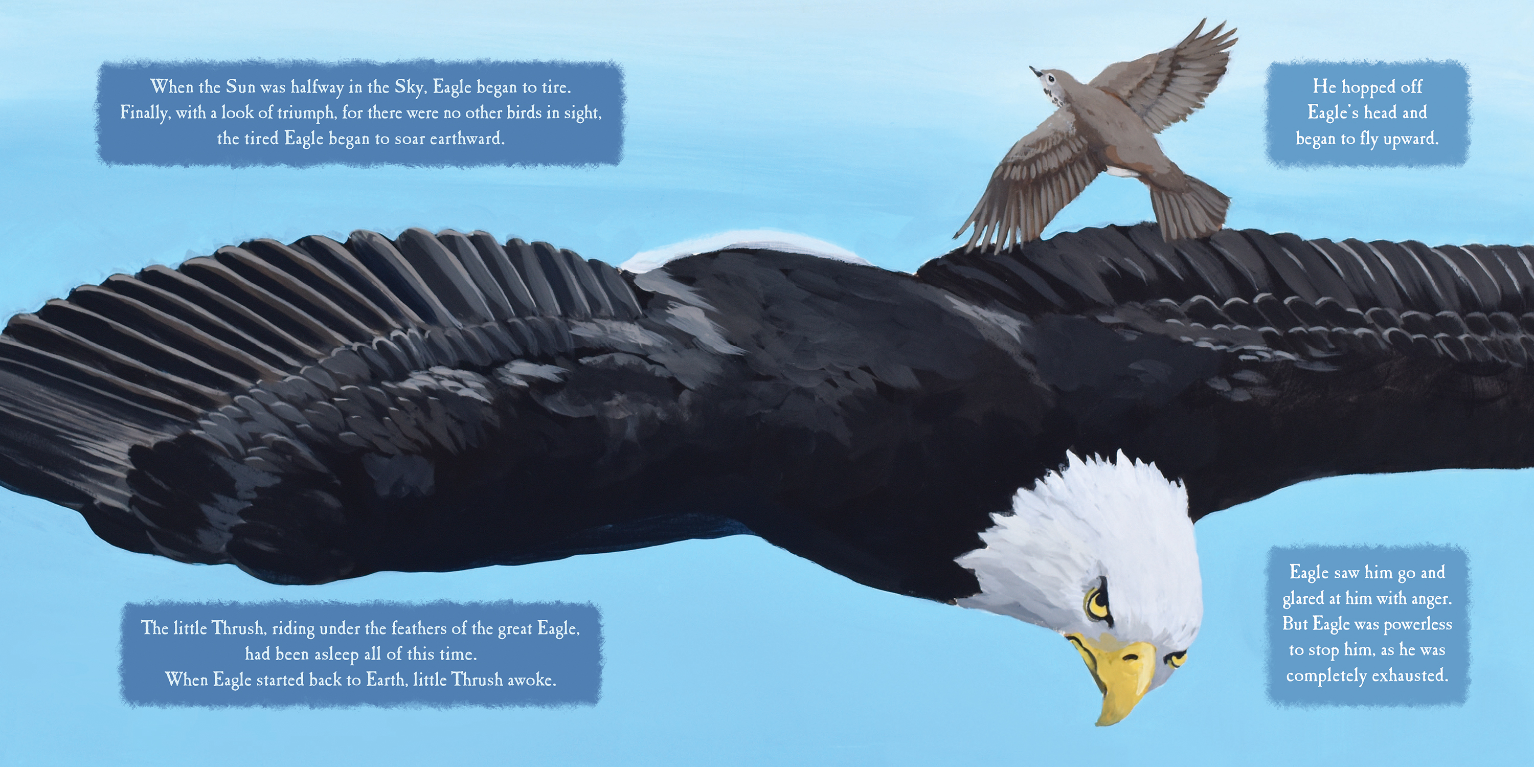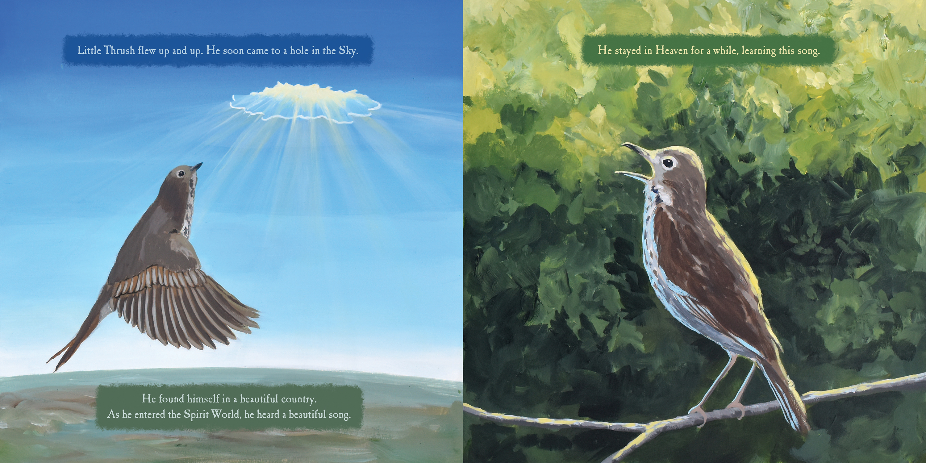 Long ago, when the birds had no songs, only man could sing. When the Great Spirit walked on the Earth, he noticed a great silence. He realized the birds had no songs. He devised a great game and told the birds who ever could fly the highest, would receive a very beautiful song. But not all the birds were honest. In his desire to win the game, the small hermit thrush jumped on the back of the great eagle. The eagle flew higher than any of the birds, but when he came back to land, the Great Spirit said the hermit thrush had gone the highest since he was on the eagle’s back.
