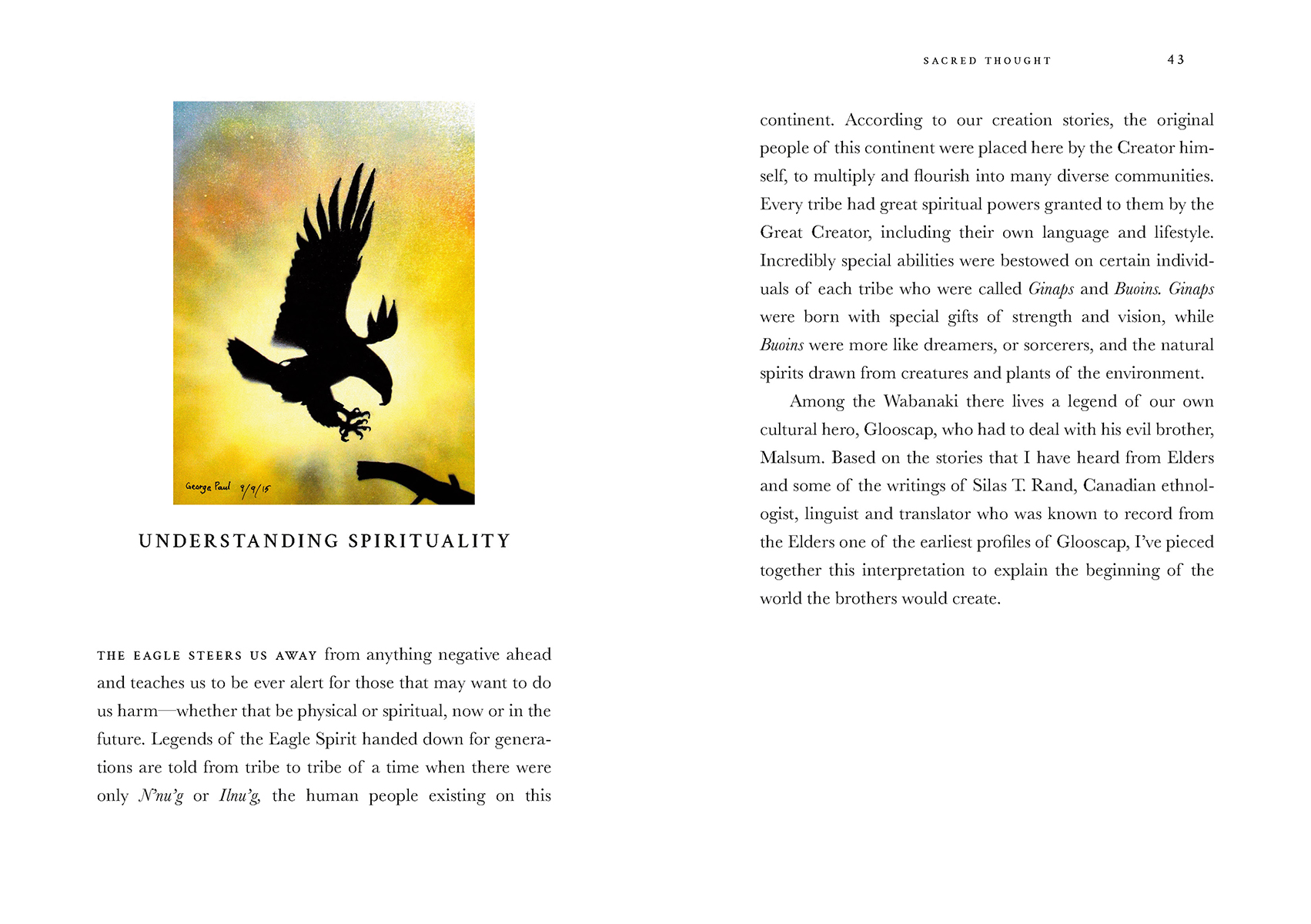 In this philosophical exploration, Mi’kmaq Elder George Paul shares his traditional knowledge with those on a quest to better understand themselves and the world around them. Practiced and maintained by North American Indigenous tribes since time immemorial, this search for spirituality is informed by traditional knowledge, oral tradition and the use of symbols relating to our environment and to our universe. From the ceremonial to the sacred, George Paul meditates on the Indigenous legends, stories and designs of his ancient ancestors that offer new prospects to a modern population all across Turtle Island who are hungry to look inward.