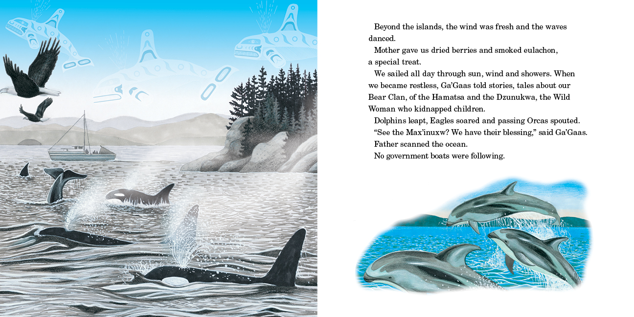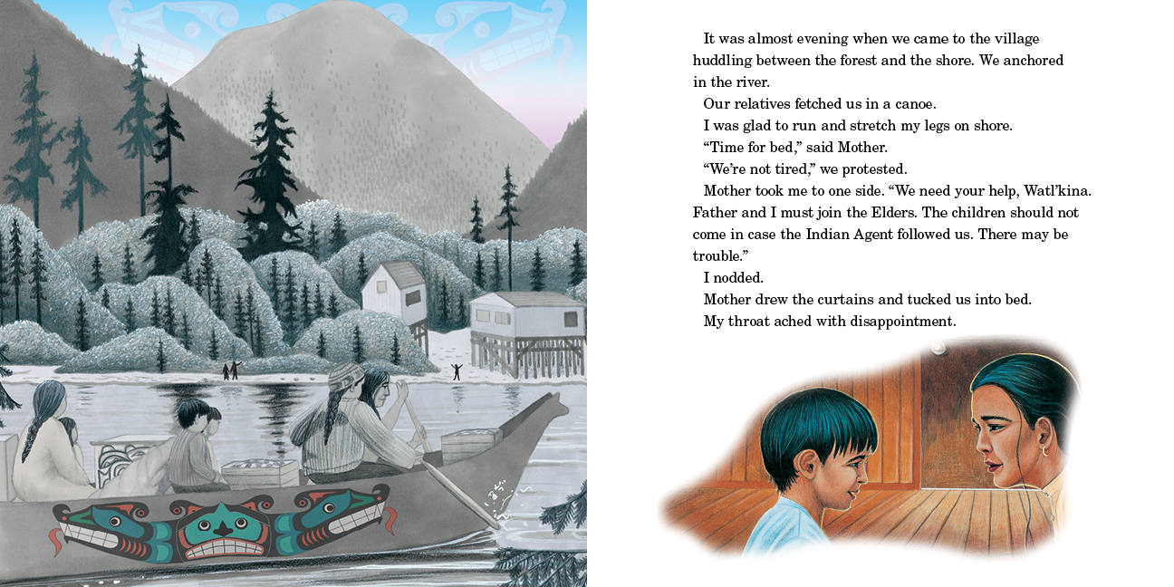 In 1935, a nine-year-old boy's family held a forbidden Potlatch in faraway Kingcome Inlet. Watl'kina slipped from his bed to bear witness. In the Big House masked figures danced by firelight to the beat of the drum. And there, he saw a figure he knew. Aboriginal elder Alfred Scow and award-winning author Andrea Spalding collaborate to tell the story, to tell the secret of the dance.