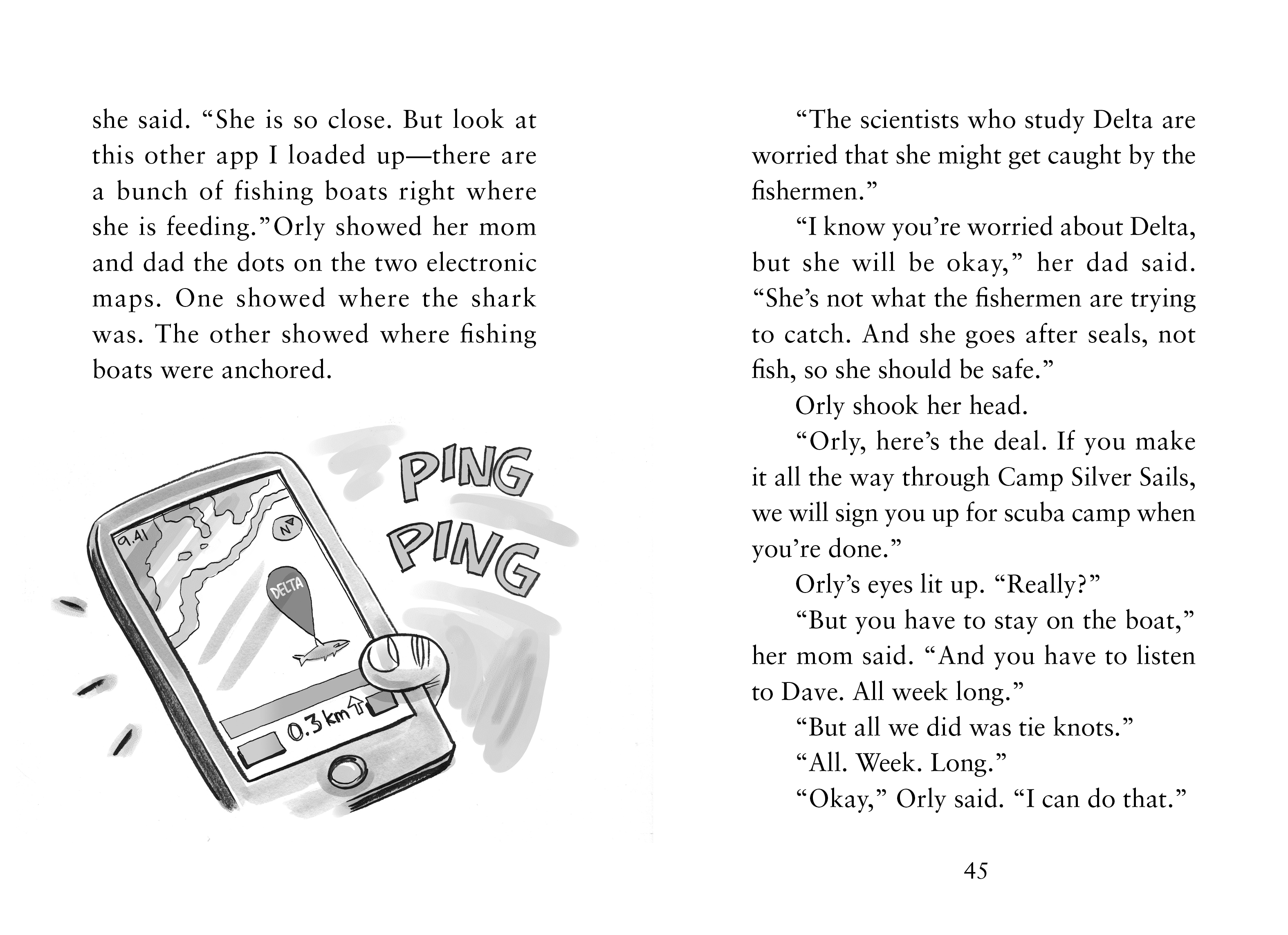 This year her parents have signed her up for sailing lessons, hoping to teach her some water safety while they're busy with her baby brother. Orly is excited to be on the water, but she has other ideas about how she’s going to spend her time there: rather than learning to tie knots and batten down the hatches, she's going to use her tablet to track Delta, a great white shark known to frequent the area. Orly’s misplaced enthusiasm repeatedly gets her in hot water with her instructor. Can Orly redeem herself with her sailing crew when she has a chance to use her shark-tracking skills to save some actual wildlife in danger?