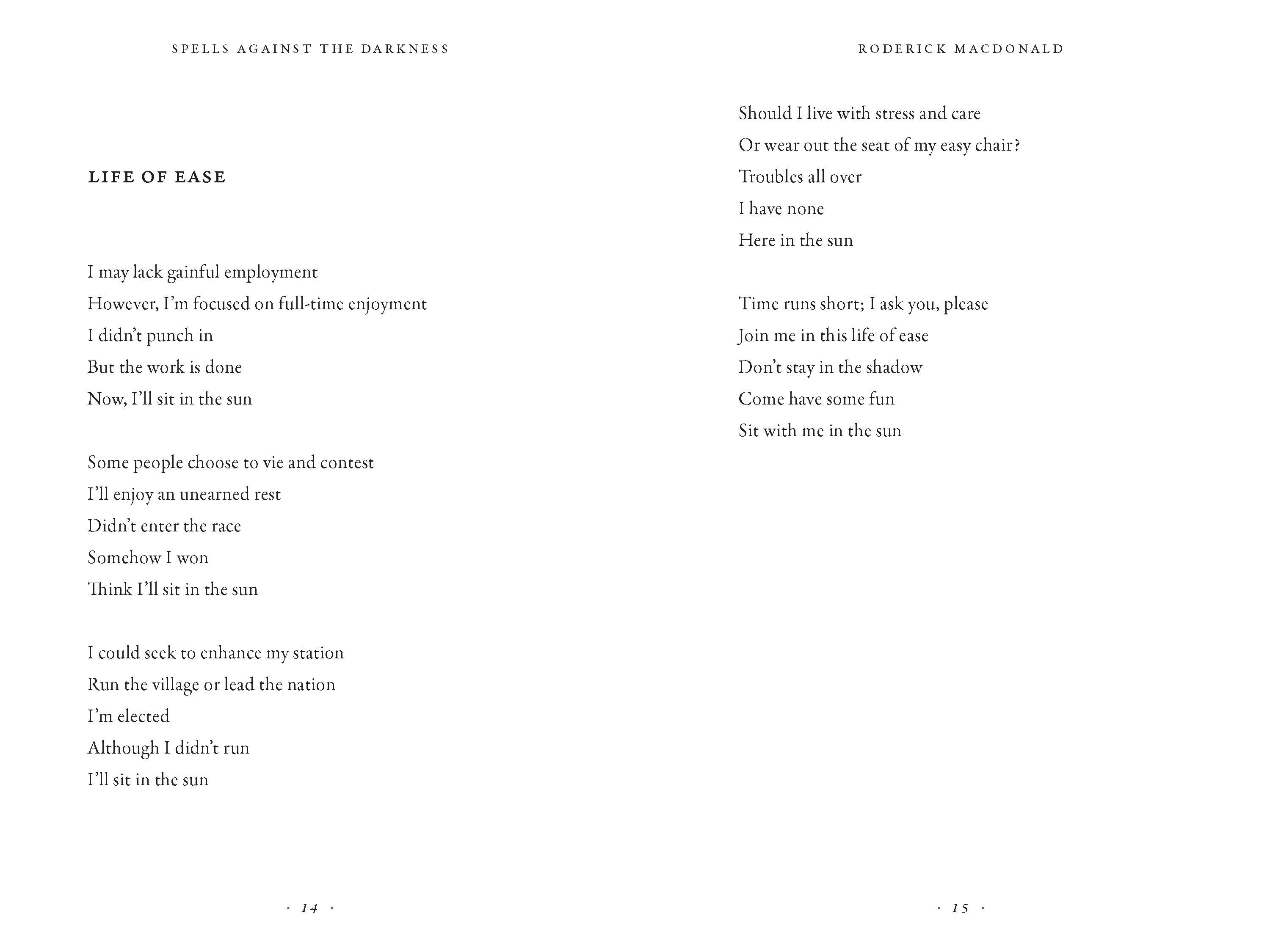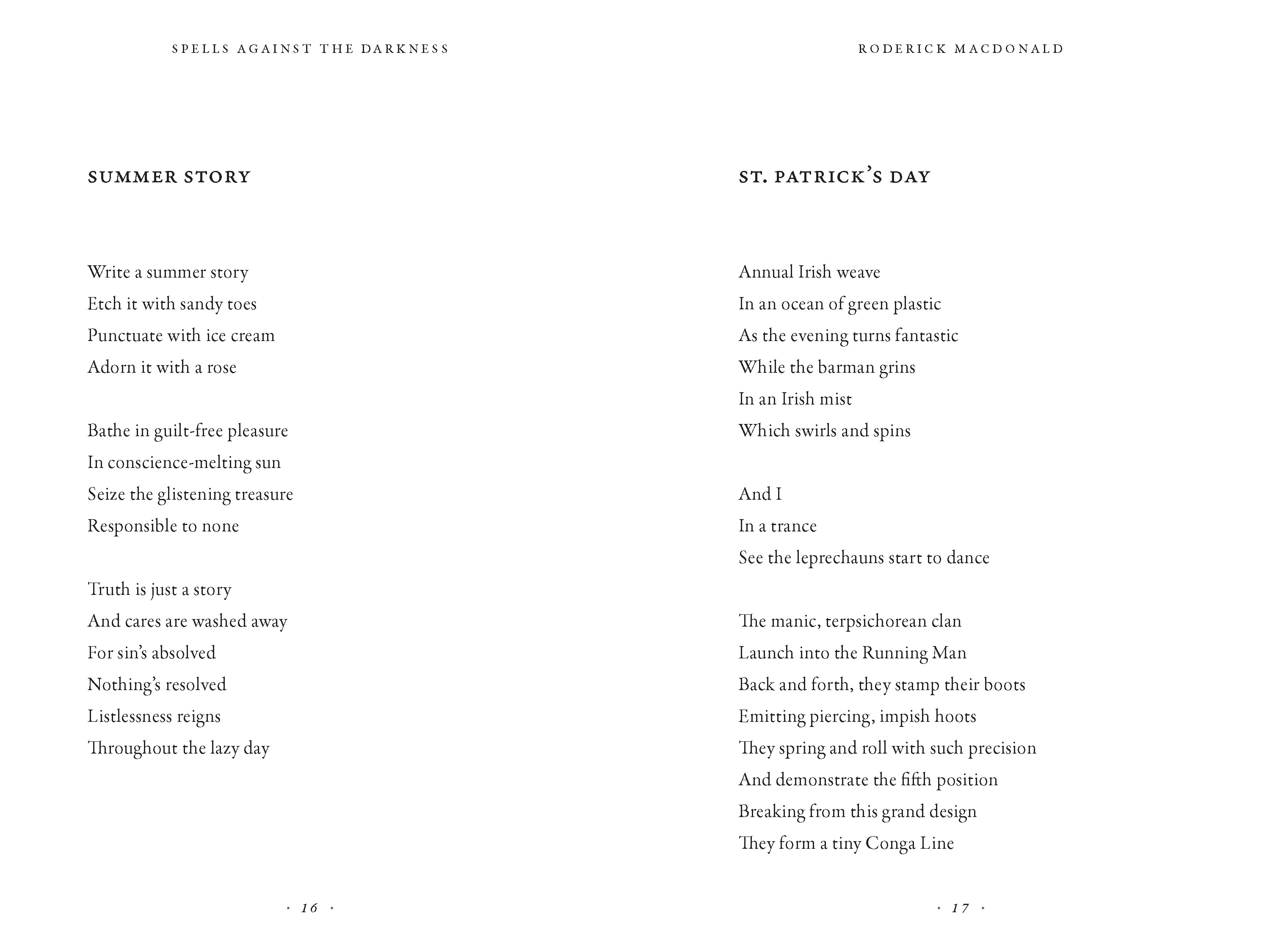 Spells Against the Darkness is a compelling and enjoyable exploration of the intimate and universal. From the peace of a Prince Edward Island country lane, to the clamour of New York City, classic poet Rod MacDonald draws on a variety of lyrical styles to weave his stories into verse.