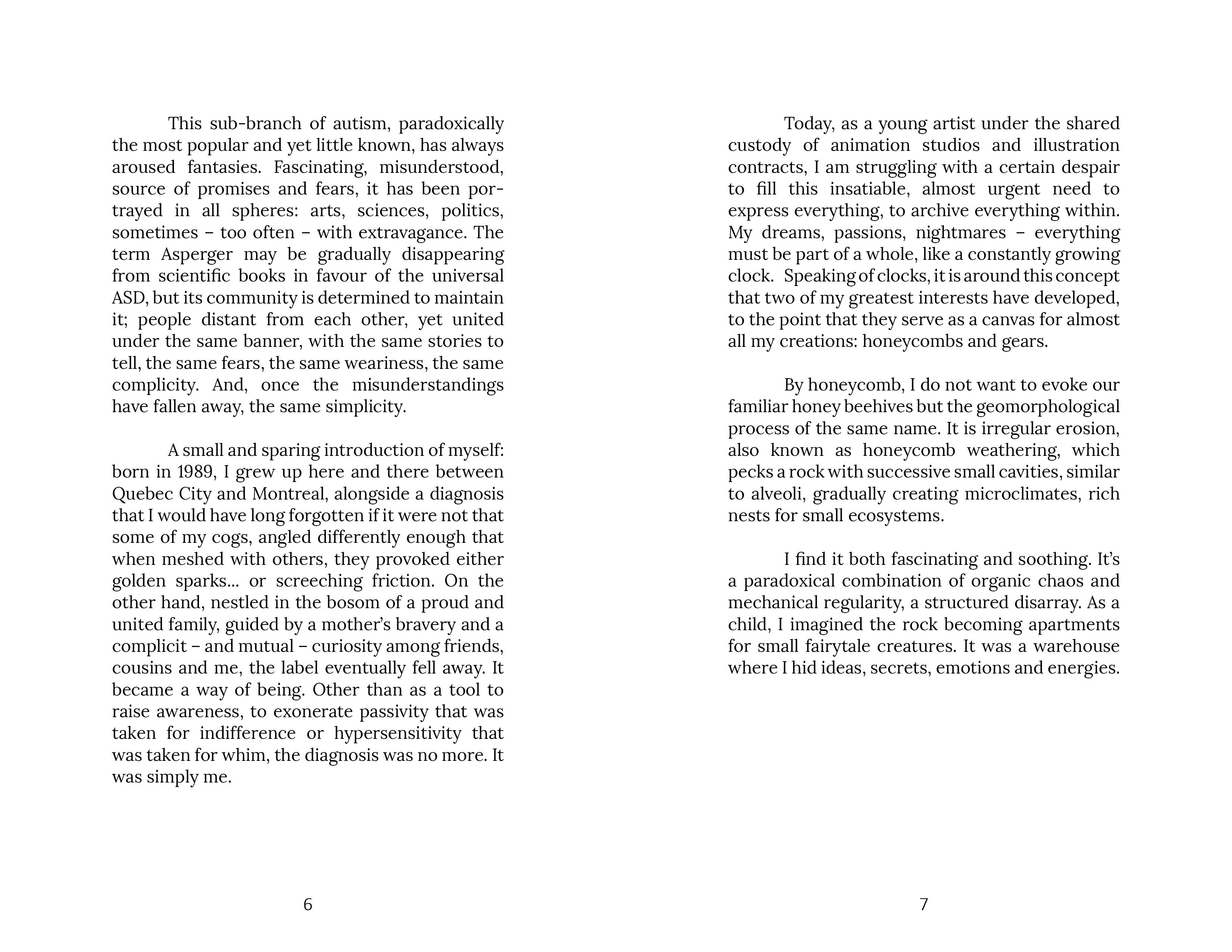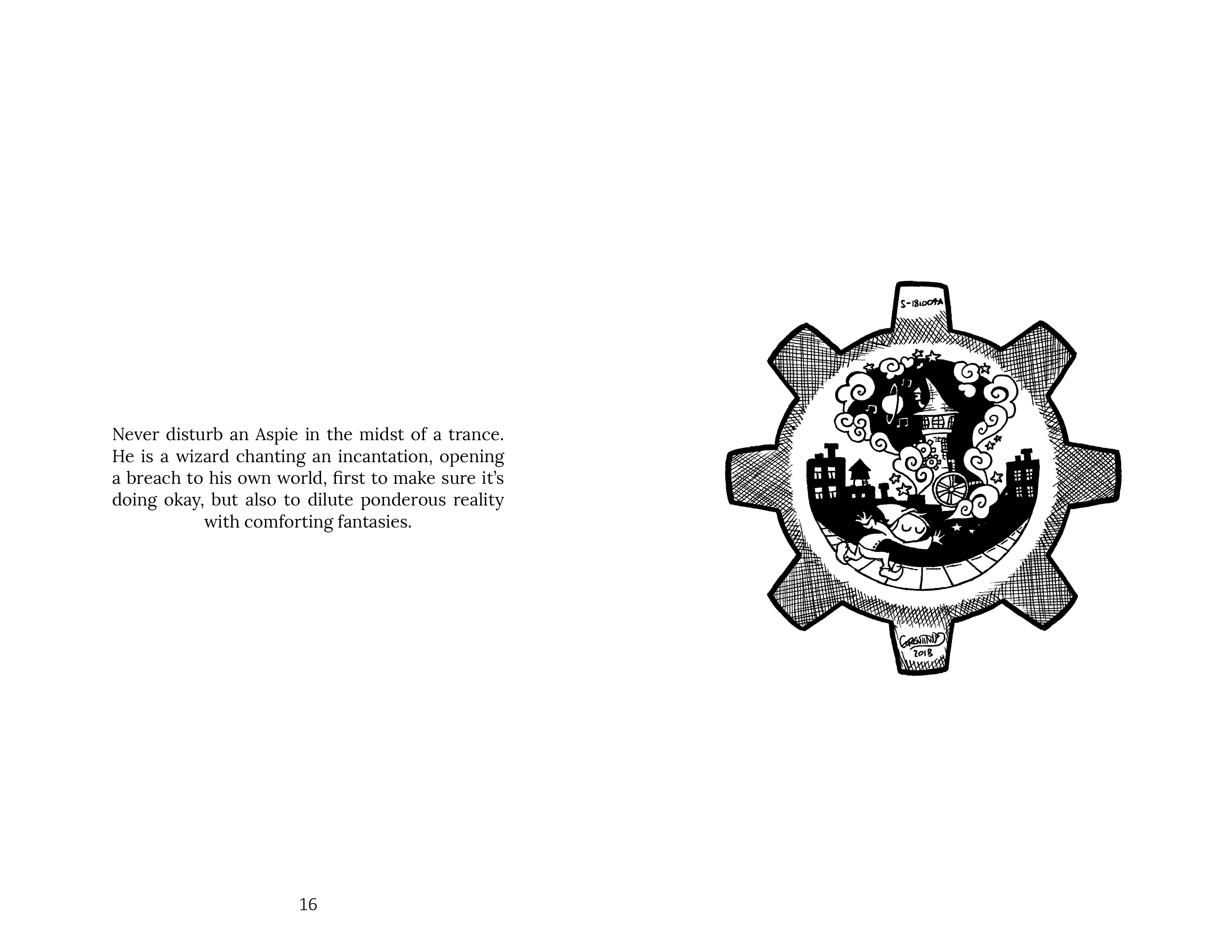 Asperger Syndrome has been given many faces, myths as well as labels, ideal as well as prejudices. Aspie, however, are easier to understand than one might think, akin to a gear set up differently. A world that thirsts for learning and has a lot to offer… to whoever is willing to give them that chance. This book is a collection of thirty-one illustrations evoking the daily life of an autistic person, this time not from a scientific perspective, but from a poetic, human and endearing one. A personal Asperger’s Fresco, vibrant with authenticity, tinges with memories, passions and tributes to geek culture.