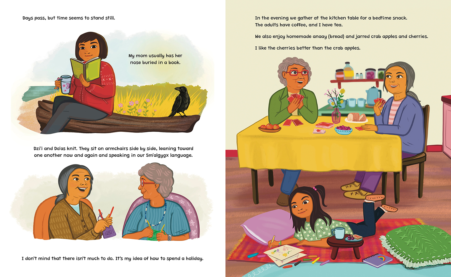 The days pass slowly as Wałaas spends time with family, wanders the shore and enjoys foods you can't get in town, like fresh chiton and sea urchin. She likes listening to her family speak Sm’algya̱x, even though her mom won't always tell her what they're talking about, and sharing an evening snack of homemade anaay (bread) and jarred cherries. The visits to Kitkatla are never long enough, but Wałaas knows she will always return to the reserve because it's her home.