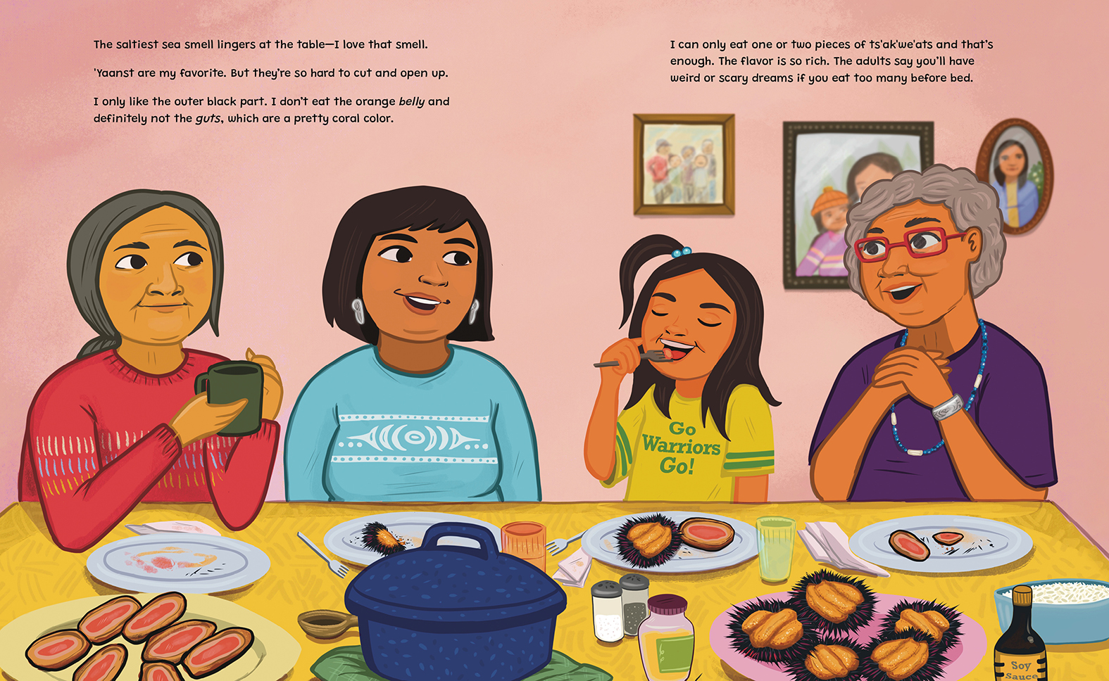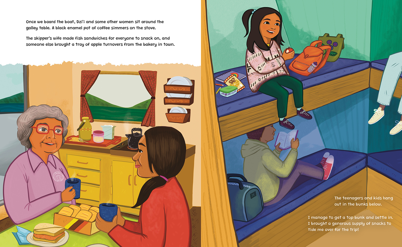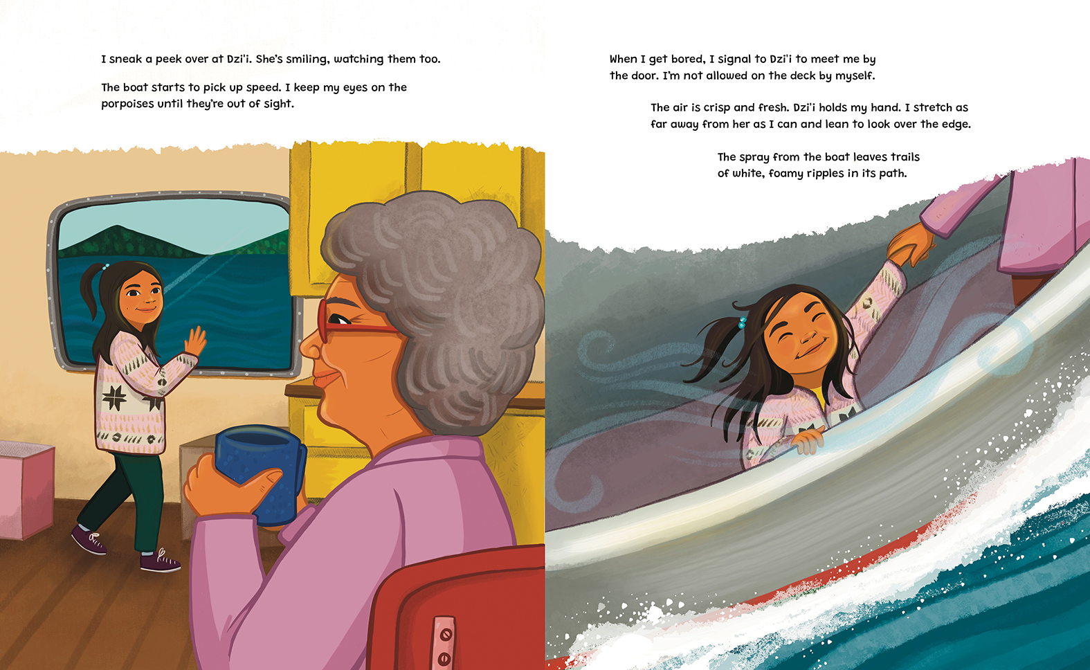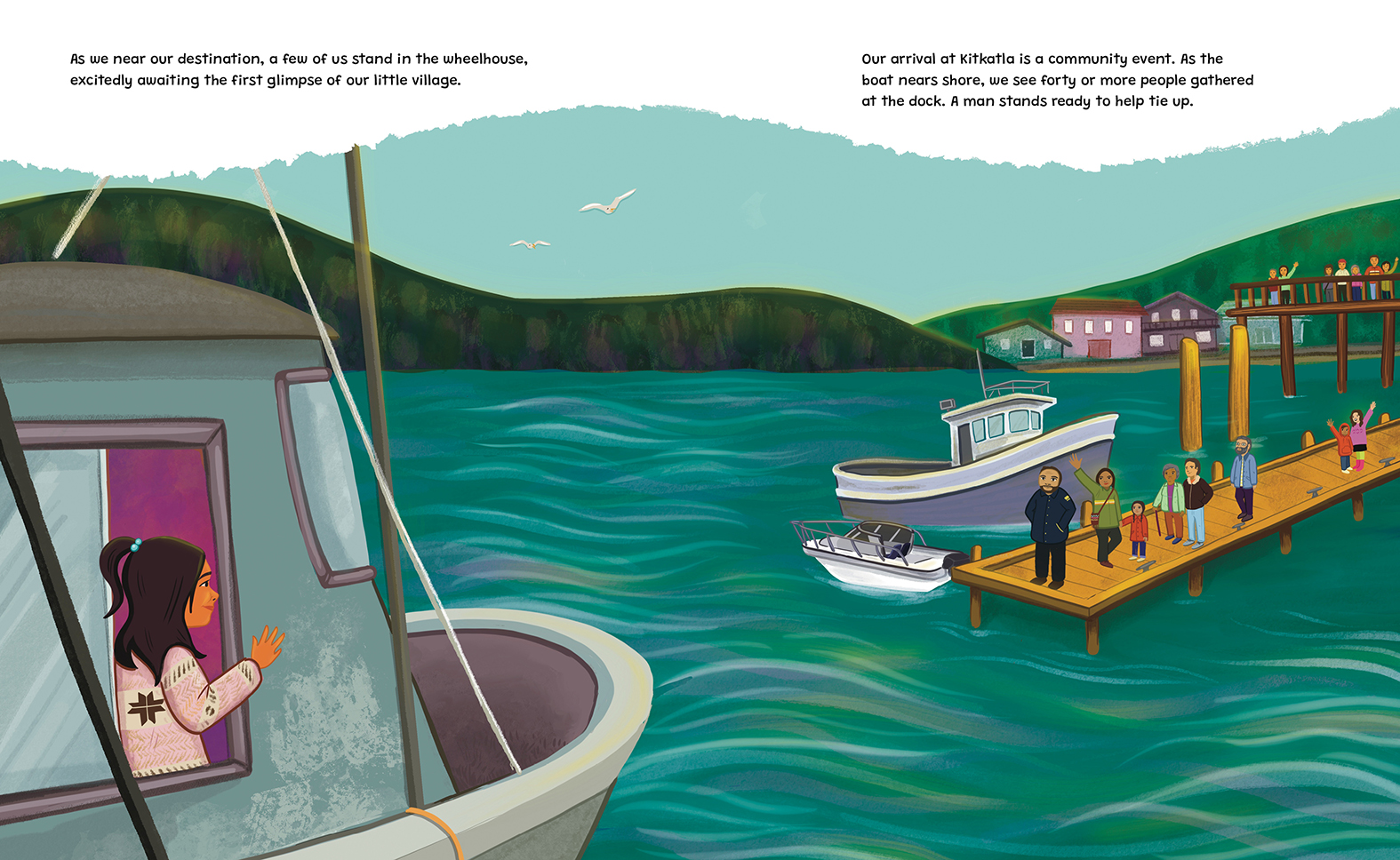 Kitkatla always feels like home. She and her dzi'i (grandmother) travel there by fishing boat, and on the way Wałaas spots porpoises in the sparkling waves. Once they arrive, they stay with her da'as (auntie), and her mom comes too to join in the fun.