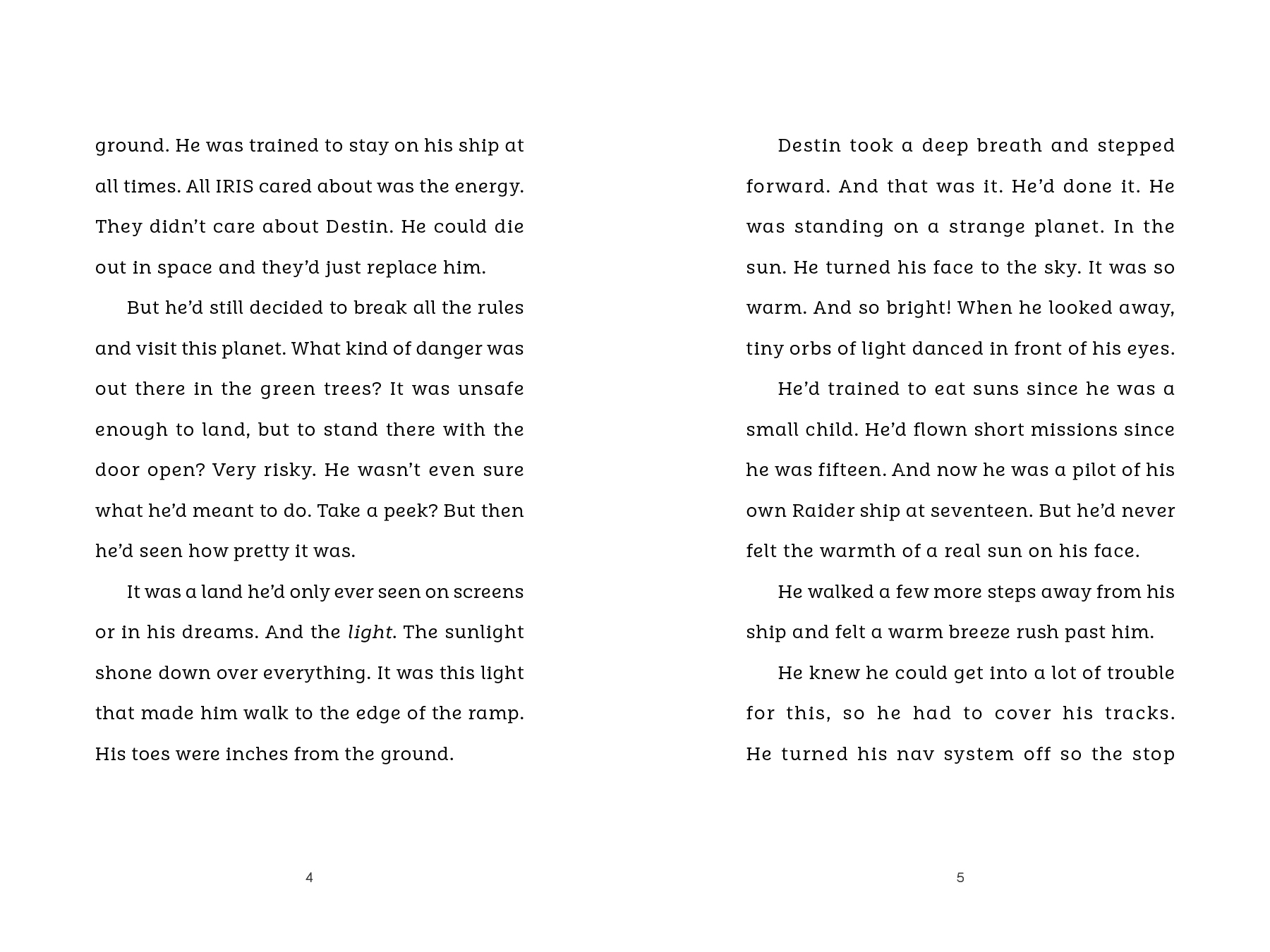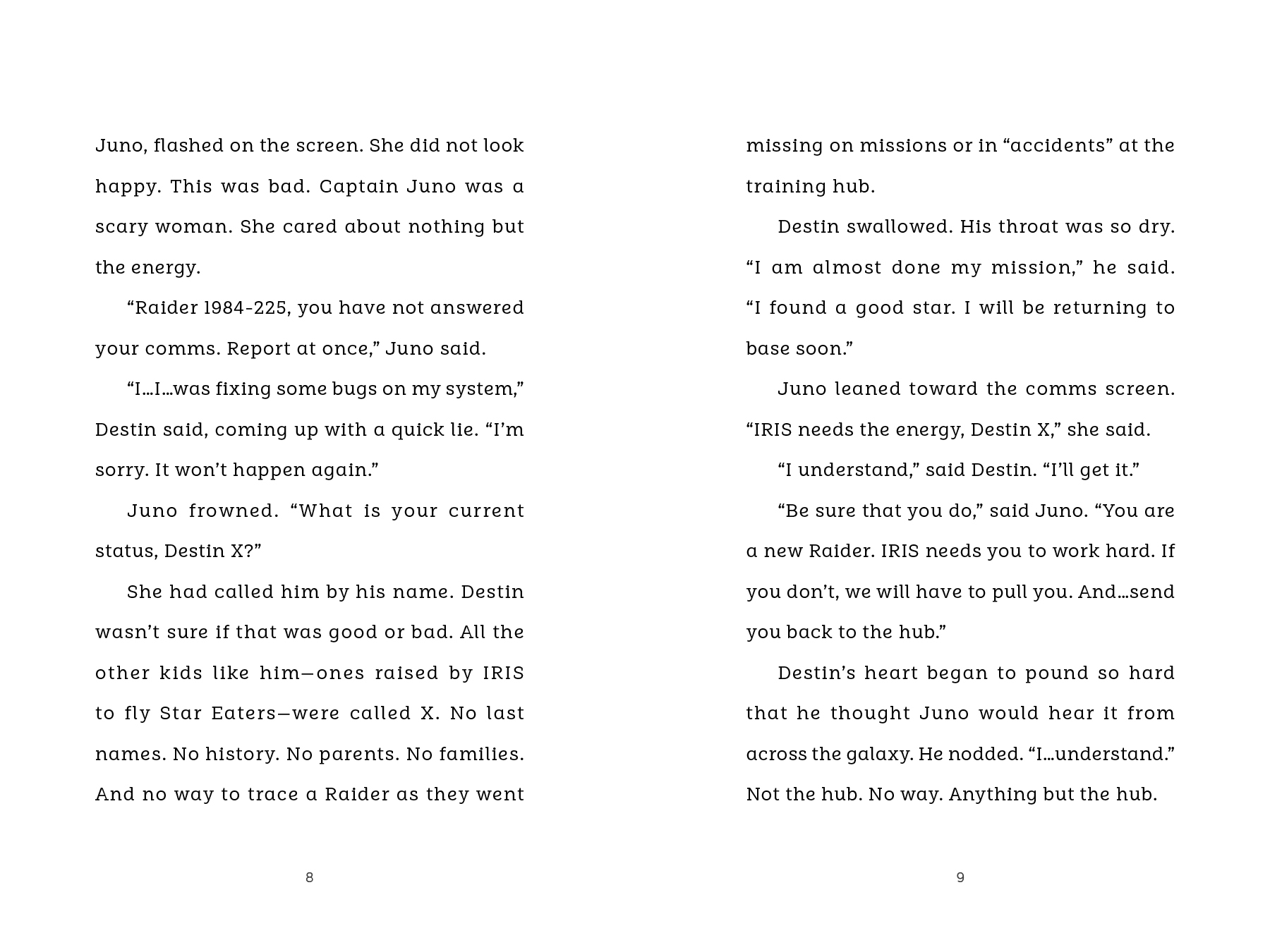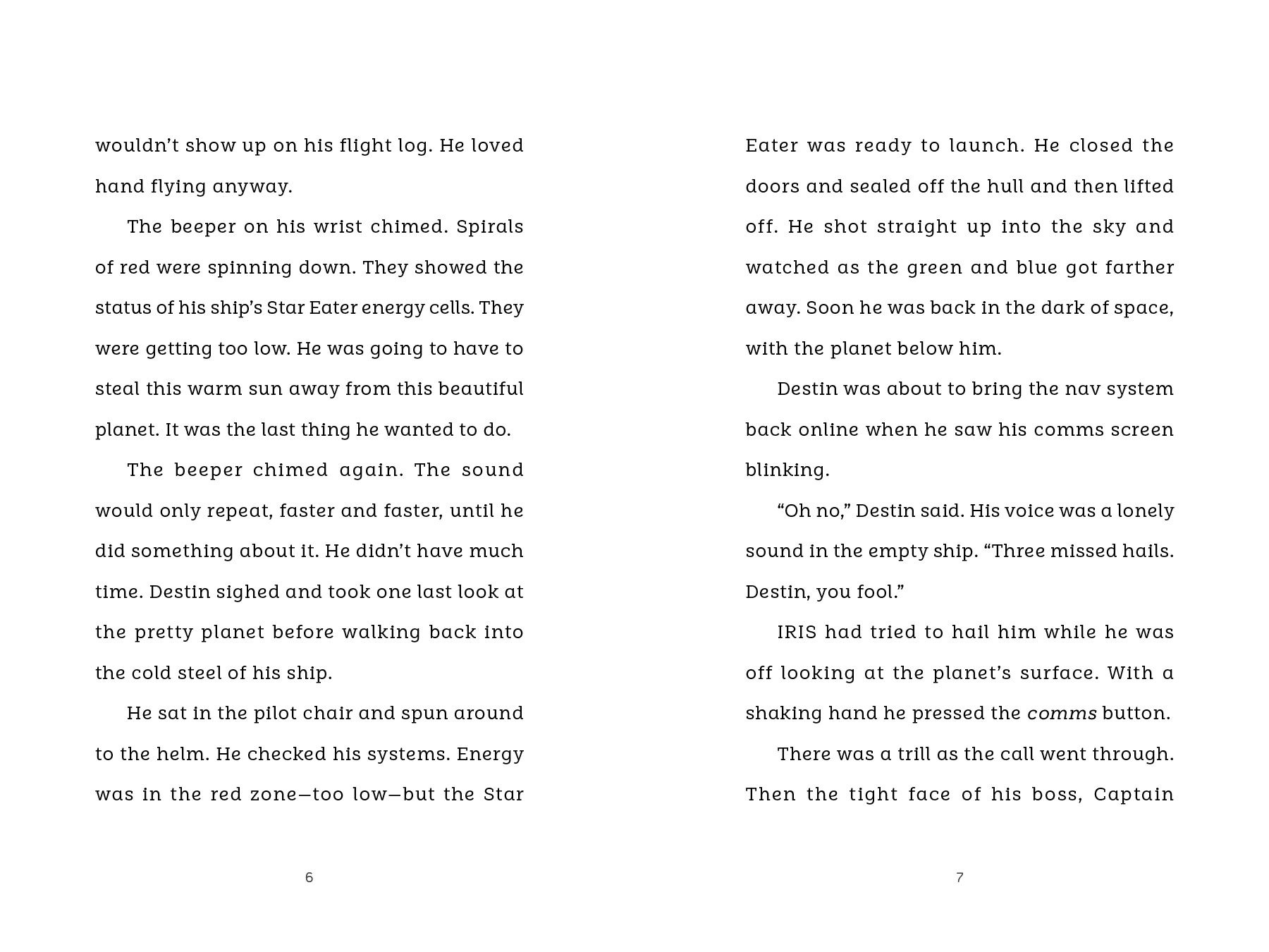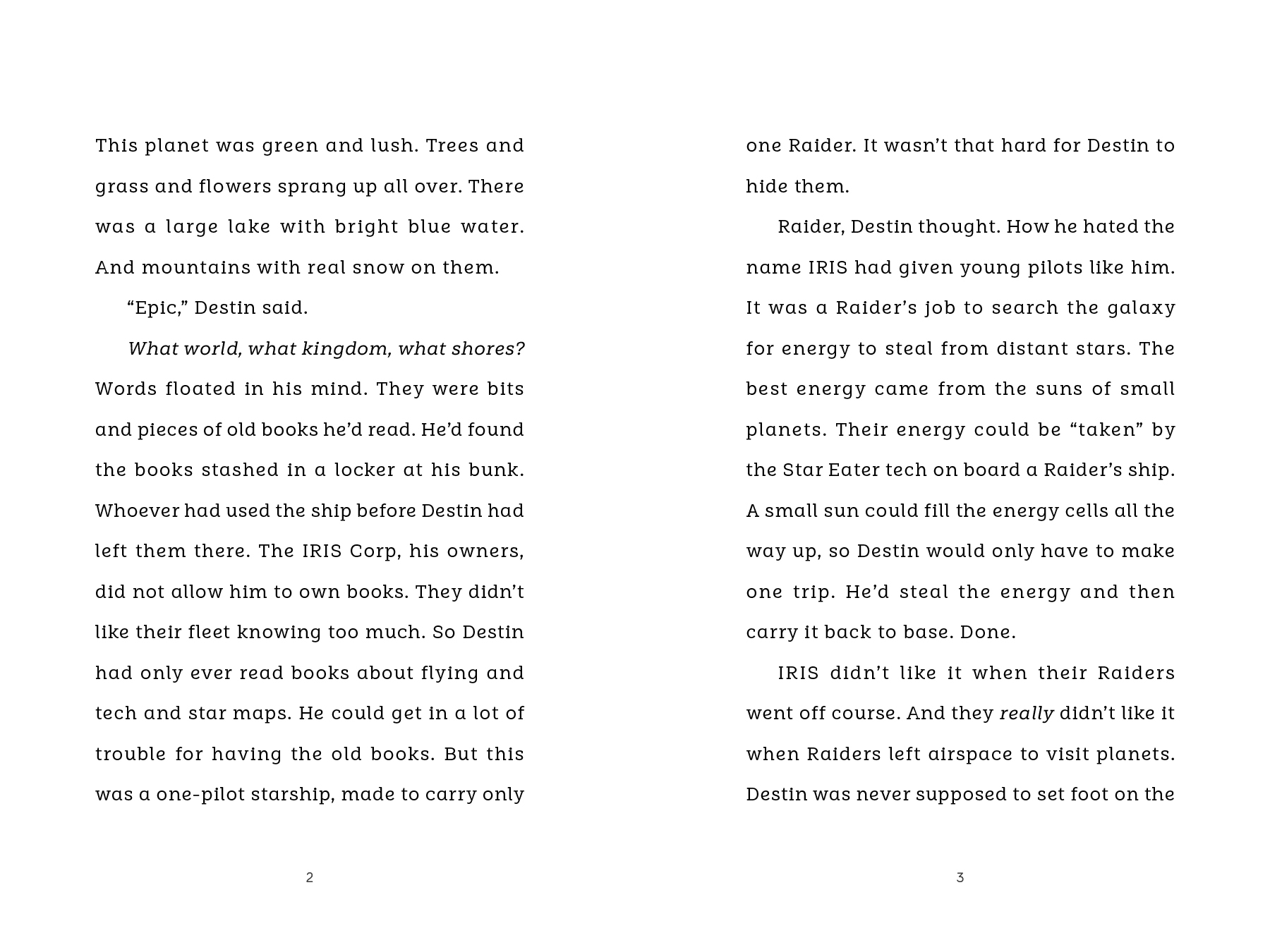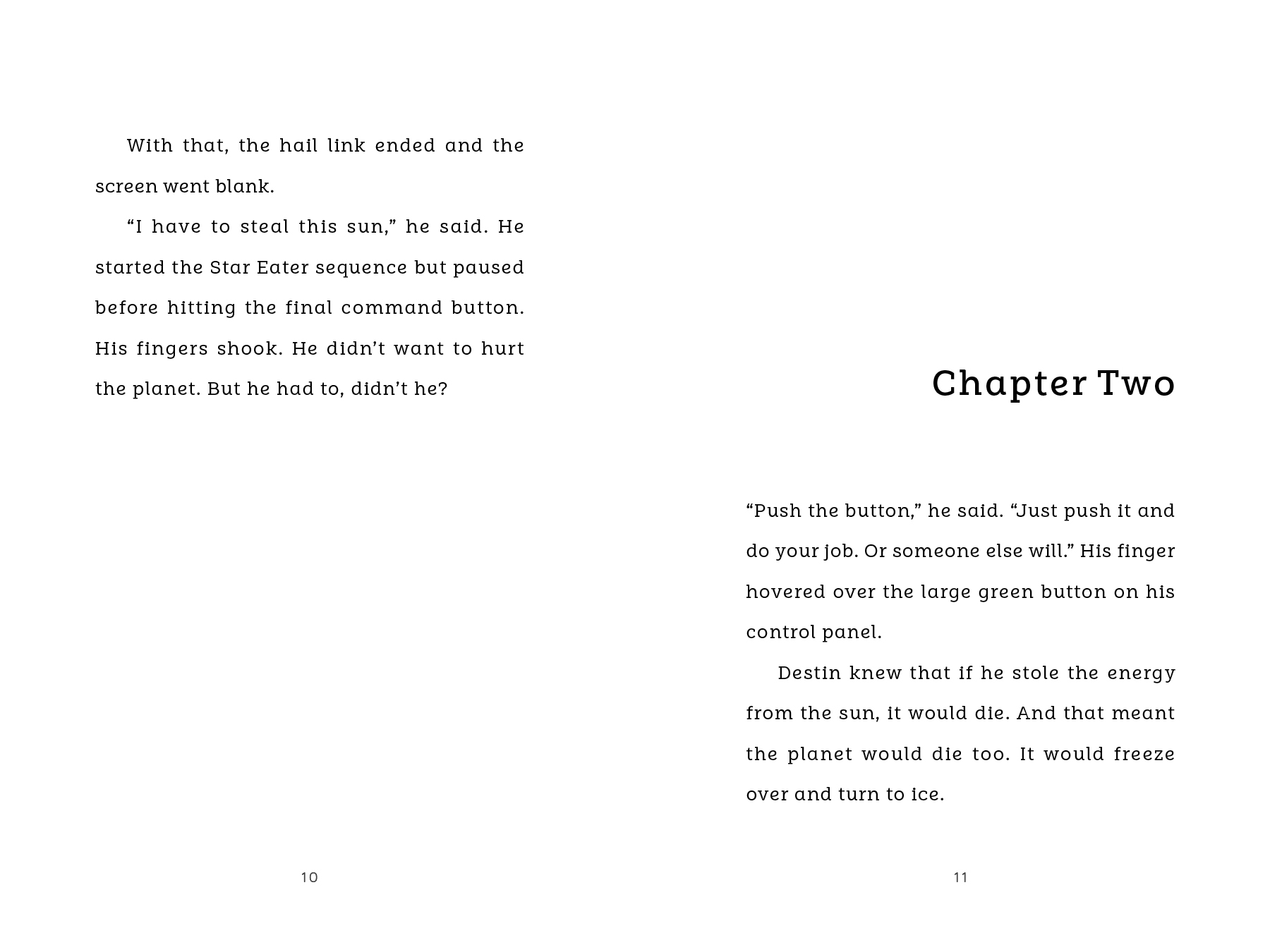 Their suns and other stars are being consumed by Star Eaters, members of an intergalactic corporation who use advanced technology to steal energy from planets to fuel a fleet of roving starships. But Destin, a young and newly minted Star Eater, is reluctant to destroy worlds he’s never even seen. When he finds a mysterious stowaway girl named Calla on his ship after his first solo mission, Destin is torn. He must decide between turning her in or helping her save her planet. Time is running out—he only has one day before the planet’s sun star dies forever, and only enough fuel to reach home or escape for good.