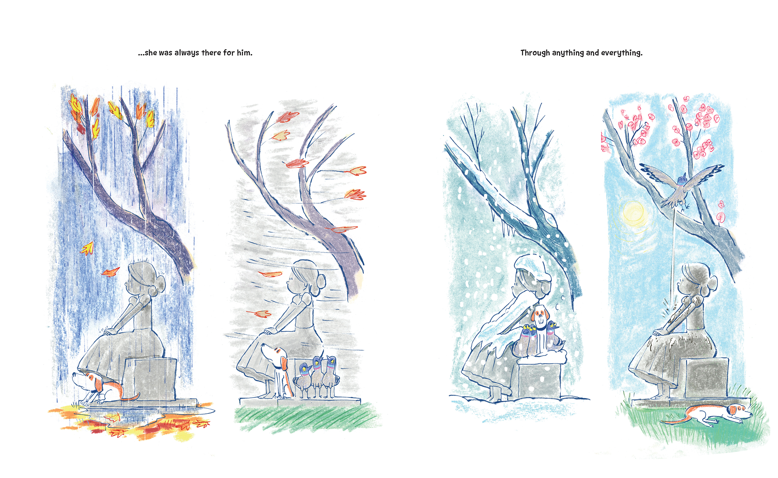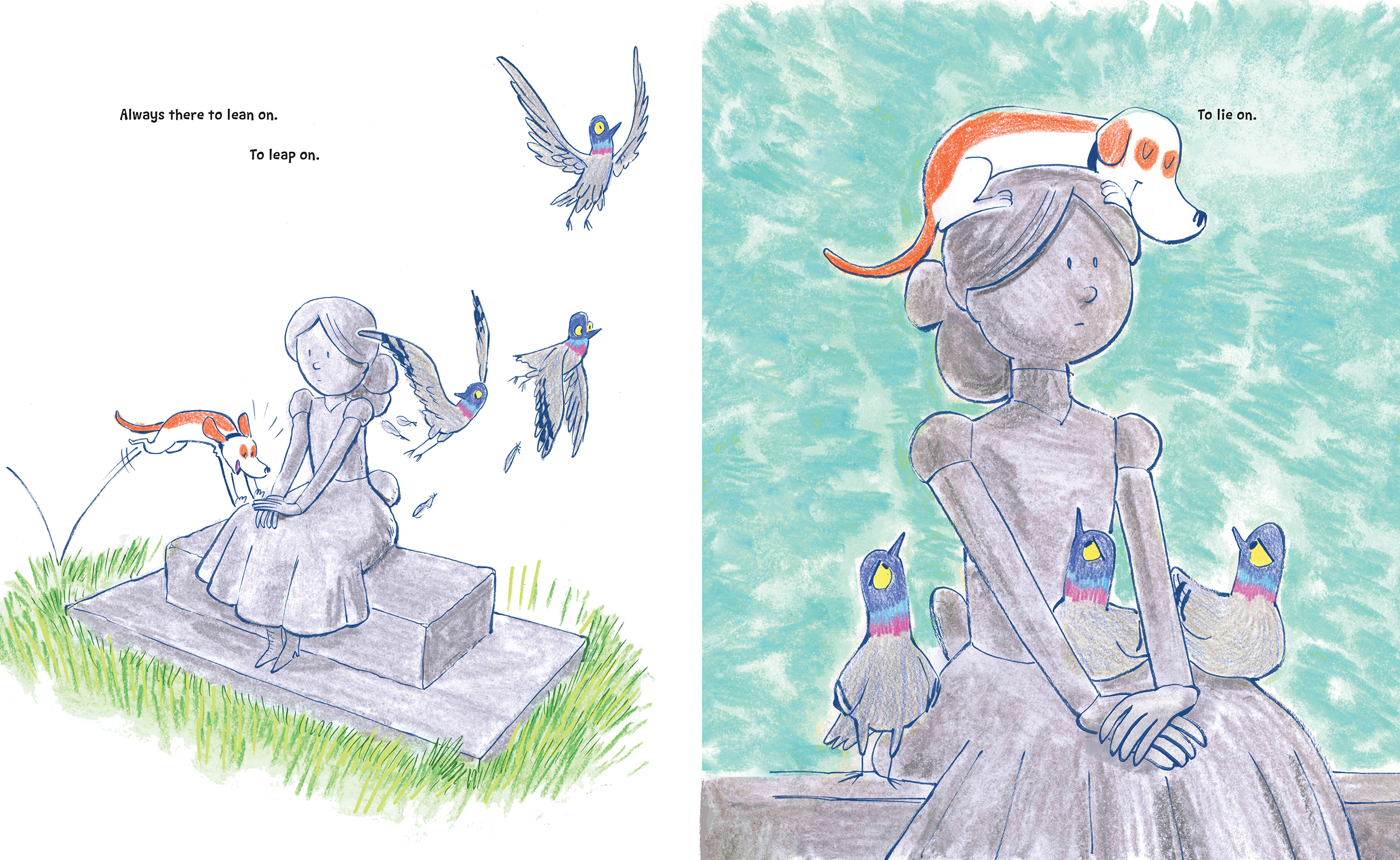 But the more the dog visits her, the more he realizes that the girl has some good traits. Unlike his owner, she never makes him dress up in silly clothes or scolds him. She’s always there to listen, and to lean on. Even though she’s different, she’s there for him day after day, and the dog realizes that she might be a rock-solid friend after all.