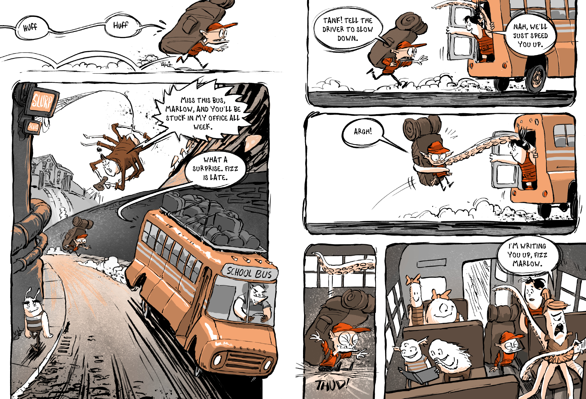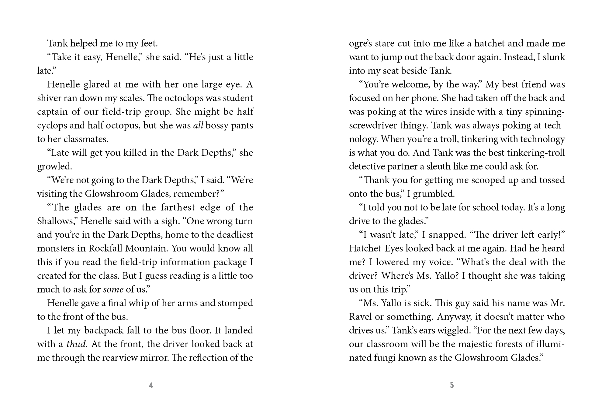 When their school bus veers off course while taking the kids from Gravelmuck Elementary on a field trip, monster detectives Tank and Fizz witness a crime that brings them snout to snout with Rockfall Mountain's oldest monster, the ancient dragon Firebane Drakeclaw. Thieves have stolen the Crown of Peace, which keeps the monster clans of the Dark Depths from fighting, and Tank and Fizz saw the whole thing. Now the detectives must track down the thieves and find the crown or their whole class will become dinner for one very hungry dragon!
