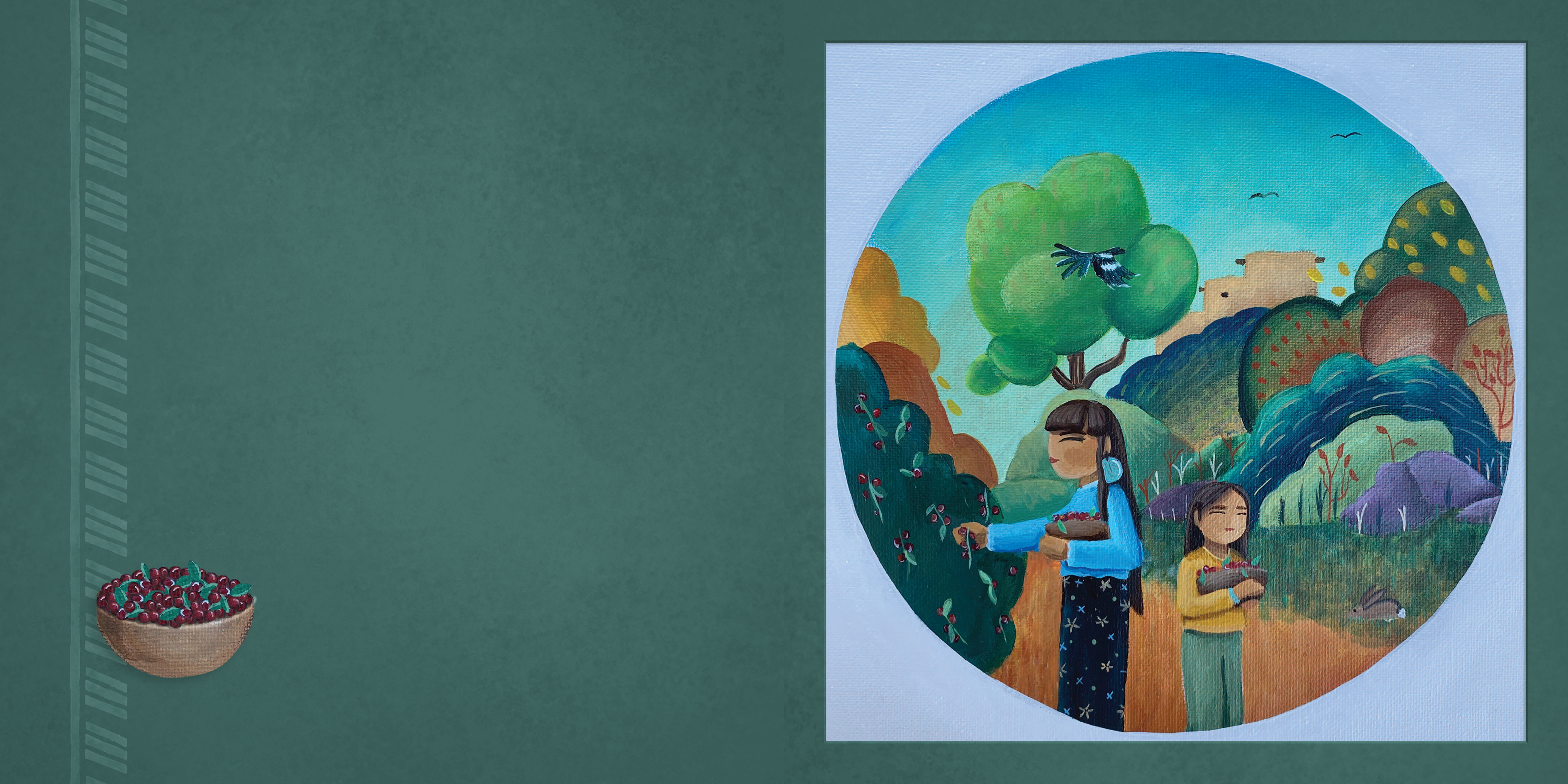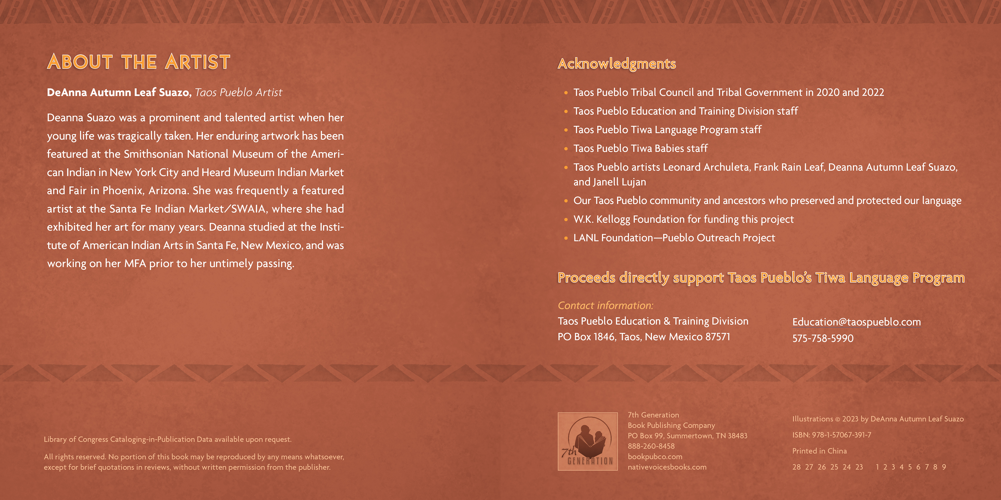 The delightful board books, written without text, were created by the Taos Pueblo’s Tiwa Language Program to preserve the Tiwa culture and revitalize the unwritten Tiwa language by teaching it to younger generations. Many other Indigenous languages also need to be revitalized, so it is the hope of the Taos Pueblo’s Tiwa Language Program that other American Indian nations will find the books useful to teach their languages to their children. The beautiful, hand-drawn illustrations will also educate young children about the four seasons of the year. All proceeds of the book support the Taos Pueblo’s Tiwa Language Program.