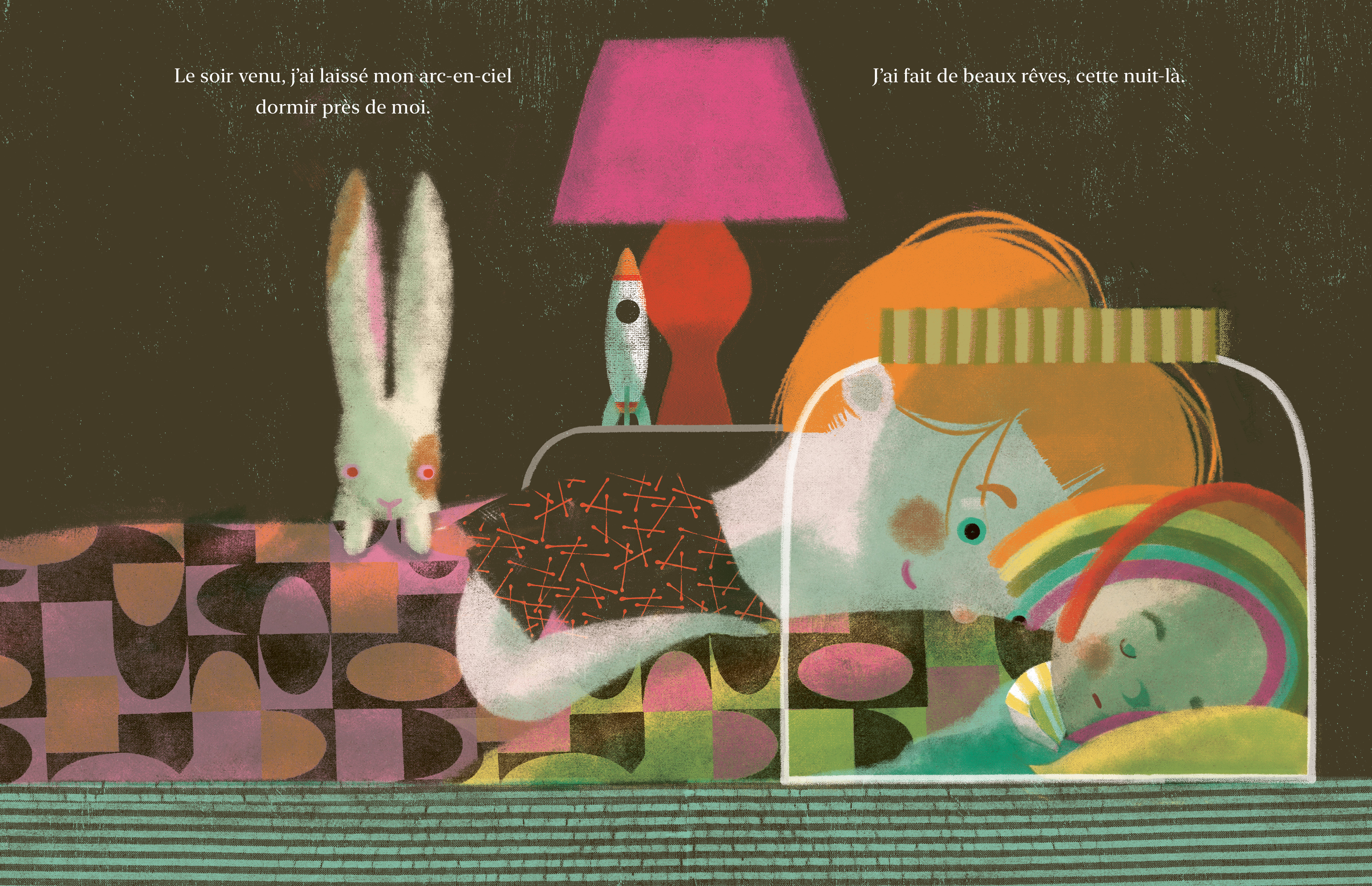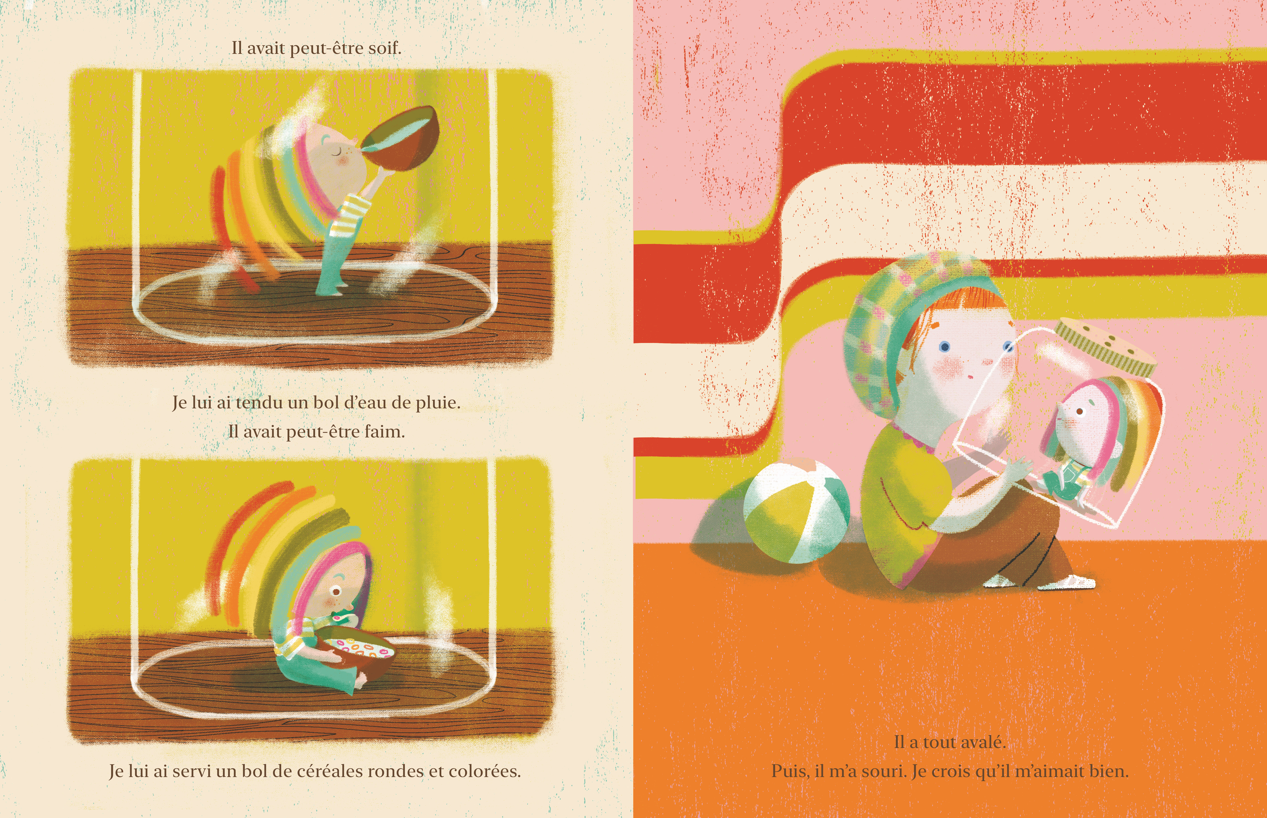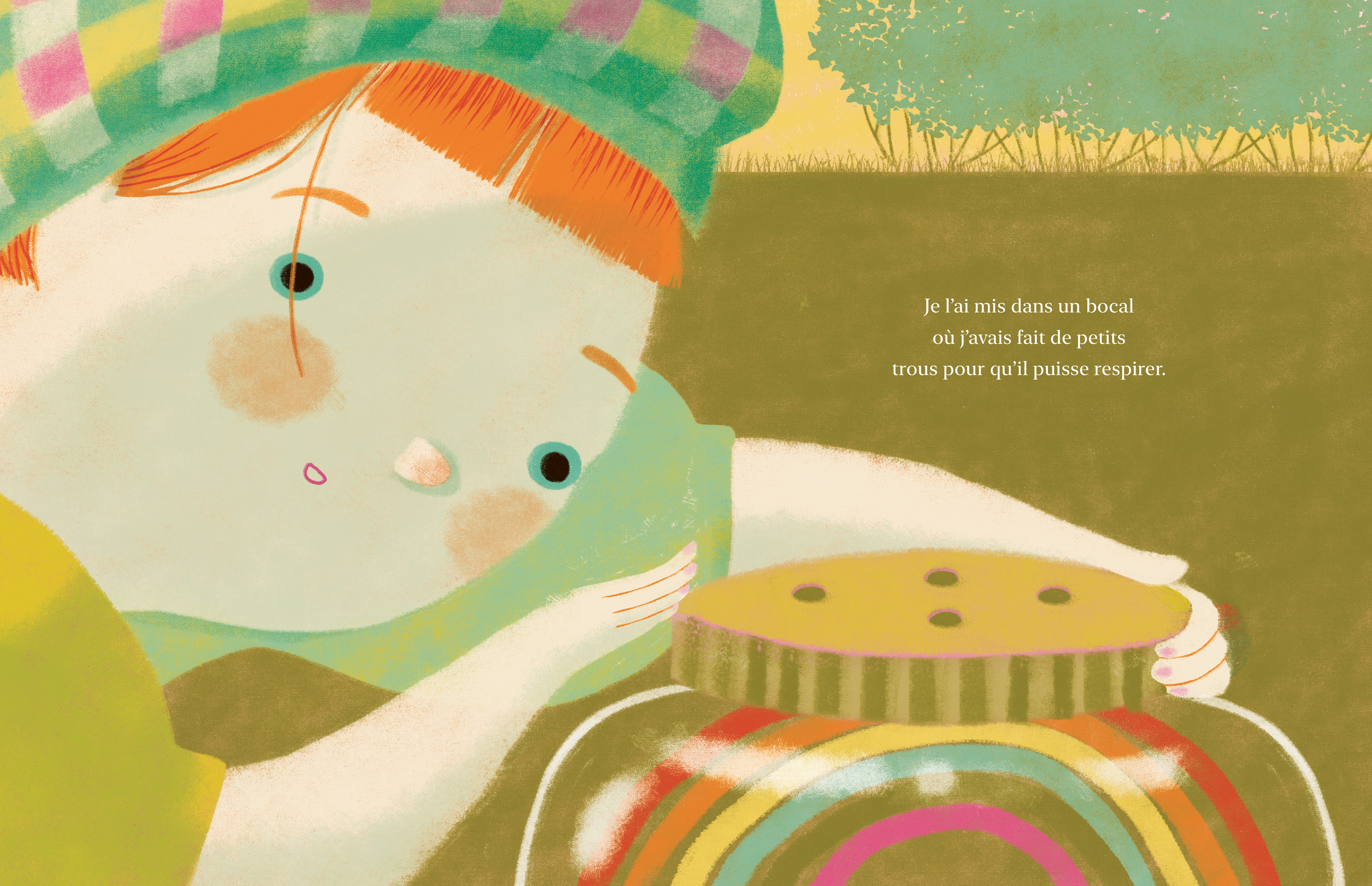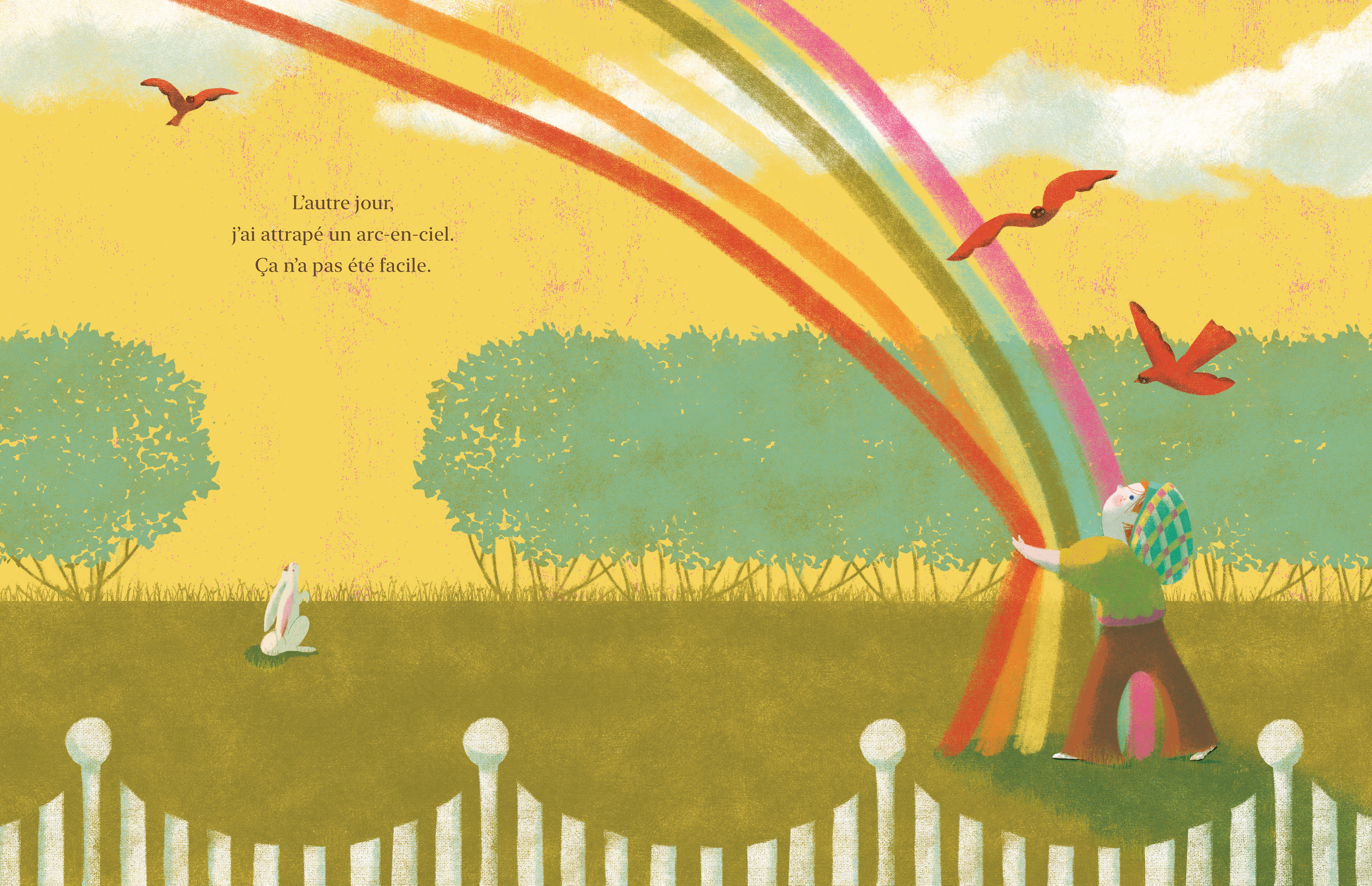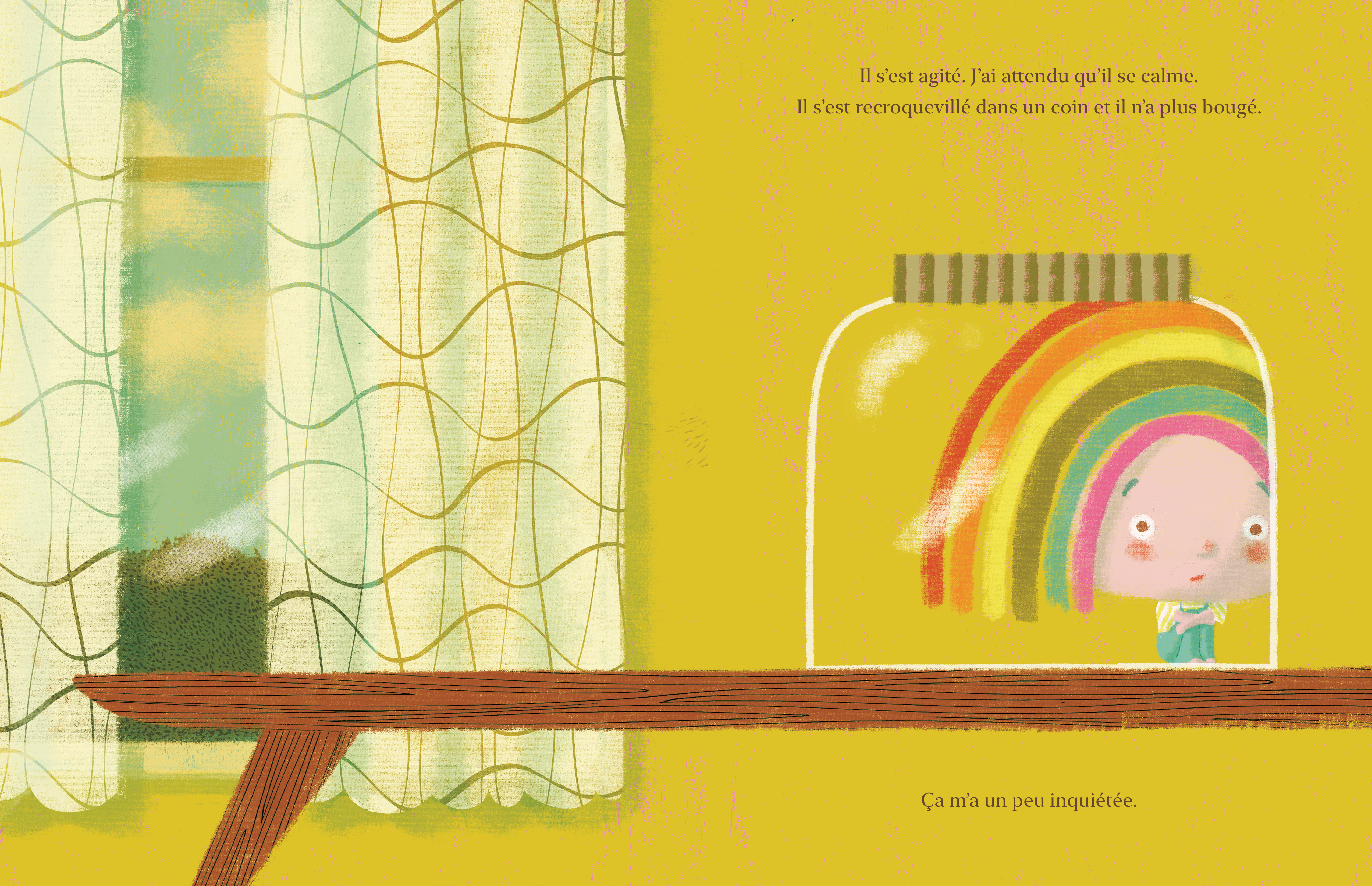Un matin, une fillette attrape un arc-en-ciel et l’enferme dans un bocal en verre. Au début, l’arc-en-ciel paraît hésitant dans son nouvel environnement. Pourtant, l’enfant en prend bien soin. Elle lui donne des friandises, le montre à ses amis et l’emmène partout avec elle. Tous deux deviennent inséparables ! Mais, un jour, l’arc-en-ciel commence à dépérir. Malgré les blagues et les grimaces de la fillette, rien ne semble lui redonner le sourire.