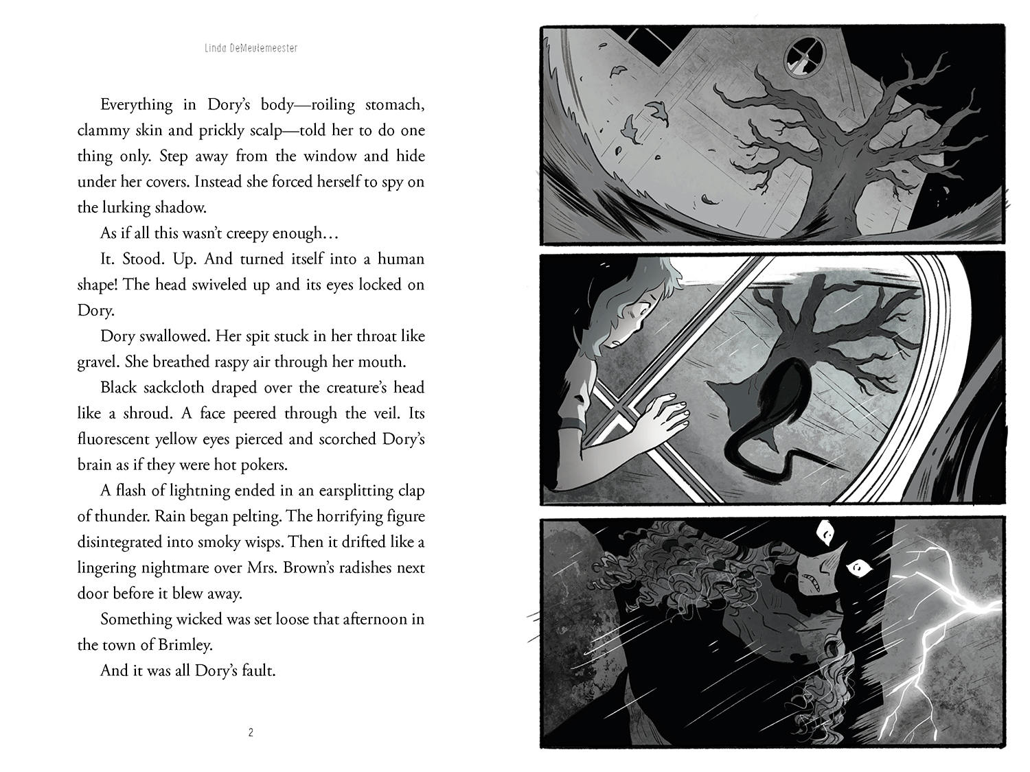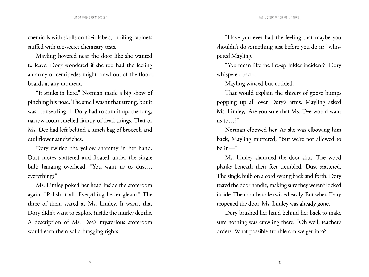 While the detention trio cleans the science storage room, Dory accidentally drops an old glass jug that shatters and a foul-smelling, snake-like shadow escapes. Dory tries to convince herself that it was some kind of strange gas and that what she saw was just a hallucination. But then she catches a glimpse of the eerie shadow in a neighbor’s garden, and soon garden vegetables, cats and even kids begin disappearing in her town. Only when she translates the broken bottle’s label does she understand what she has done: By dropping the old glass jug, she has released the most malevolent of evil witches. Putting the witch back into a bottle is the only solution—but what if there’s more than one witch loose in Brimley?
