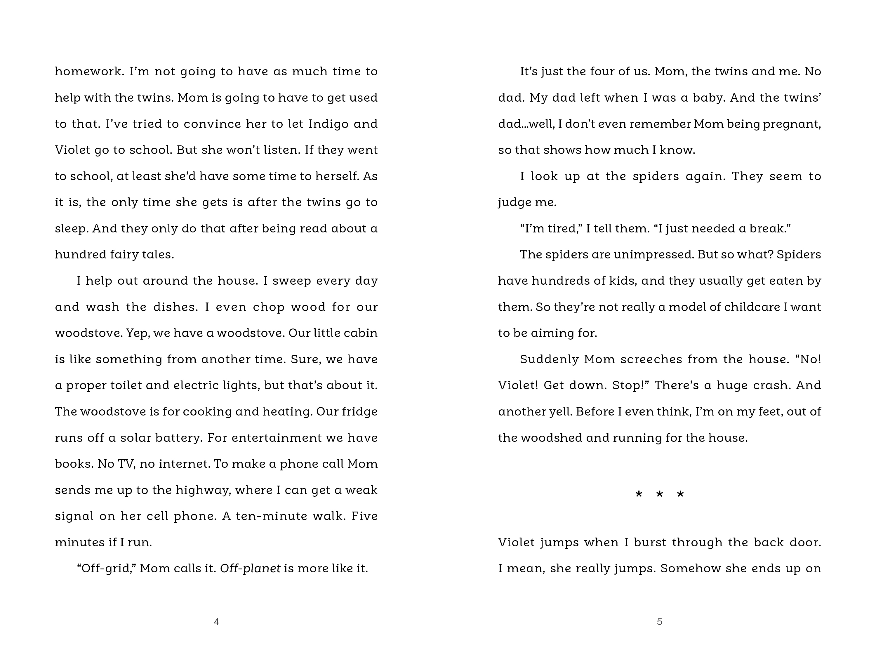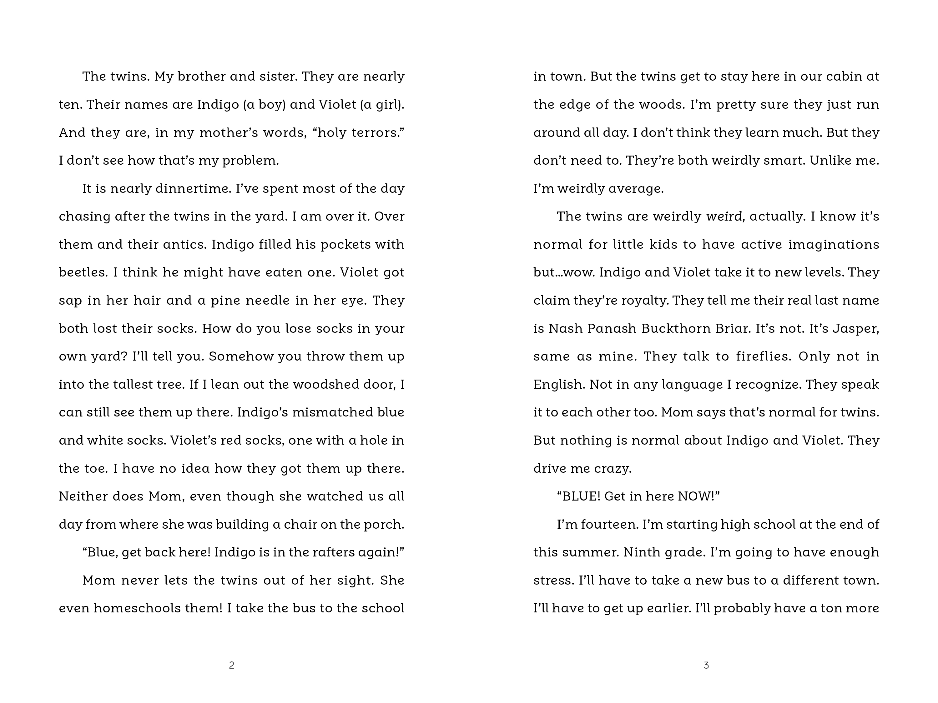 Fourteen-year-old Blue Jasper takes his younger siblings, twins Indigo and Violet, out for a hike to give their mother a break. One moment the twins are scampering in the trees right ahead of him, and the next moment they are gone. As Blue frantically searches for them, a strange woman appears in the forest claiming to be the Faerie Queen Olea of Nearwood and the twins’ real mother. Now because of a magical pact, Blue's mother's life will be in danger if he can't find the twins before the next sunset. Will he be able to find the twins in time? And will they be able to find their way out again?
